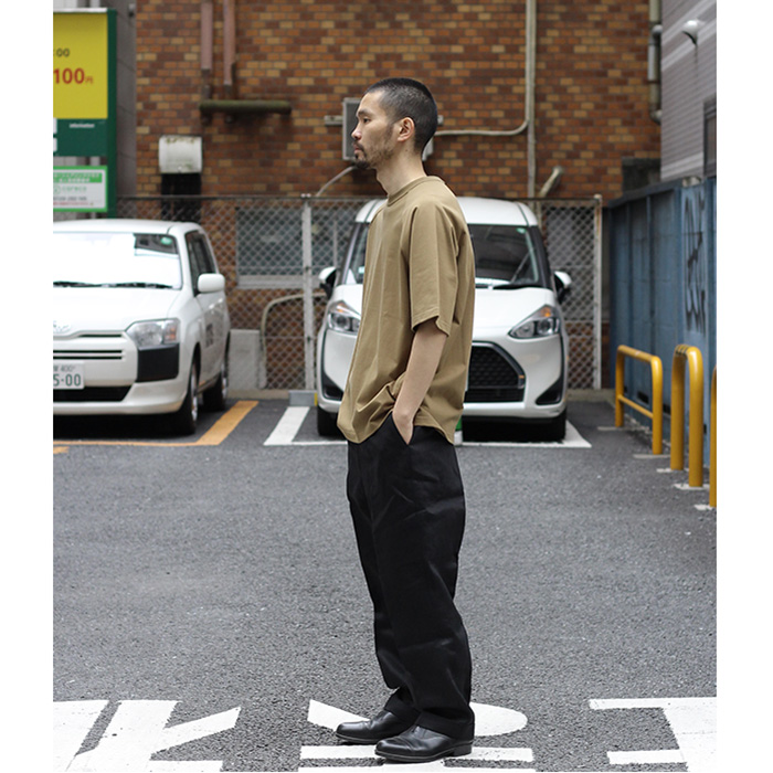 一見すると普通のTシャツですが、身頃の両サイドに、綾織のテープを張り付けた変形デザインのTシャツです。動きが出るように生地を丁寧に重ねて縫製してあるのがポイントです。
