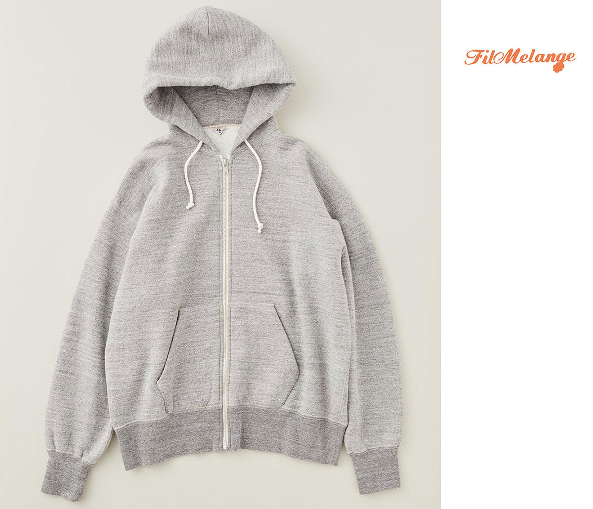 シンプルなフルジップパーカーのモデル。アウター使いも出来るアイテムです。