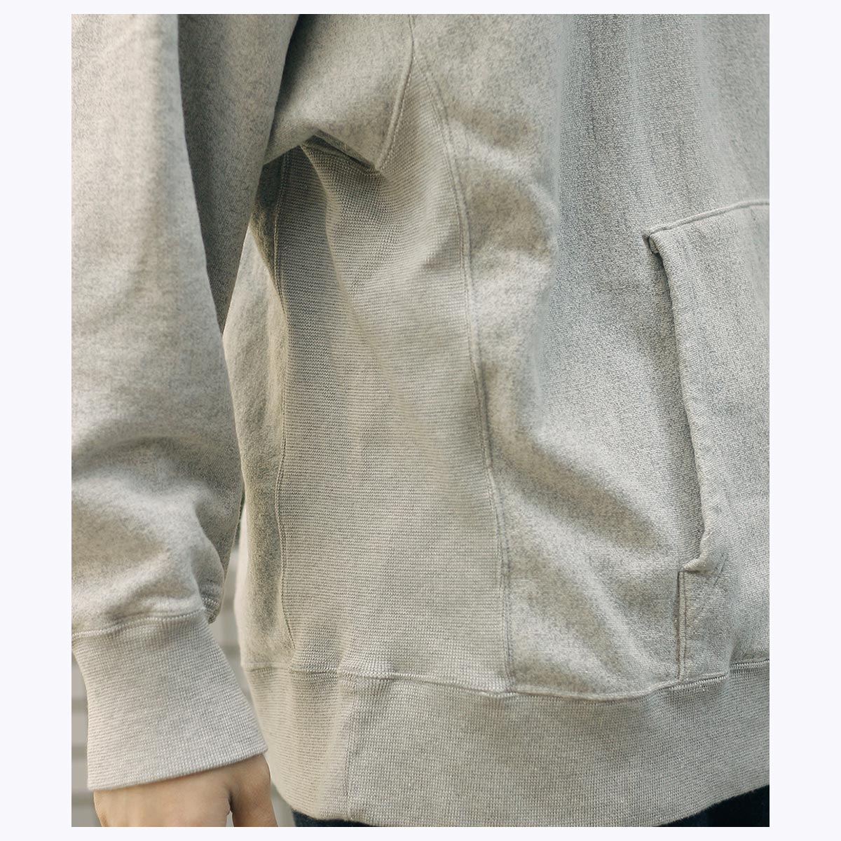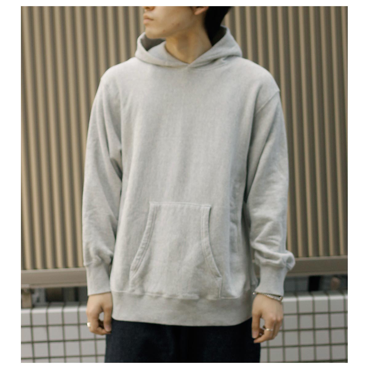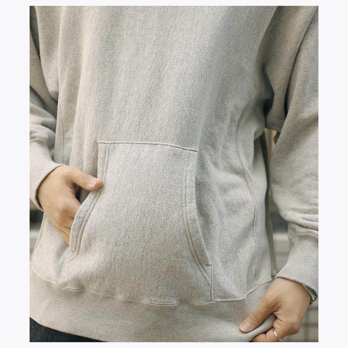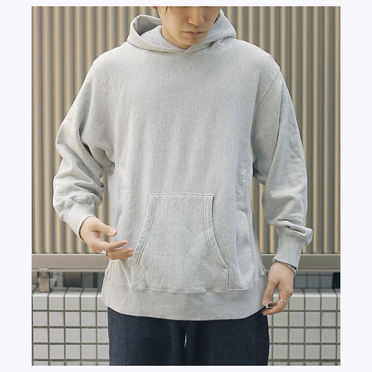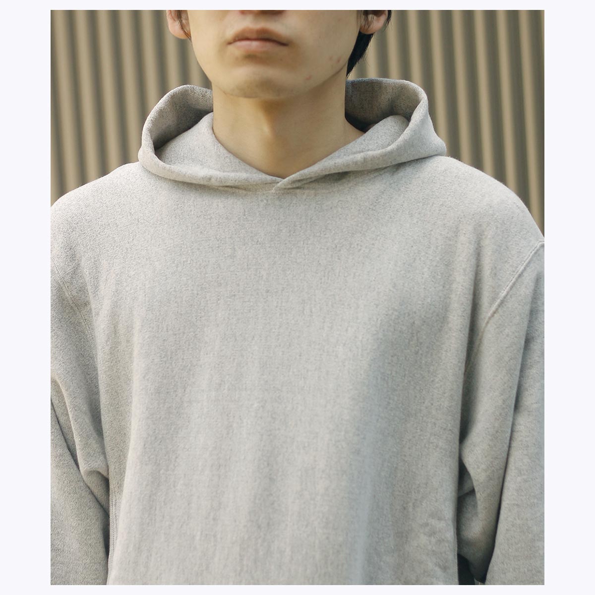 チャンピオンのリバースウィーブの中でも、たっぷりとしたシルエットと袖回りが特徴的な1980年代の個体をベースに作成したパーカー。身頃の生地は横使い、肩ハギなし、サイドに配したリブなどリバースウィーブらしいデザインを踏襲しています。裾や袖のリブもヴィンテージにならいしっかりとした巾を持たせた他、フードやポケットも当時の個体からトレー スした?振りのサイズ感です。 当時のリバースウィーブにならい、 2本針をベースに縫製しています。