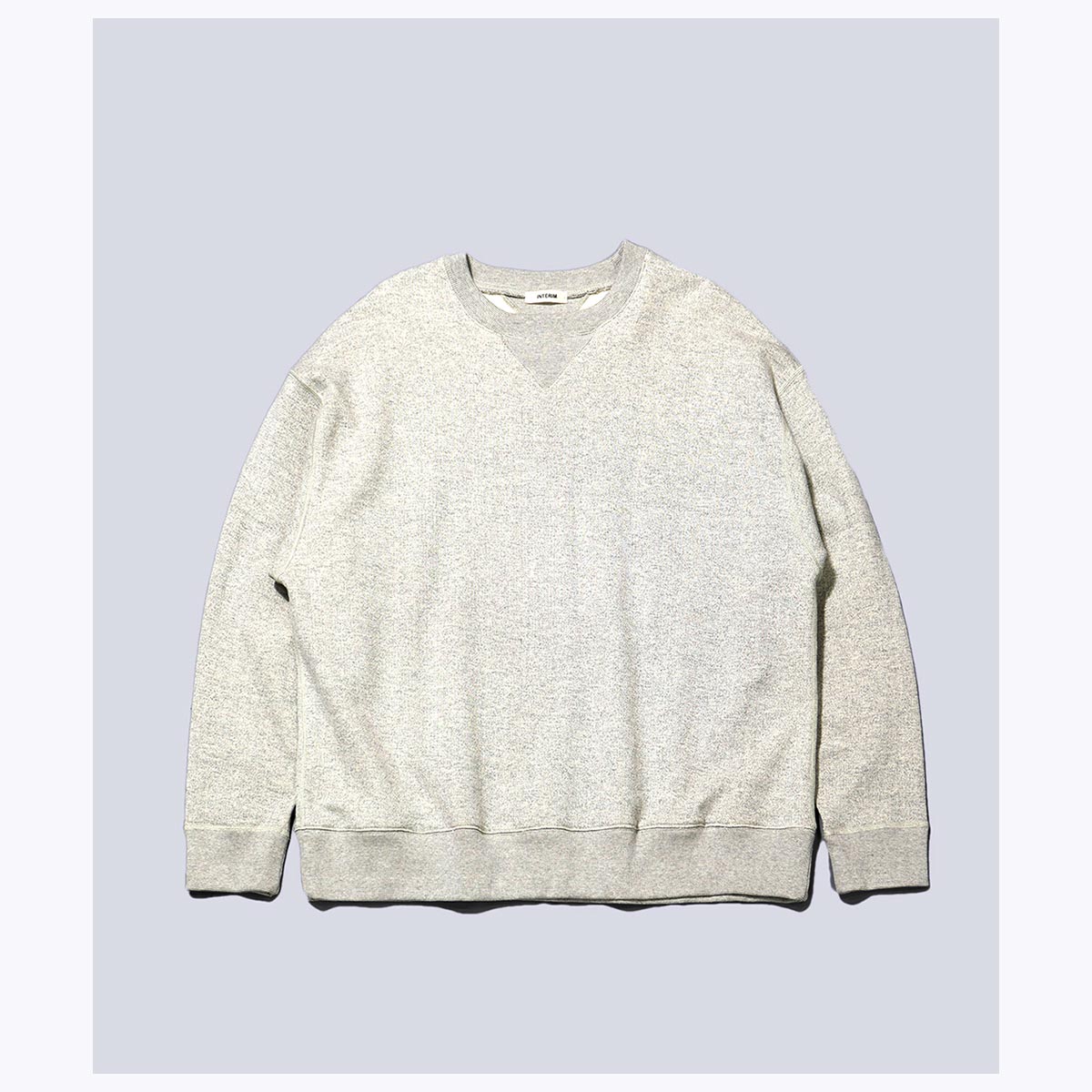 物理学者のアルベルト・アインシュタインが晩年に好んで着用していたスウェットから着想した、 両Vのスウェットシャツ。 着古して着丈が少々縮んだスウェットのバランス感をイメージし、特に身幅をたっぷりと取った他、裾や袖リブを長めに、ネックリブをやや太めに設定しています。 国内のメリヤス専業工場で、フラットシーマとオーバーロックを使い分けながら縫製しています。