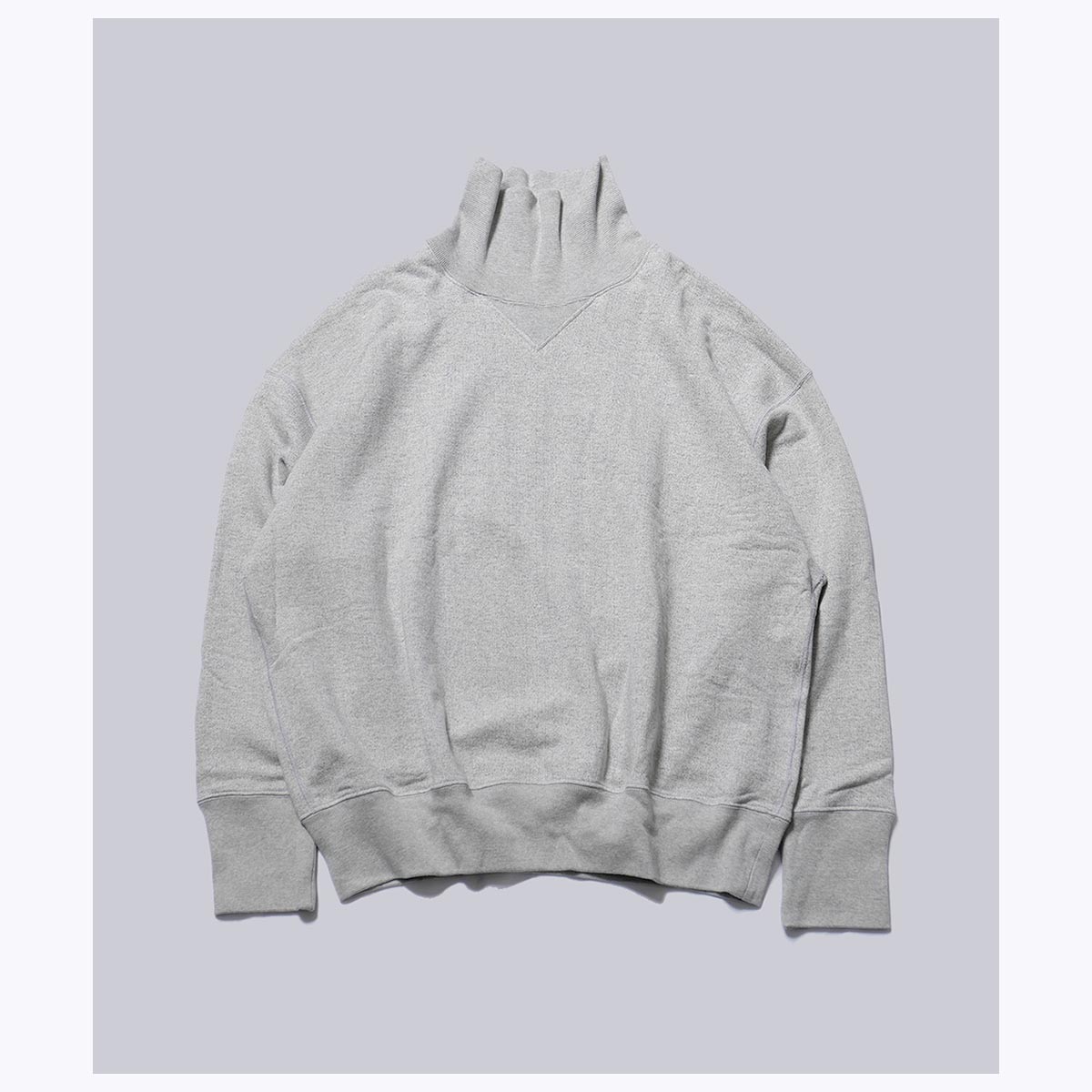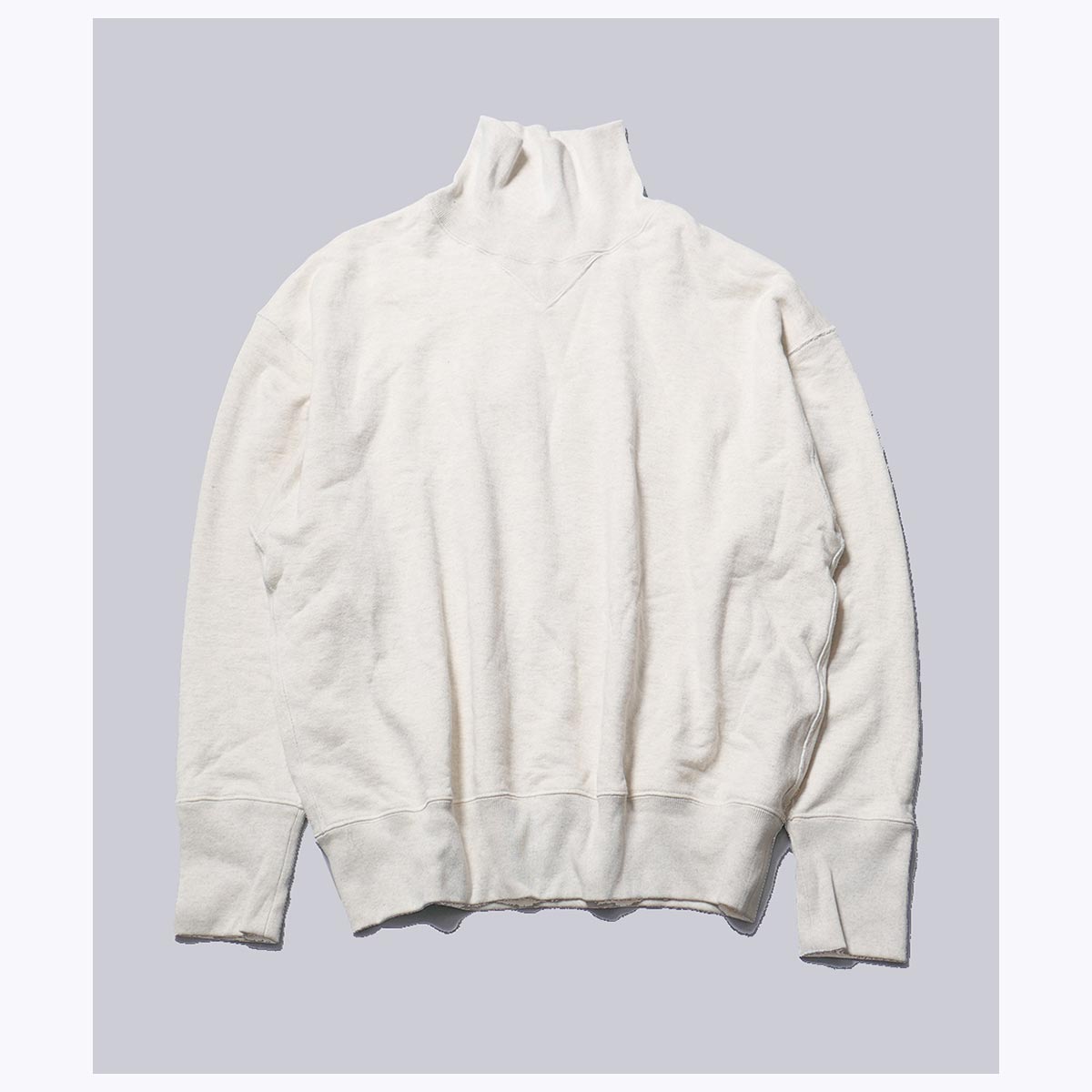 ハイネックスウェットシャツの原型は、1920年代 頃までスポーツシーンで着用されていたウール製ハイネックセーターにあります。1930年代には、 より吸水性に優れたコットン素材で代用されるようになり、日常にも取り入れやすいスウェットと して発展しました。本作はその当時のディテールを忠実に再現しつつ、現代的にアップデートした一着。前後の両Vガゼットや古い縫製仕様、倒し方向など、細部までヴィンテージの雰囲気を継承。 さらに、ハイネックに合わせて袖口と裾のリブも長めに設定し、クラシックな中にアクセントを加えています。