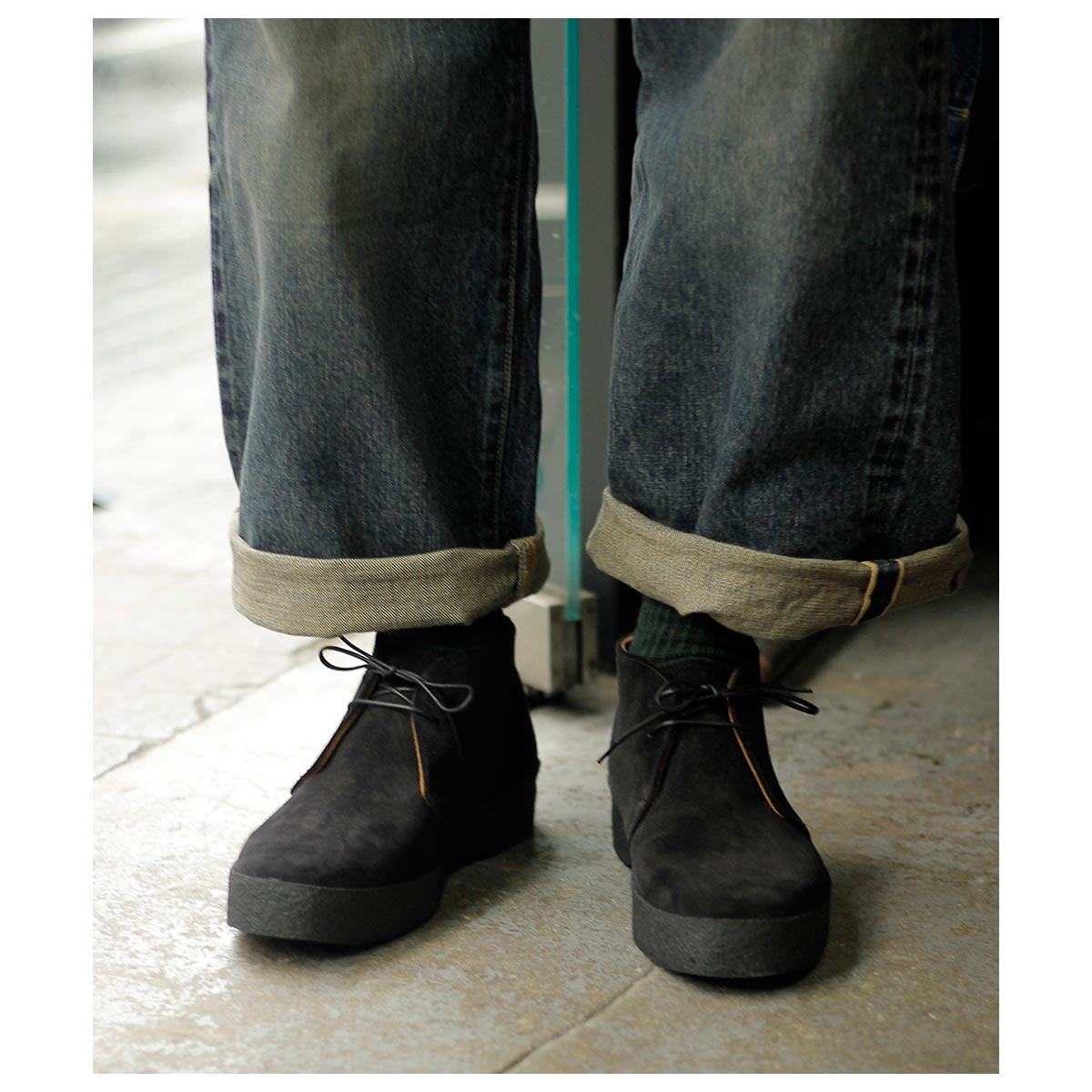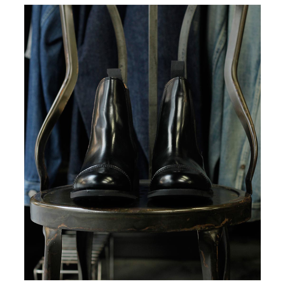 本モデルはキャップ部分にはアイコンともなっている、現在では希少となった3本針ミシンを使用した、別名ピューリタンステッチと呼ばれる、特徴的な3本のステッチラインが施されています。 履き口にはゴムが入り、履く時に便利なベルトが付きます。着脱のしやすさを考えながらも美しいフォルムにもこだわり、コバの張り出しと厚みを抑えた組み合わせは、武骨さを残しながら現代的で洗練されたスタイルです。