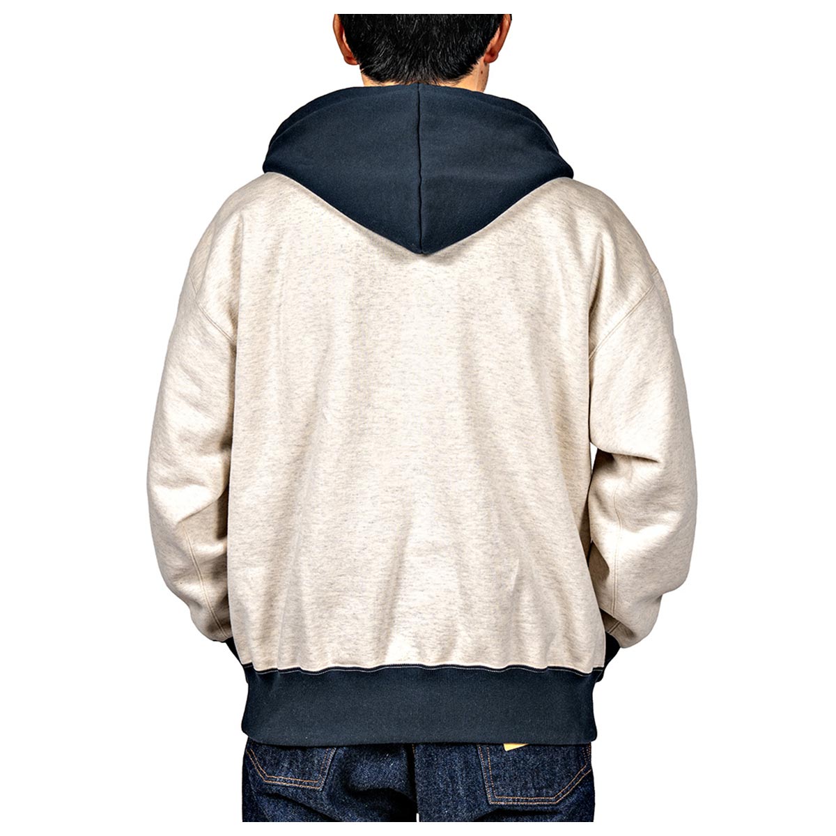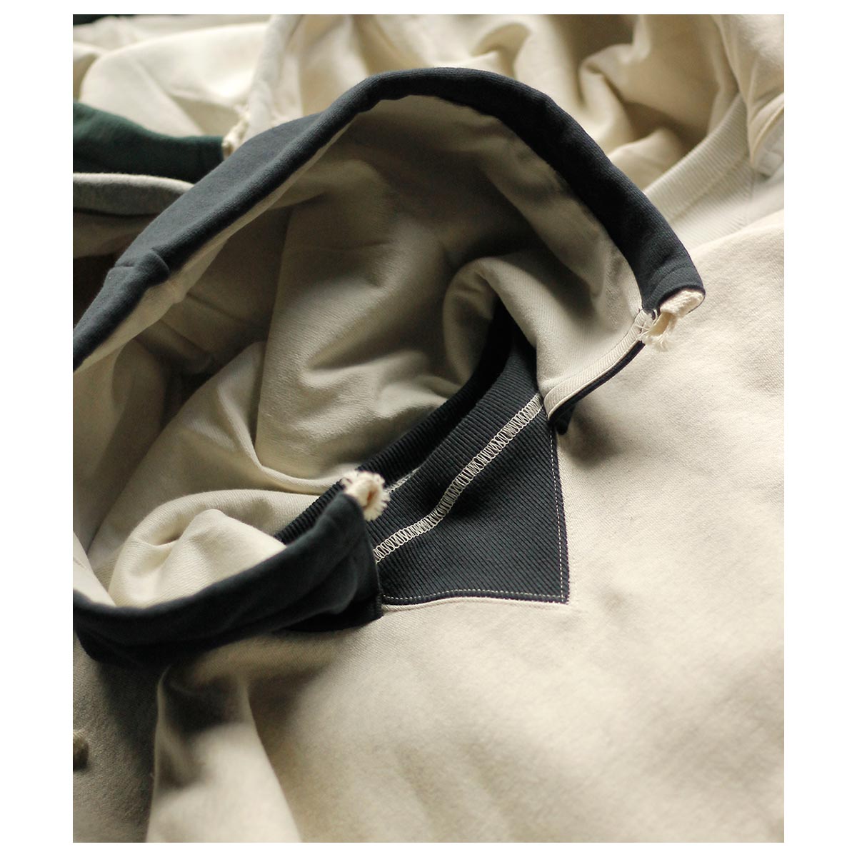 「後付け」と言いながらオリジナルはフードを襟に流し込んで途中でつけているものもありますが、WORKERS の後付けは本当に「後付け」。 先にクルーネックのボディを作ってから最後にフードをつけます。 フードの裏は切り替えにしてボディの裏毛よりは薄いT シャツ生地。 ビンテージを色々見ていたら発見した仕様。おそらく、フード裏までボディと同じ裏毛だと厚みがありすぎて洗濯したと き本当に乾きが悪い。そのあたりを解消するためにフード裏だけは別生地にしたのだと想像しています。