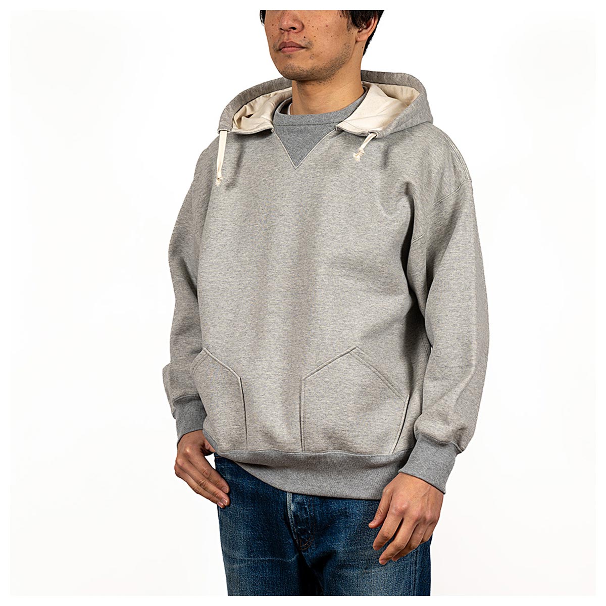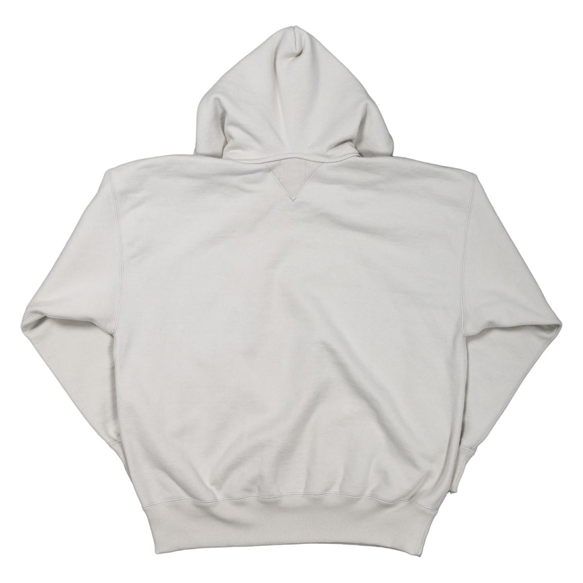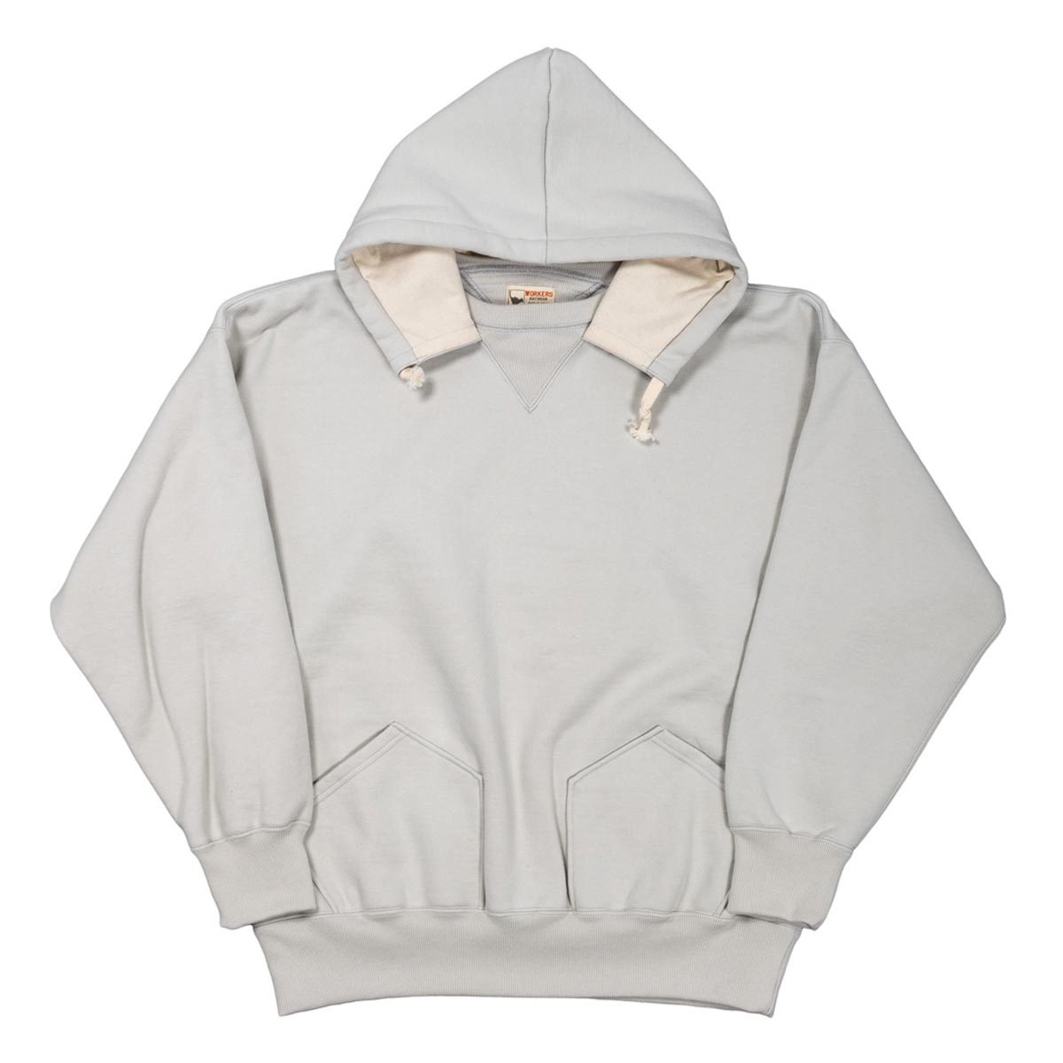 「後付け」と言いながらオリジナルはフードを襟に流し込んで途中でつけているものもありますが、WORKERS の後付けは本当に「後付け」。 先にクルーネックのボディを作ってから最後にフードをつけます。 フードの裏は切り替えにしてボディの裏毛よりは薄いT シャツ生地。 ビンテージを色々見ていたら発見した仕様。おそらく、フード裏までボディと同じ裏毛だと厚みがありすぎて洗濯したと き本当に乾きが悪い。そのあたりを解消するためにフード裏だけは別生地にしたのだと想像しています。