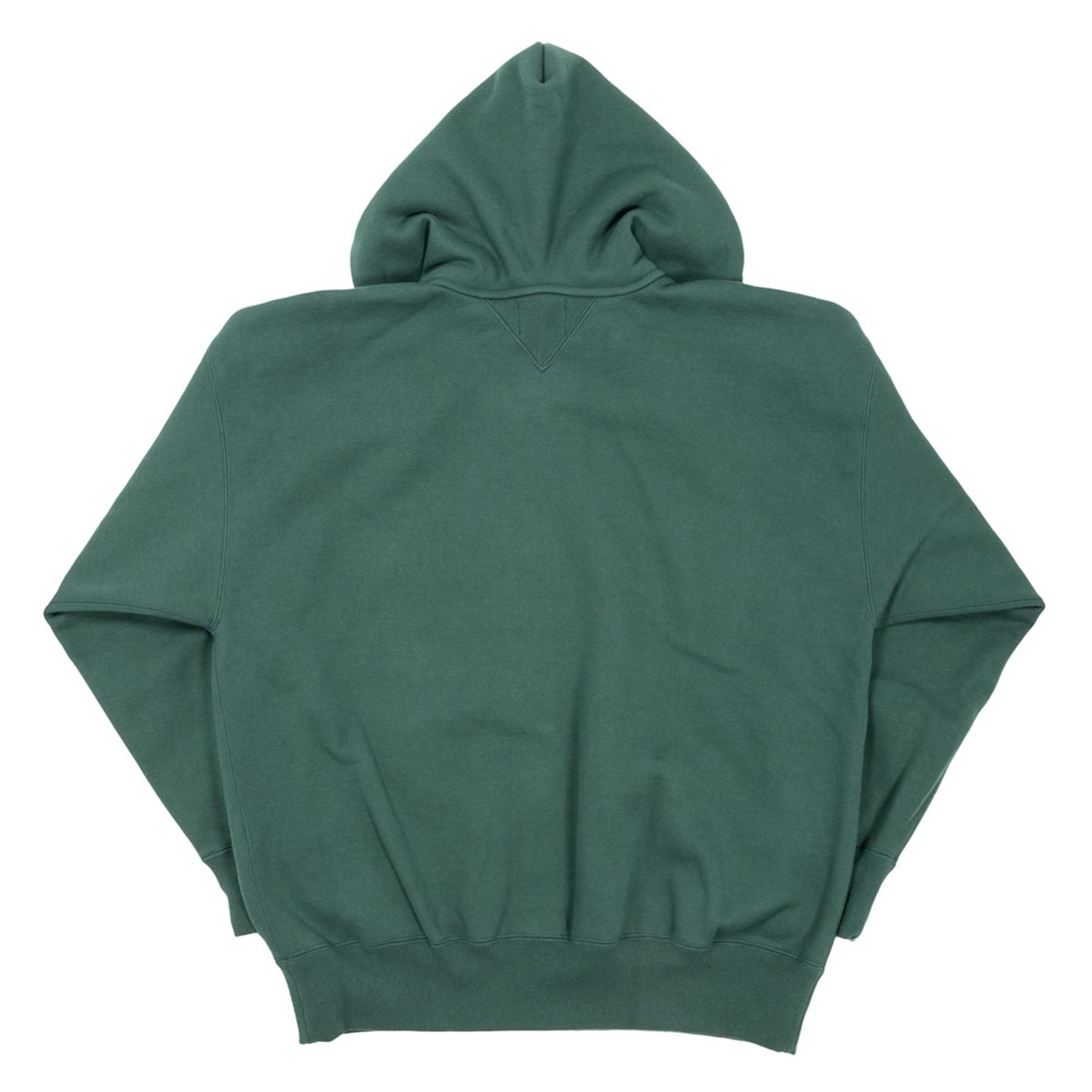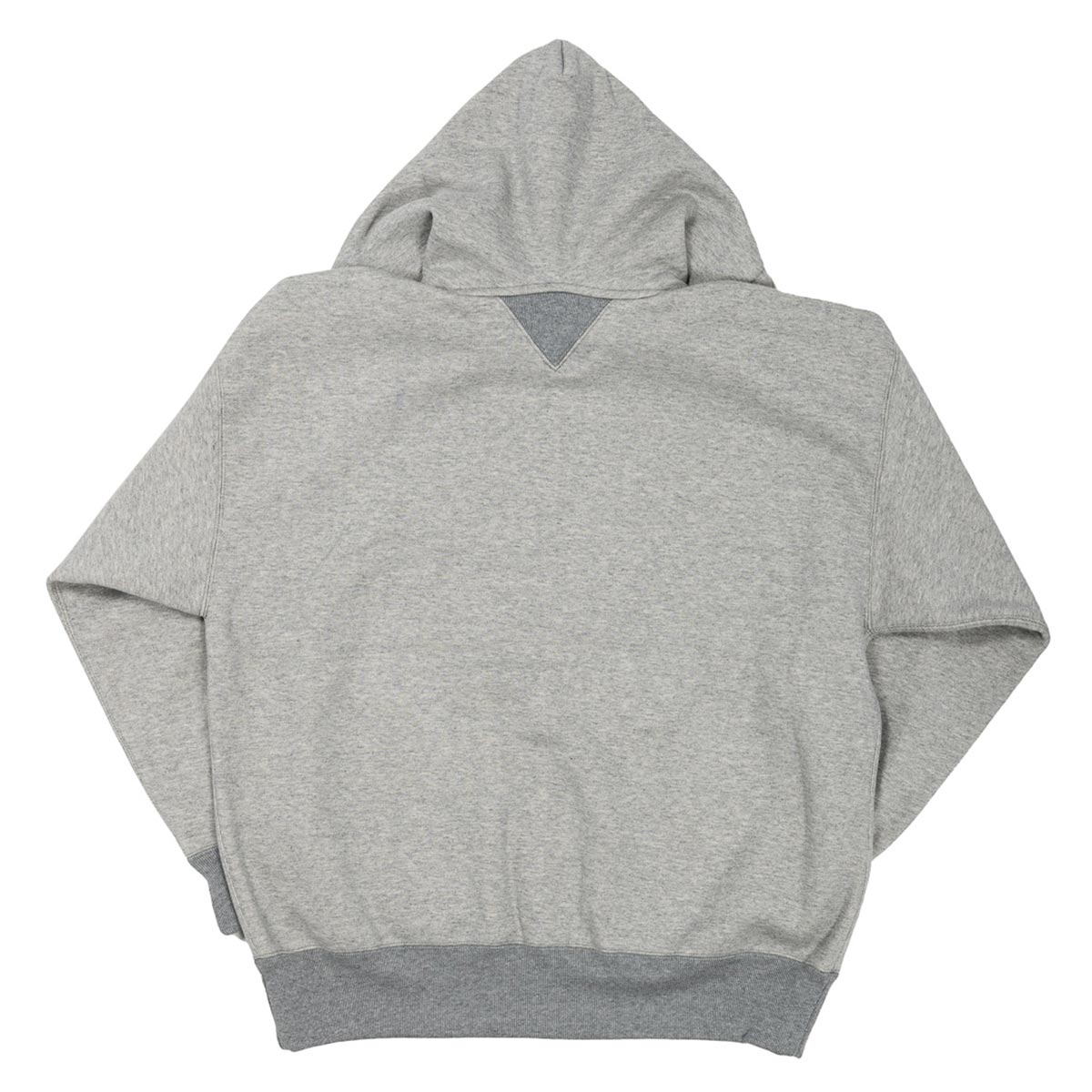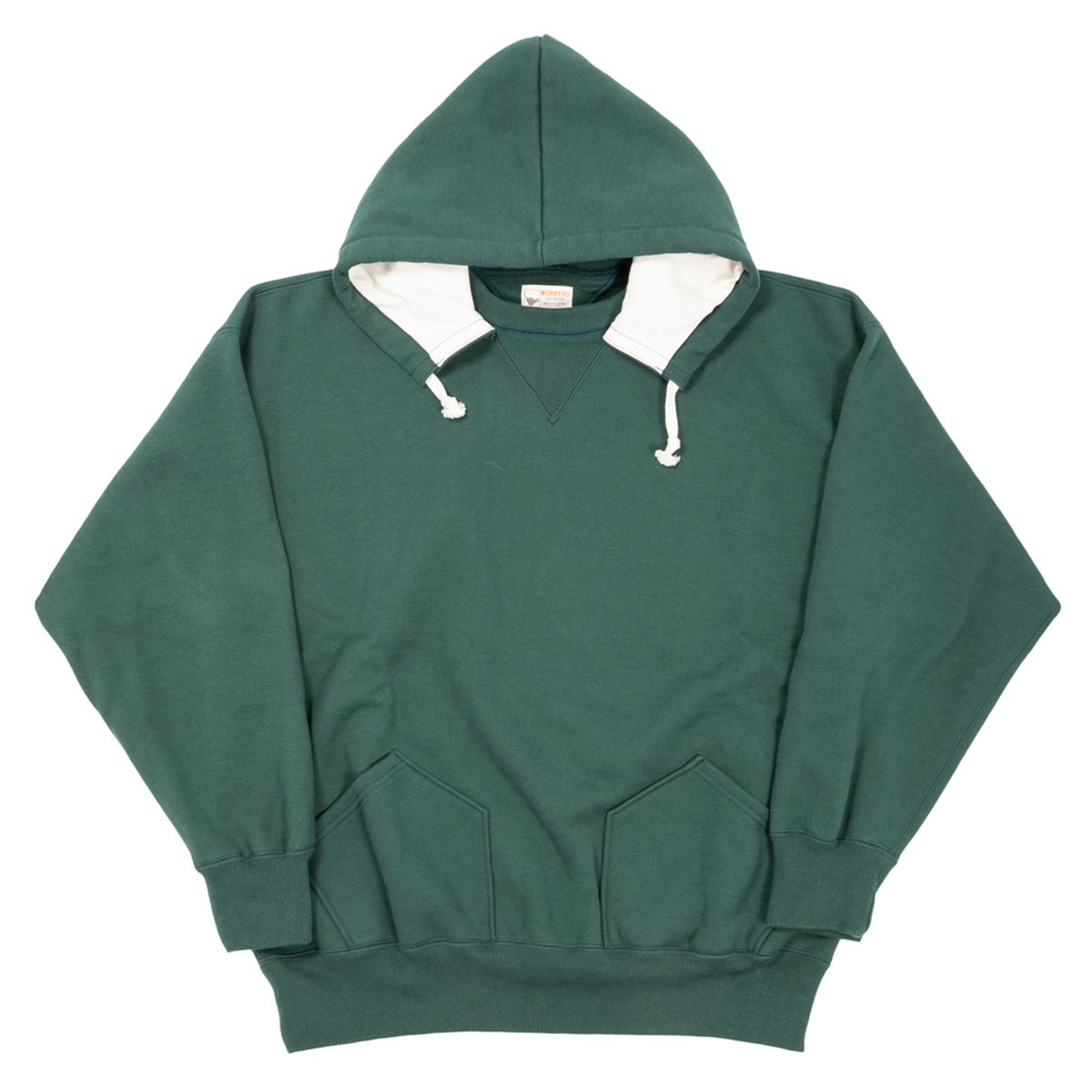 「後付け」と言いながらオリジナルはフードを襟に流し込んで途中でつけているものもありますが、WORKERS の後付けは本当に「後付け」。 先にクルーネックのボディを作ってから最後にフードをつけます。 フードの裏は切り替えにしてボディの裏毛よりは薄いT シャツ生地。 ビンテージを色々見ていたら発見した仕様。おそらく、フード裏までボディと同じ裏毛だと厚みがありすぎて洗濯したと き本当に乾きが悪い。そのあたりを解消するためにフード裏だけは別生地にしたのだと想像しています。