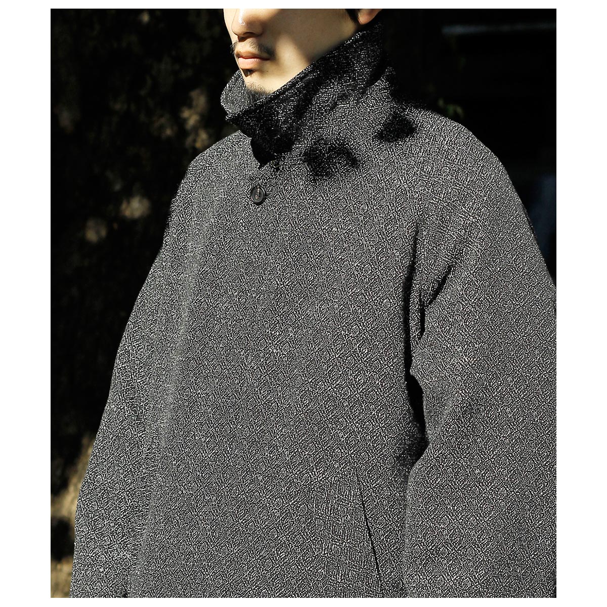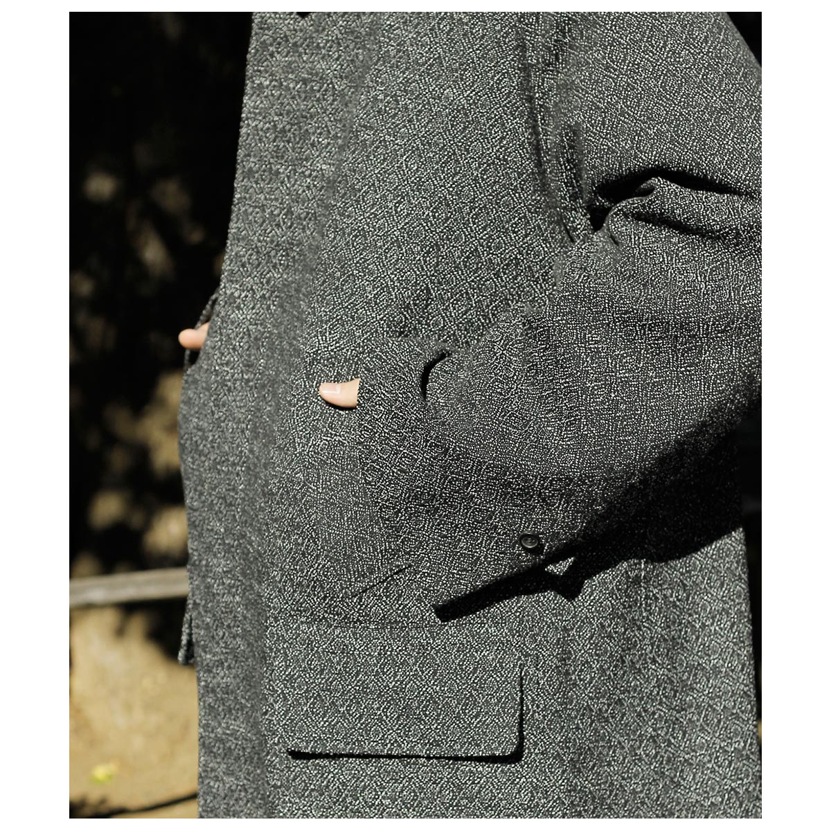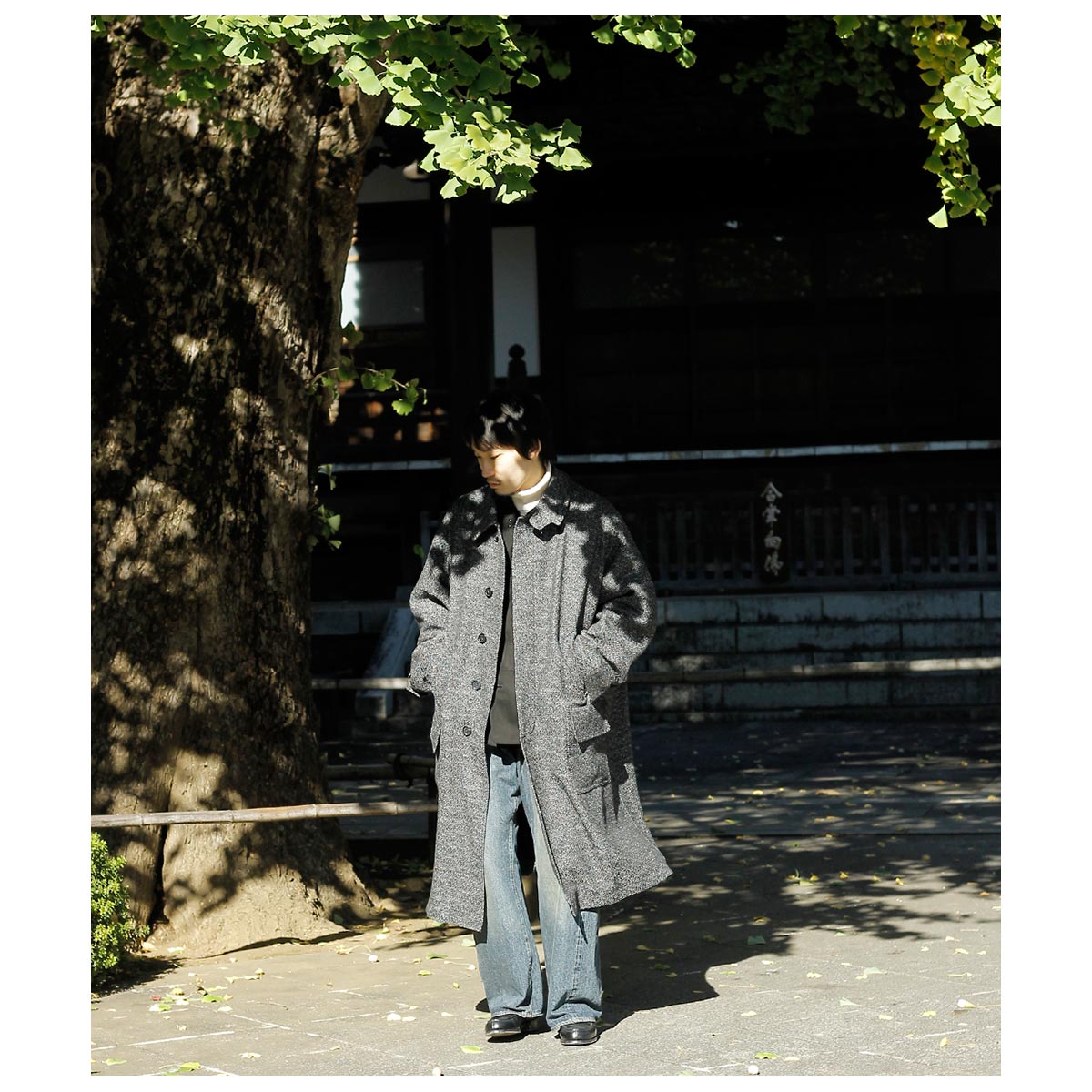 身幅・着丈ともにたっぷりと寸法を取りつつ、Aラインを強調したシルエットのシングルラグランコートをベースに、ハンドウォームポケットの位置を大きく上げ、その下にフラップ付きの大型パッチポケットを付けました。 衿に配したチンストラップは内側に折り込んでボタンでとめることで収納も可能です。