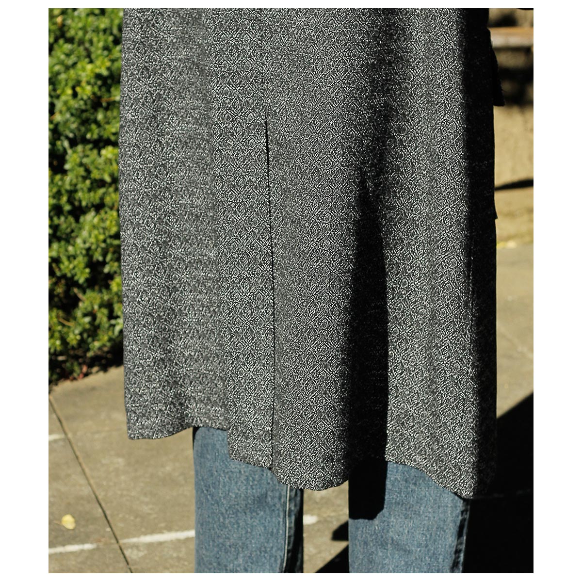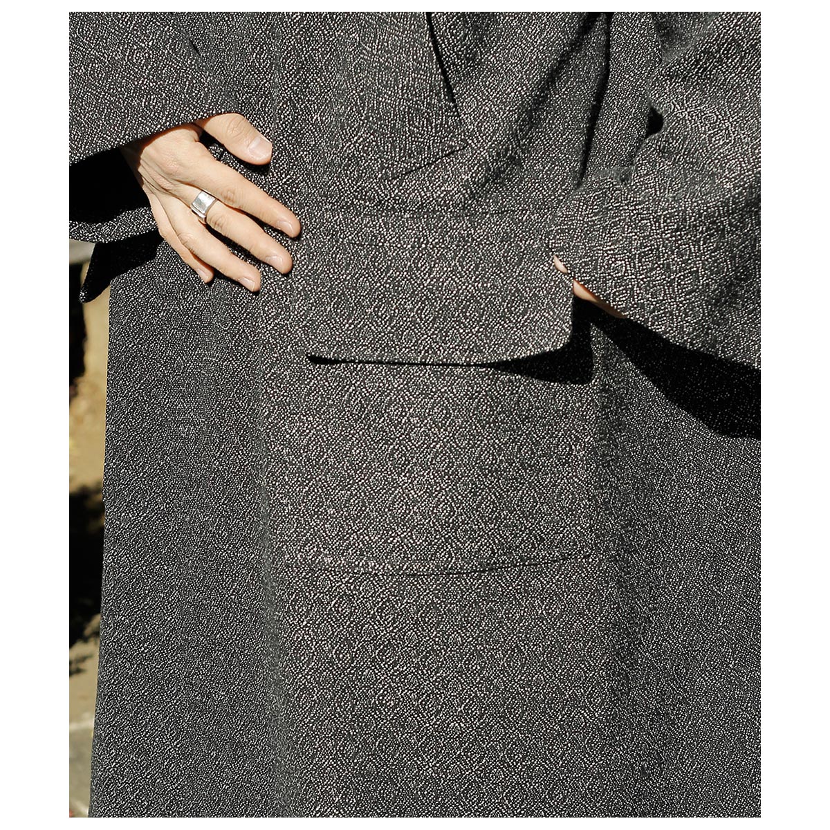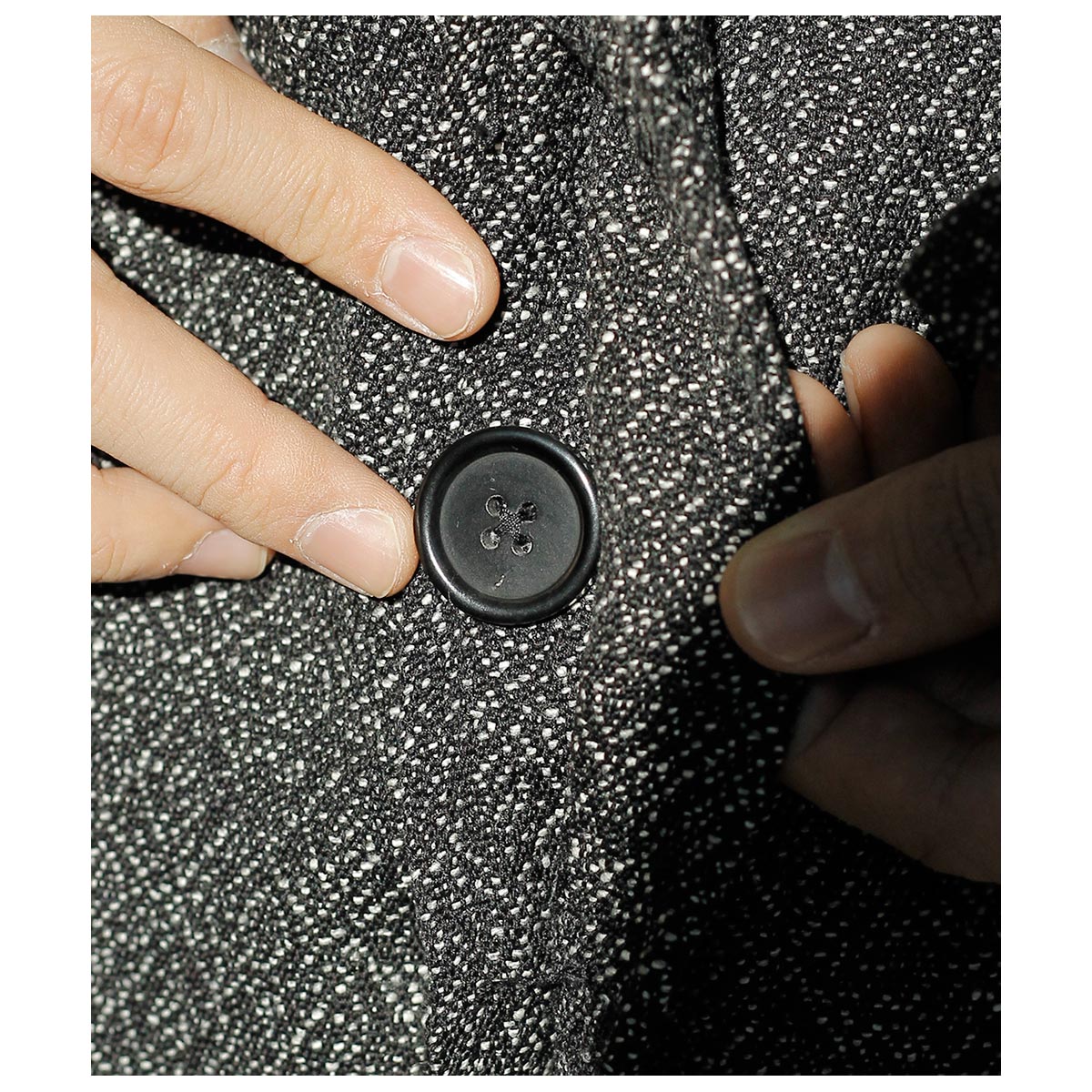 仏LVMHのデッドストックコレクションからピッ クしたウール×コットン主体のジャカードツイー ド。 ブラック、グレー、ホワイトの比較的太番手の糸でざっくりとジャカードに織り上げました。イタリア製の生地らしく、ツイードとはいえ毛羽感はほぼないドライな表面感で、都会的な印象に仕上がっています。