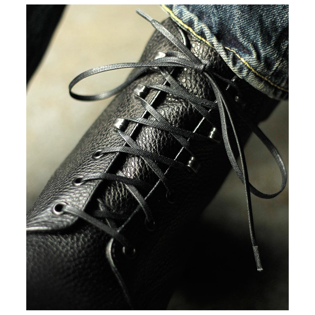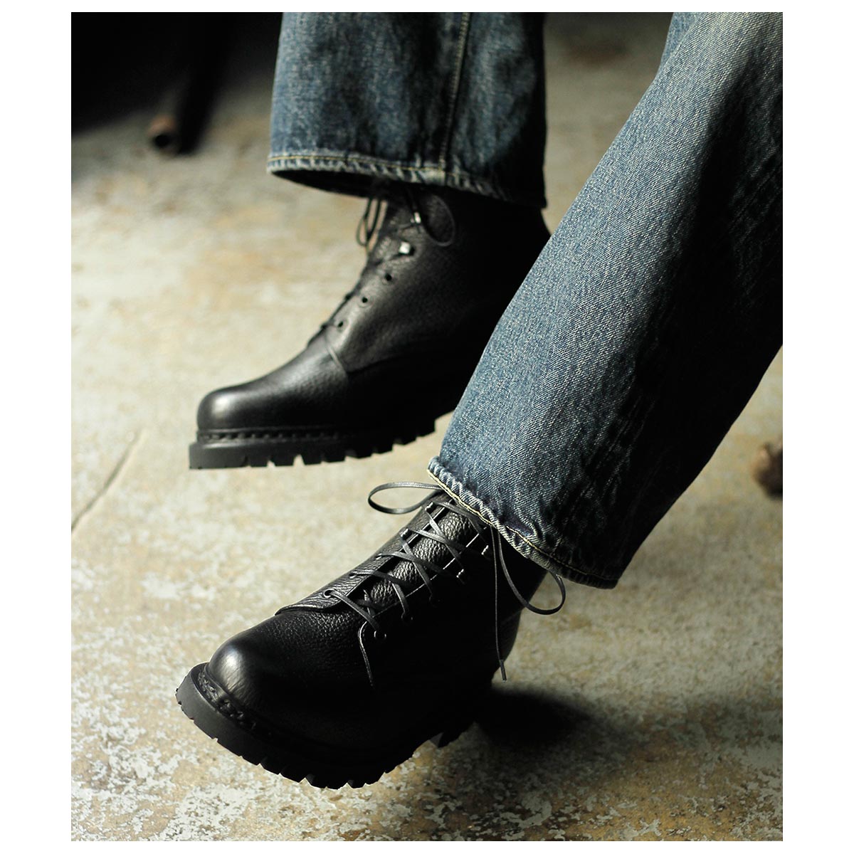 本モデルはキャップ部分にはアイコンともなっている、現在では希少となった3本針ミシンを使用した、別名ピューリタンステッチと呼ばれる、特徴的な3本のステッチラインが施されています。 履き口にはゴムが入り、履く時に便利なベルトが付きます。着脱のしやすさを考えながらも美しいフォルムにもこだわり、コバの張り出しと厚みを抑えた組み合わせは、武骨さを残しながら現代的で洗練されたスタイルです。