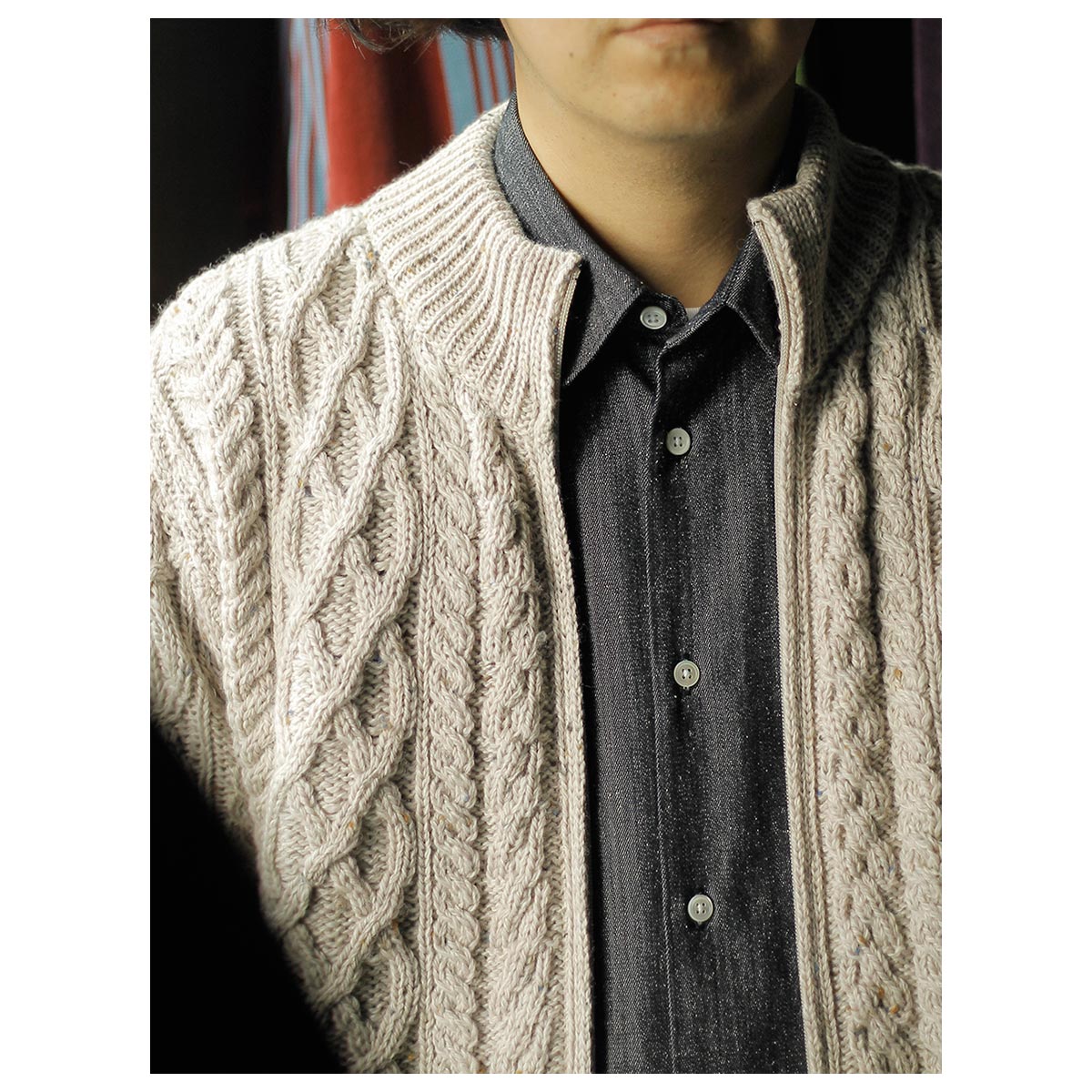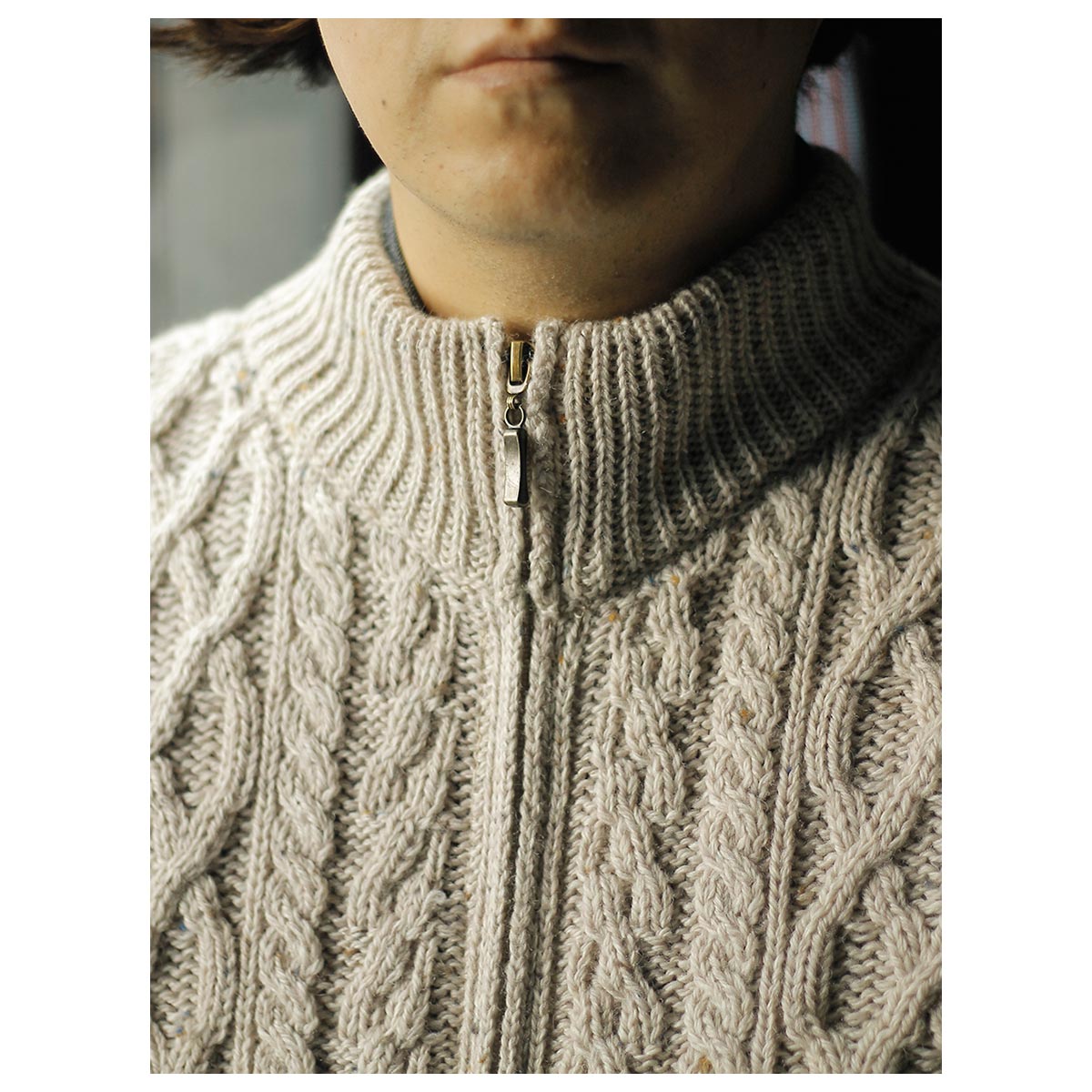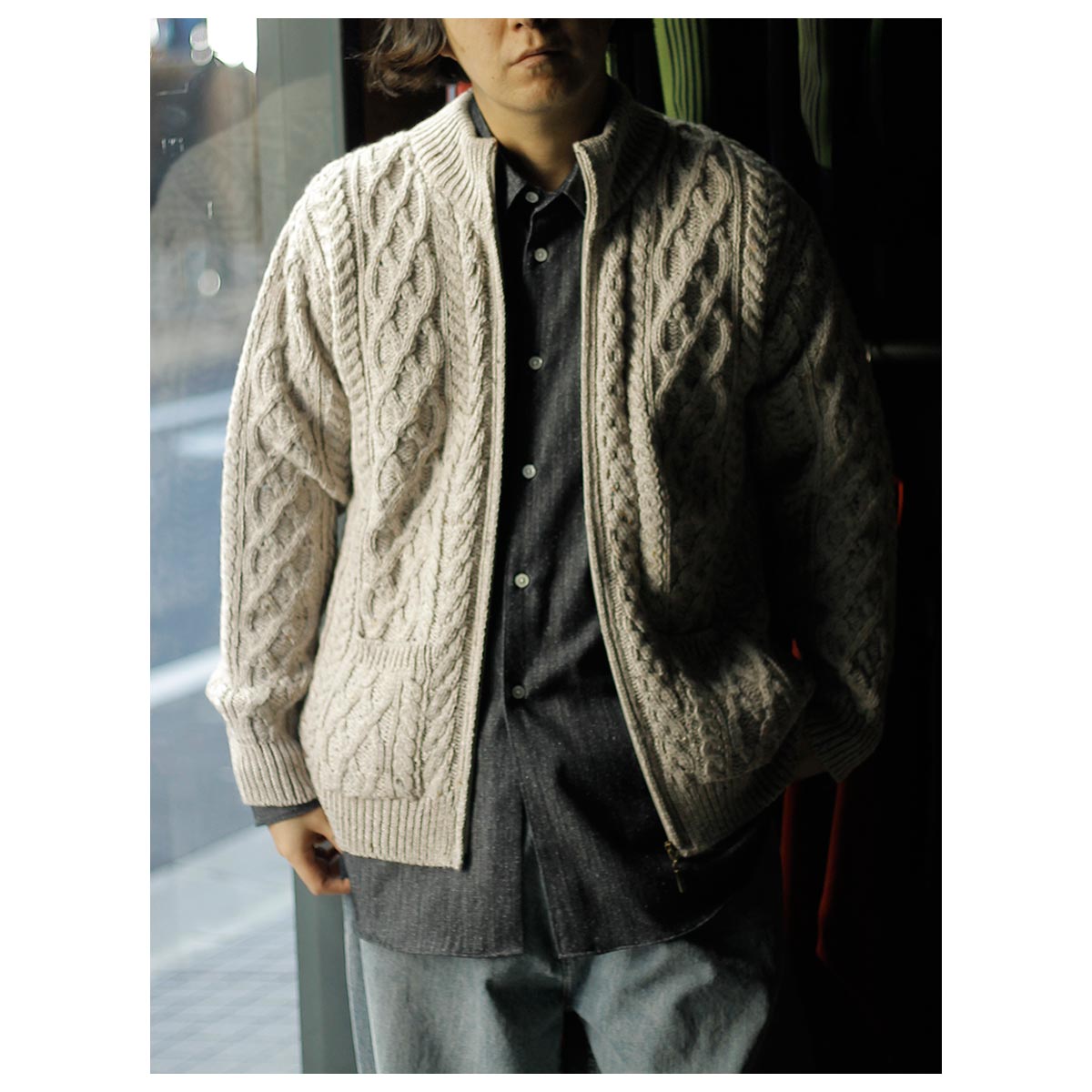 フィッシャーマンの力強い編み柄をベースに、ジップアップという実用的な形に落とし込んだモデル。