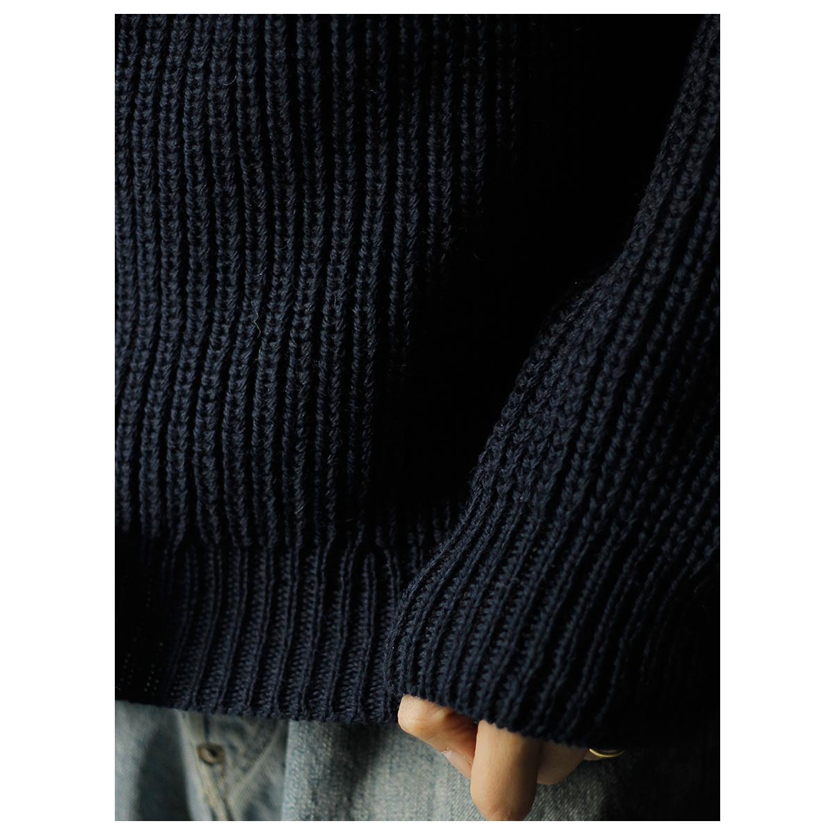 首元・袖口・裾はすべてロール(カール)編みで仕上げられていて、リブで締めないことで、ニット本来の自然な落ち感と柔らかさが引き立ちます。どこか肩の力が抜けた佇まいがあり、気負わず着られる一枚です。特徴的なカールネックは、首に軽く沿う程度の高さ。タートルほど主張せず、クルーよりも表情があり、シャツやカットソーを重ねても収まりが良い。