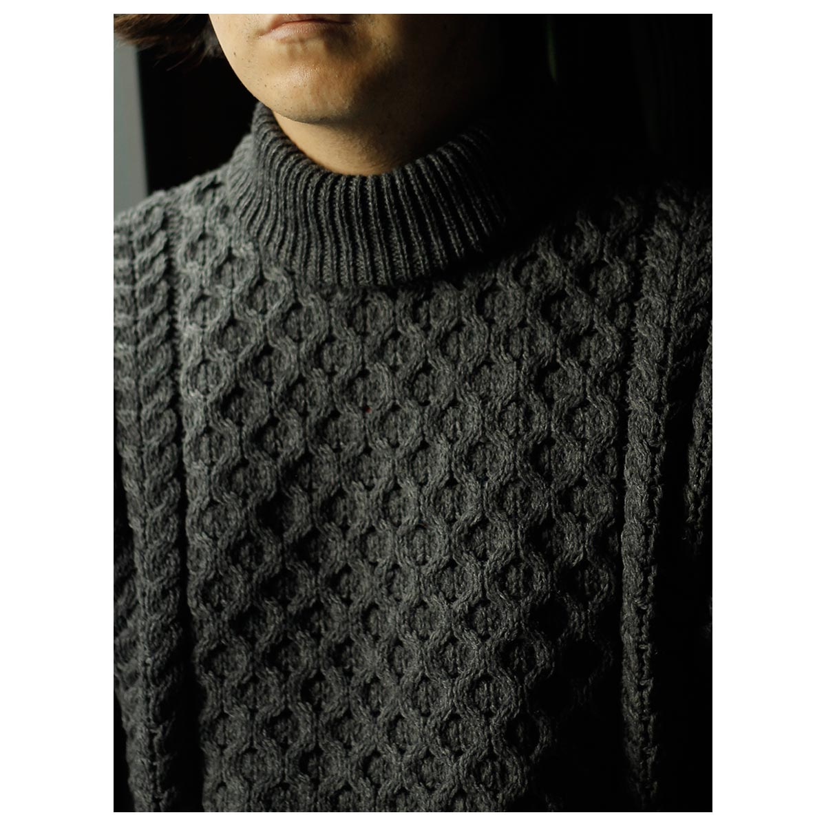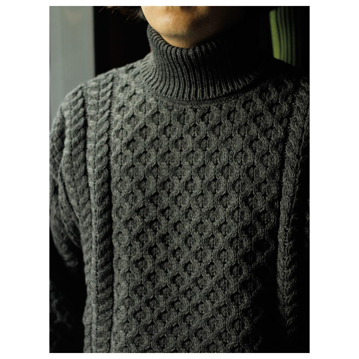 同じアラン編みでも、タートルネックになると印象はガラッと変わります。