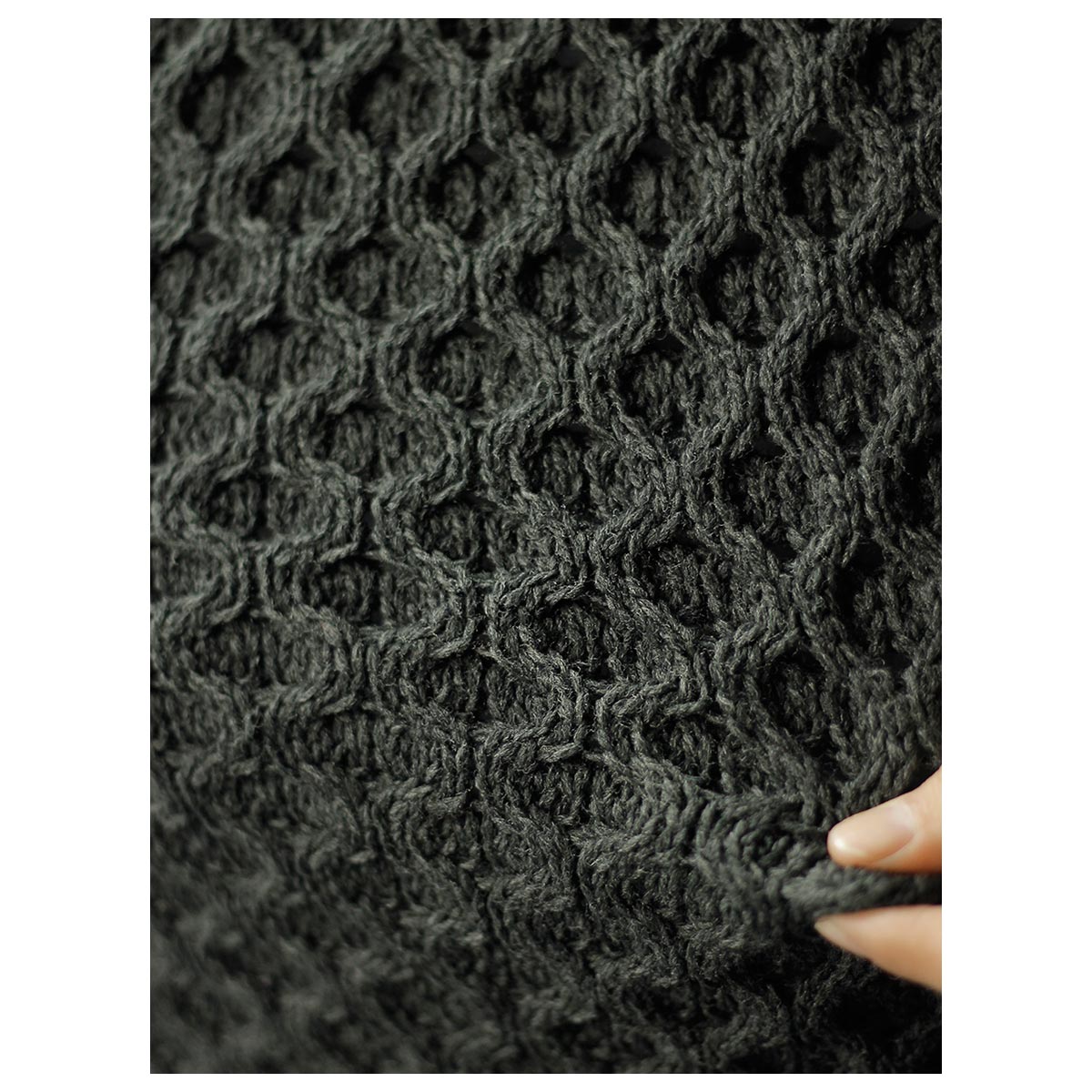 アランニットにみられる立体的なケーブルや編み柄を丁寧に再現し、過度な主張もないので、
