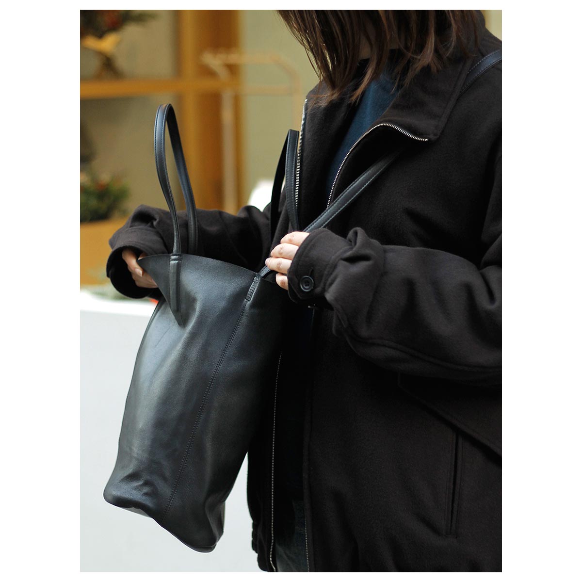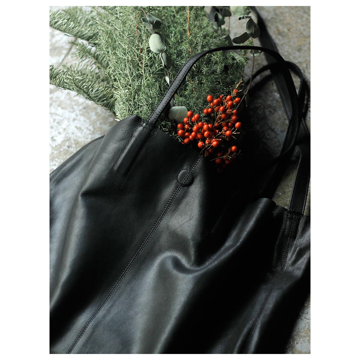 ゴートレザー(山羊革)を使用しており、非常に軽く、丈夫で型崩れしにくいのが最大の特徴。肌ざわりは非常にソフトですが耐久性が高く、繊維密度もシープ革、牛革よりも密度が高くて丈夫です。 使えば使うほど柔らかく、しなやかになる特性を持っているので「経年変化」や「エイジング」も楽しんでいただくことが出来ます。 老若男女問わず使える非常にシンプルなデザイン。極力金具を使用せず(内側にあるDカンのみ)、開閉はマグネット式。様々なスタイルにハマる万能なレザーバッグです。