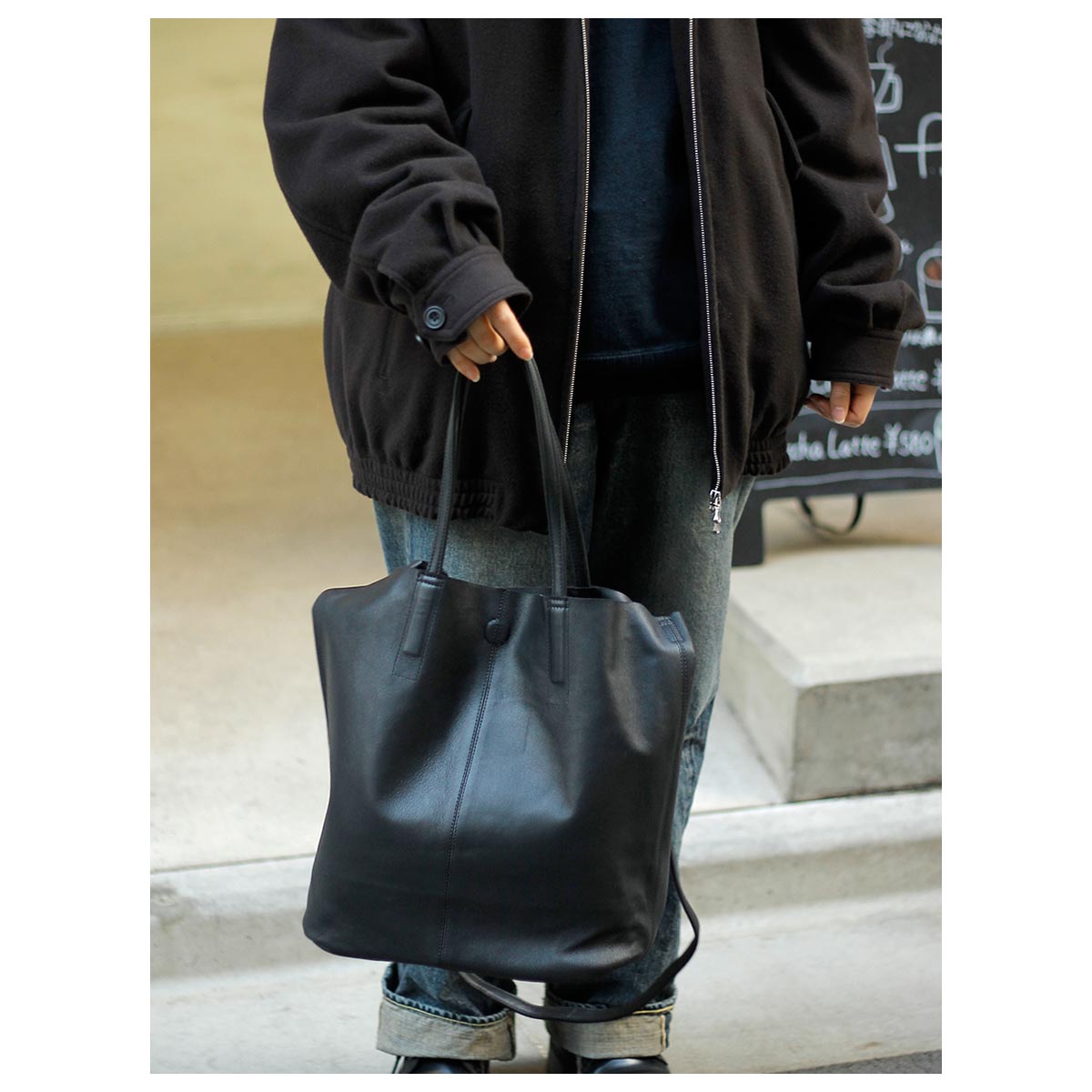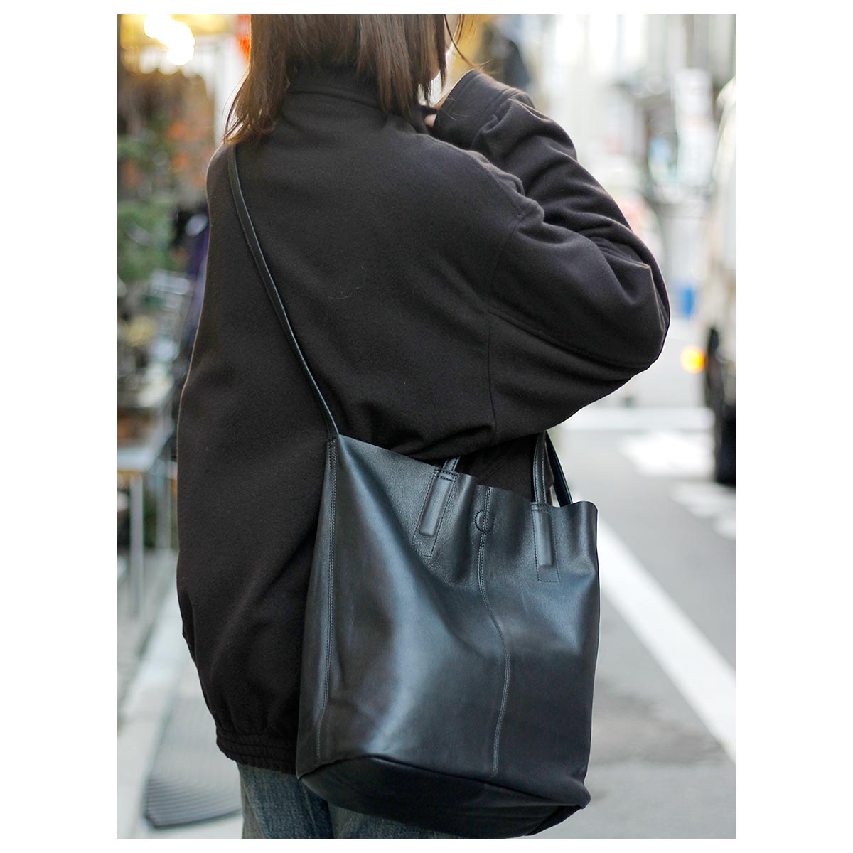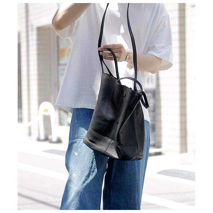 老若男女問わず使える非常にシンプルなデザイン。極力金具を使用せず(内側にあるDカンのみ)、開閉はマグネット式。様々なスタイルにハマる万能なレザーバッグです。