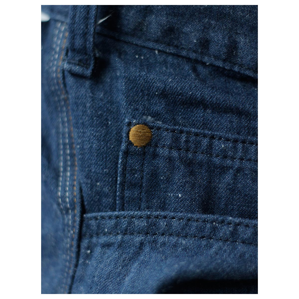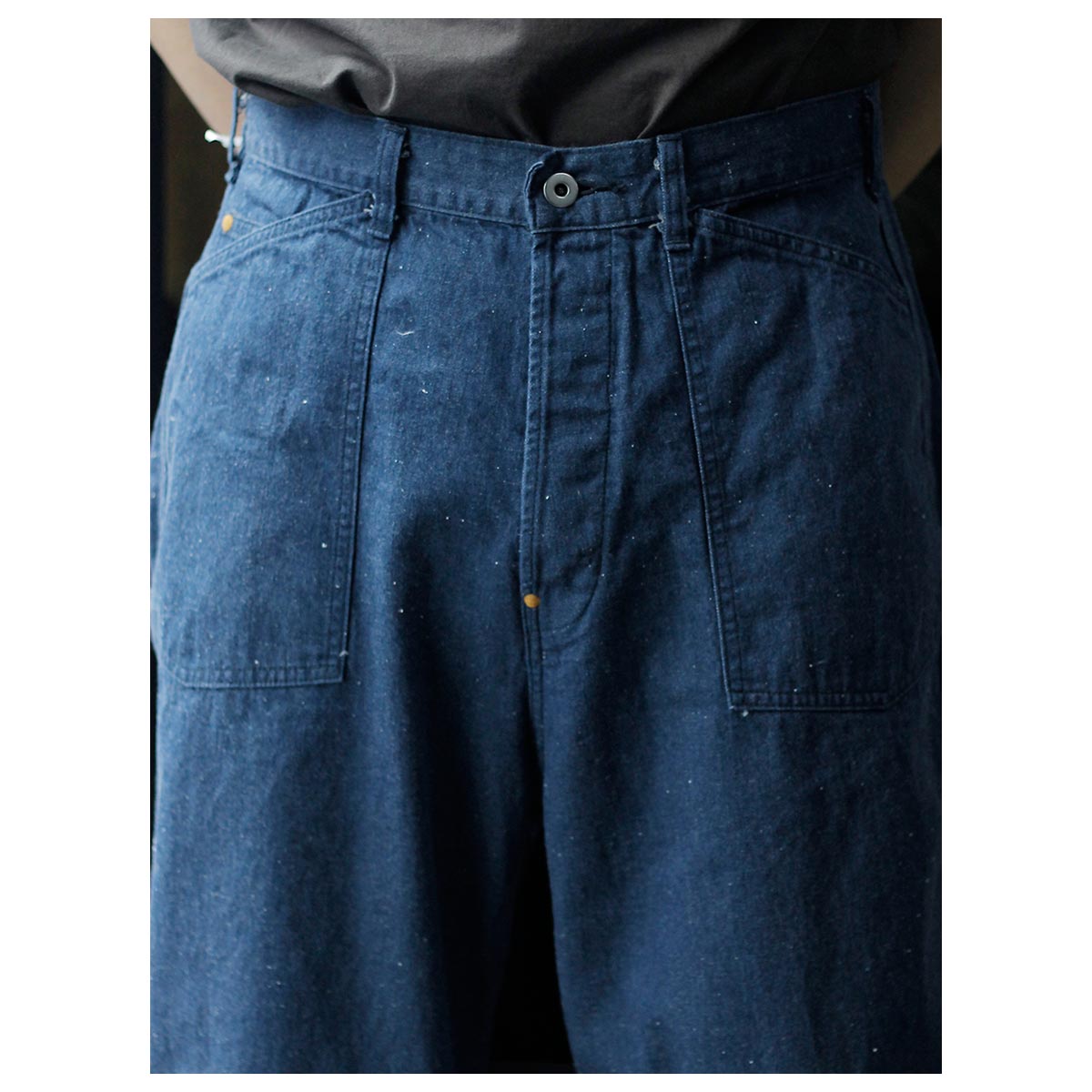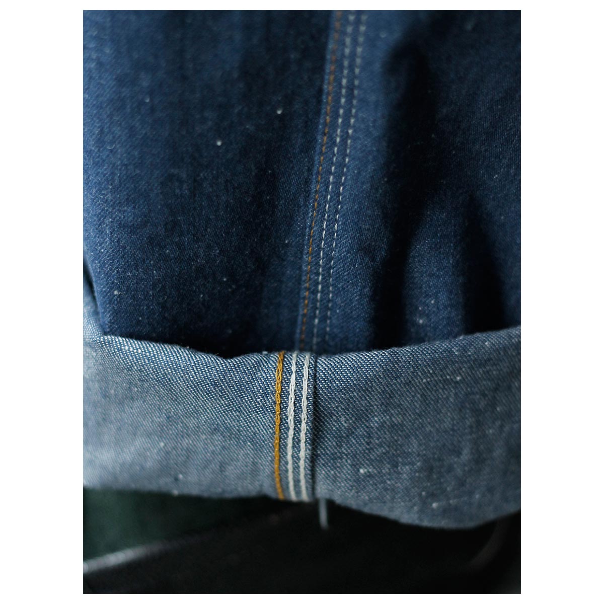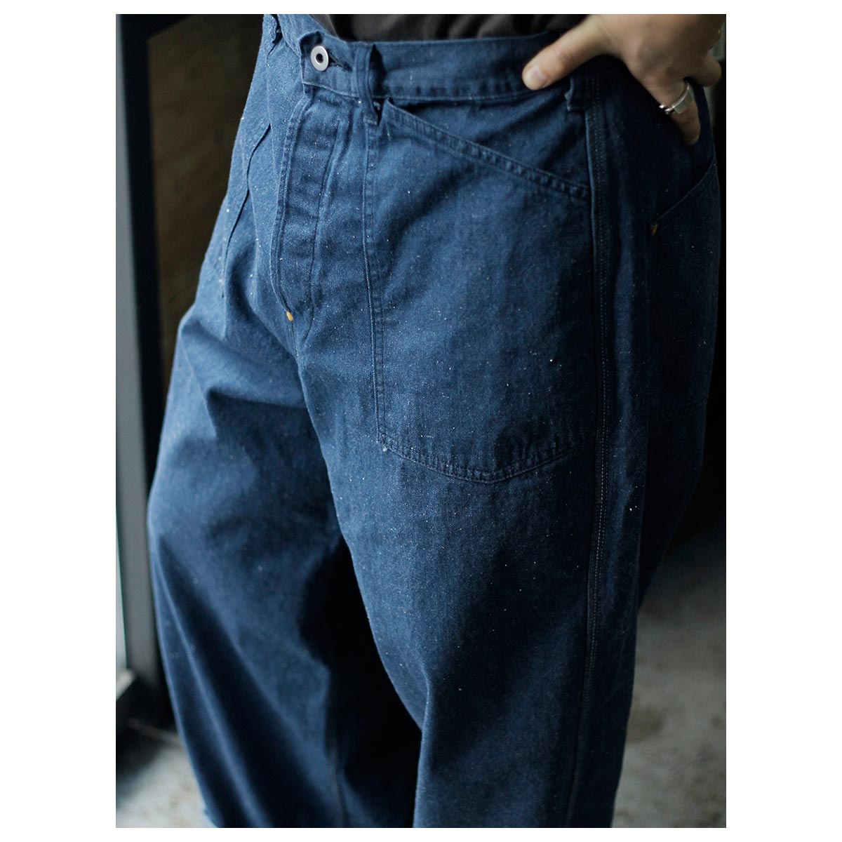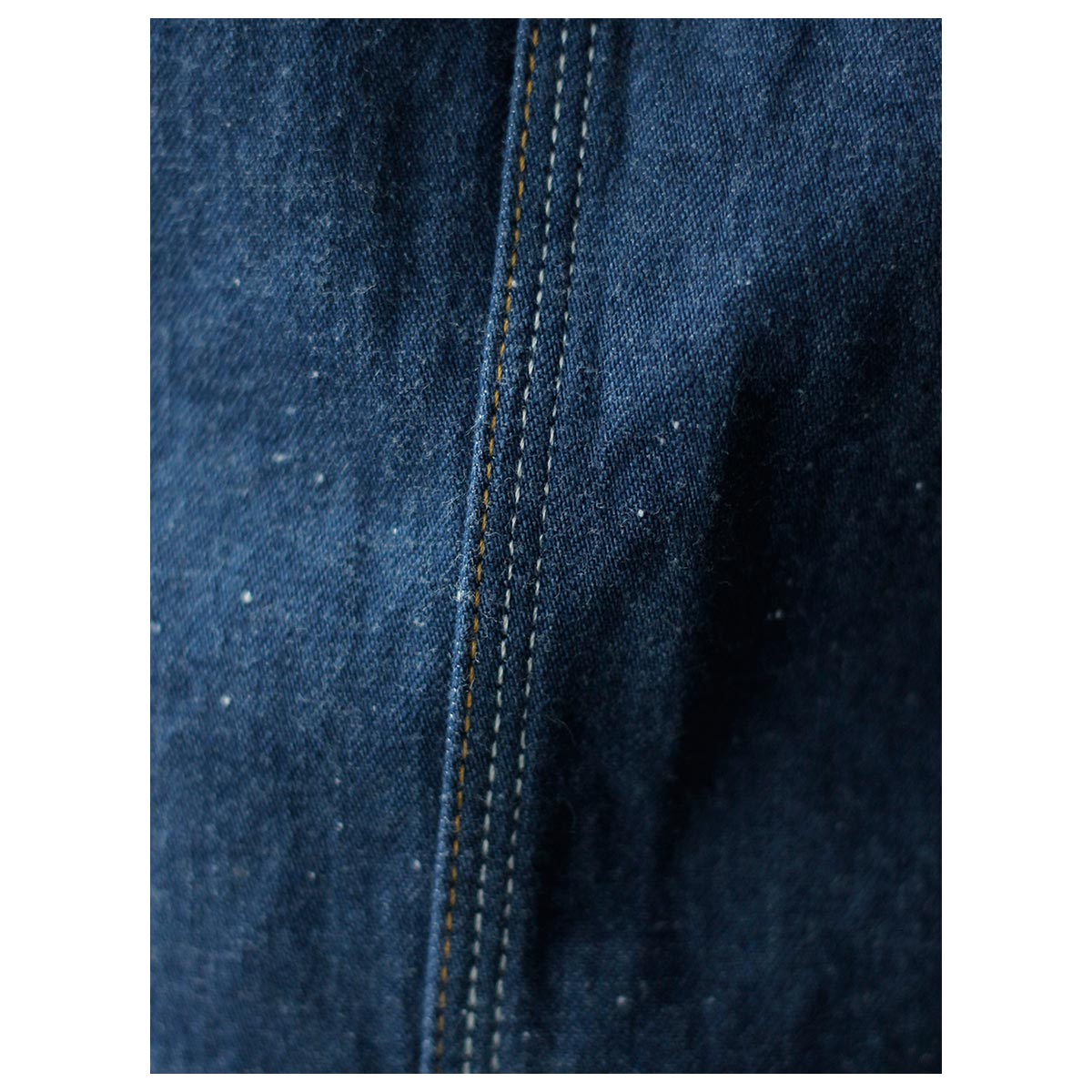 11オンスの縦糸ネップ糸、インディゴ+硫化ロープ染色のデニムを縫製し、ネップ感のある美しいデニムの鮮やかさを出しています。ワーク感の溢れるワイドでドライな着心地になっています。
