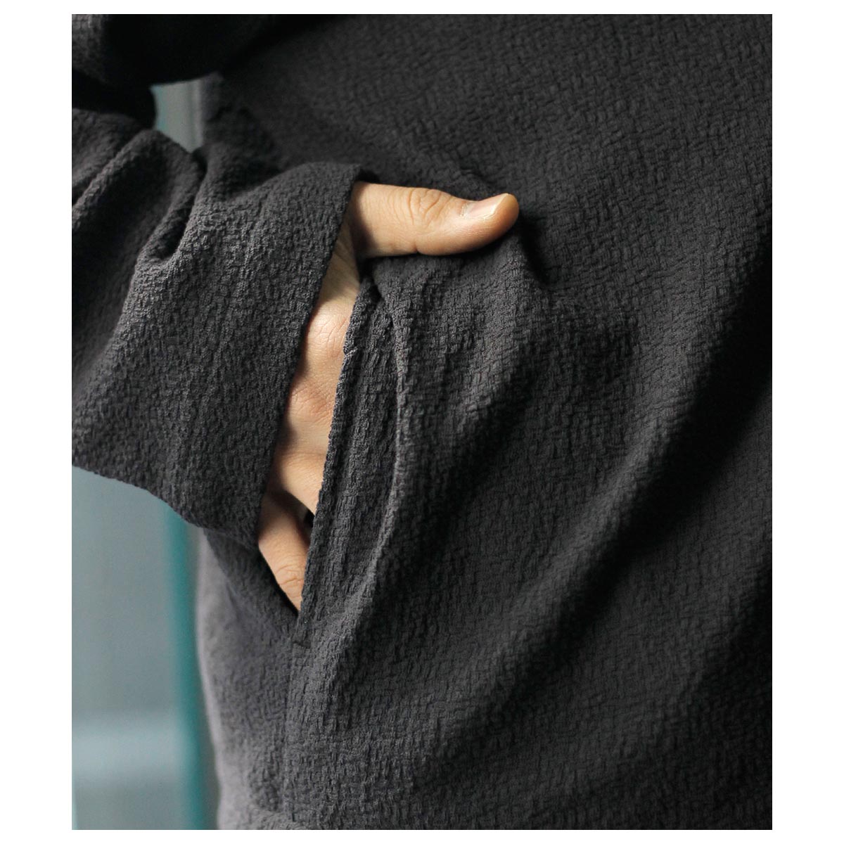 褪せても美しさが残る墨がかった「Inkshade」。 軽やかでいて堂々とした、夏の羽織りにふさわしい一枚です。 60番手双糸の強撚コットンを、さらにガスで焼いて毛羽を取り除き、シルクに負けないほどのシャリ感となめらかさを出したジャージー素材。 ジャカードで布帛の平織を再現しながら、強撚糸の伸度の差を活かして凹凸を表現し、オーストリッチの羽のような、奥行きのある陰影を持ったリンクス編みの組織になっています。 染色後にタンブラー仕上げを施し、より柔らかな肌触りに整えています。 洗濯機で洗えて、乾燥機にもかけられる。 何十回洗っても斜行せず、毛羽もほとんど立たない。 肌に張り付かず、真夏の暑さの中で快適に、そしてささやかに誇らしく着られる。 上質で、毎日着られて、ずっと気持ちがいい素材です。
