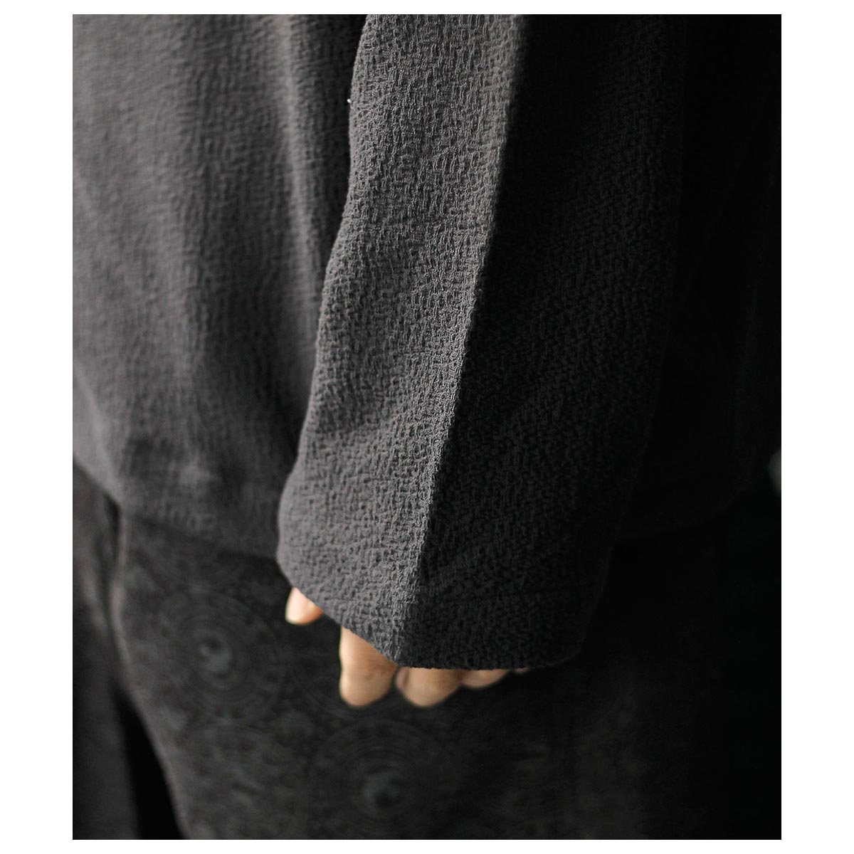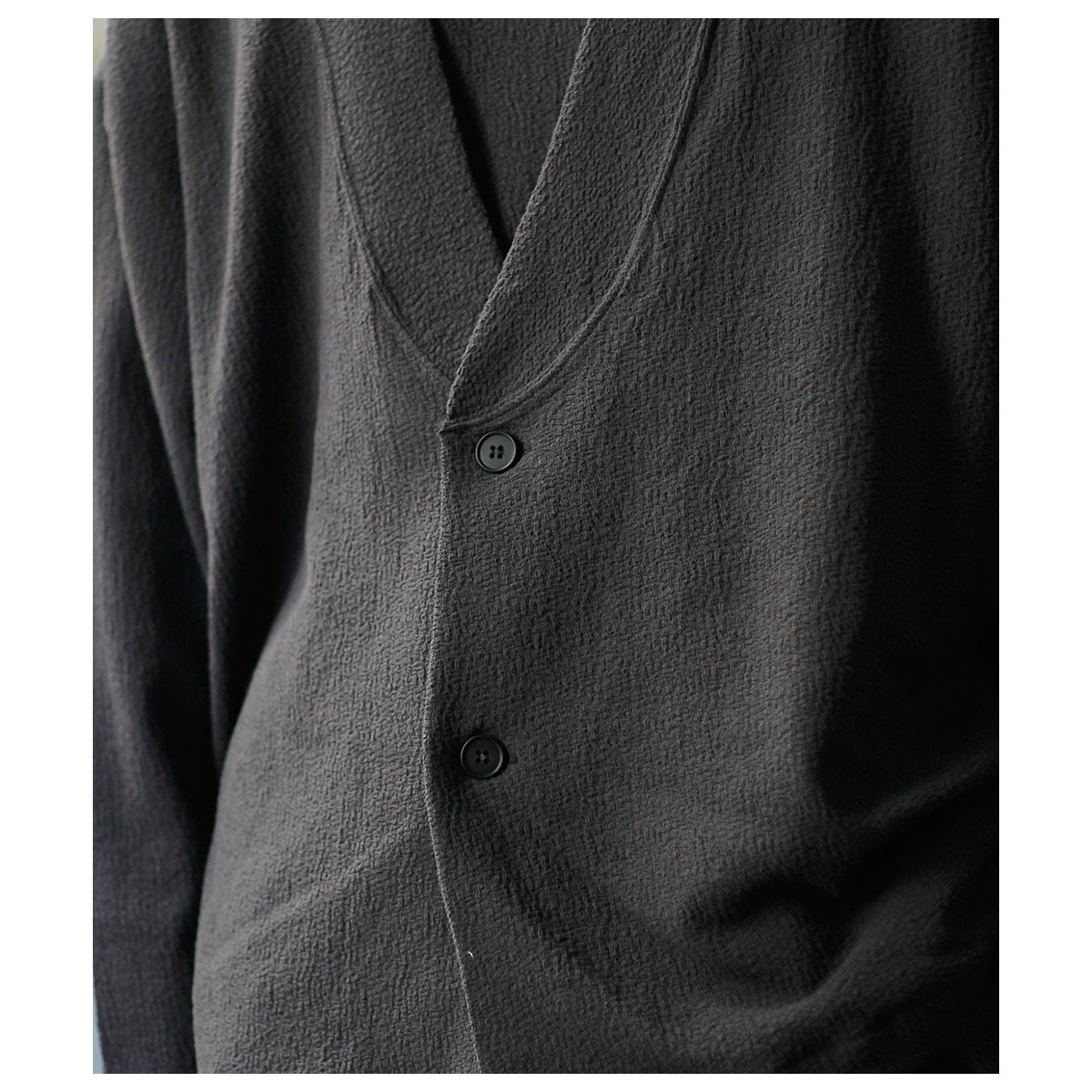 褪せても美しさが残る墨がかった「Inkshade」。 軽やかでいて堂々とした、夏の羽織りにふさわしい一枚です。 60番手双糸の強撚コットンを、さらにガスで焼いて毛羽を取り除き、シルクに負けないほどのシャリ感となめらかさを出したジャージー素材。 ジャカードで布帛の平織を再現しながら、強撚糸の伸度の差を活かして凹凸を表現し、オーストリッチの羽のような、奥行きのある陰影を持ったリンクス編みの組織になっています。 染色後にタンブラー仕上げを施し、より柔らかな肌触りに整えています。 洗濯機で洗えて、乾燥機にもかけられる。 何十回洗っても斜行せず、毛羽もほとんど立たない。 肌に張り付かず、真夏の暑さの中で快適に、そしてささやかに誇らしく着られる。 上質で、毎日着られて、ずっと気持ちがいい素材です。