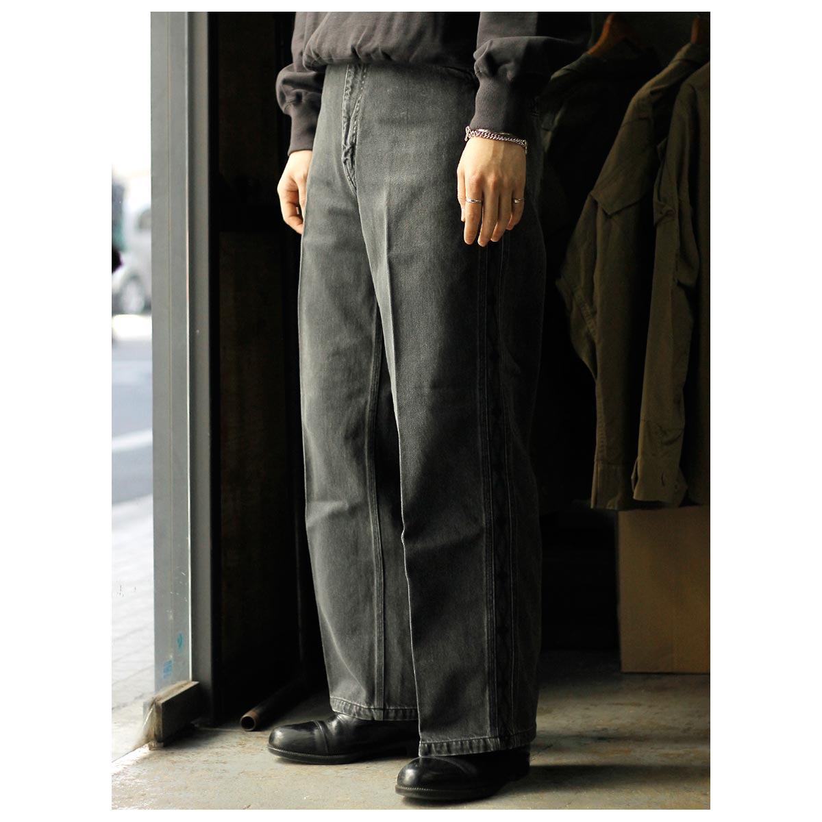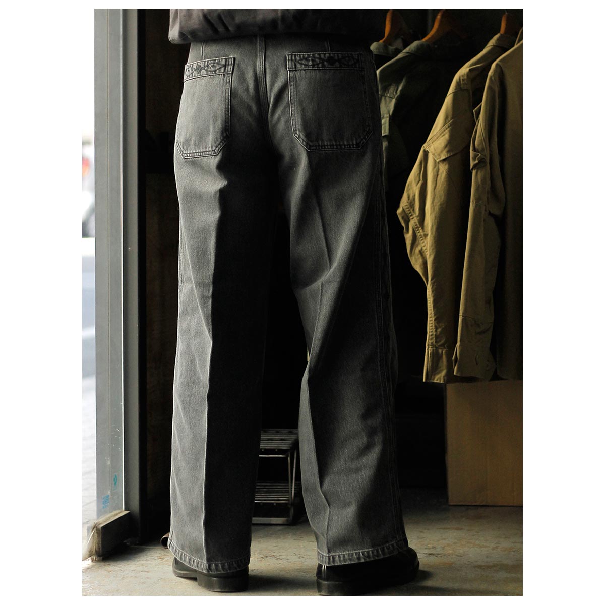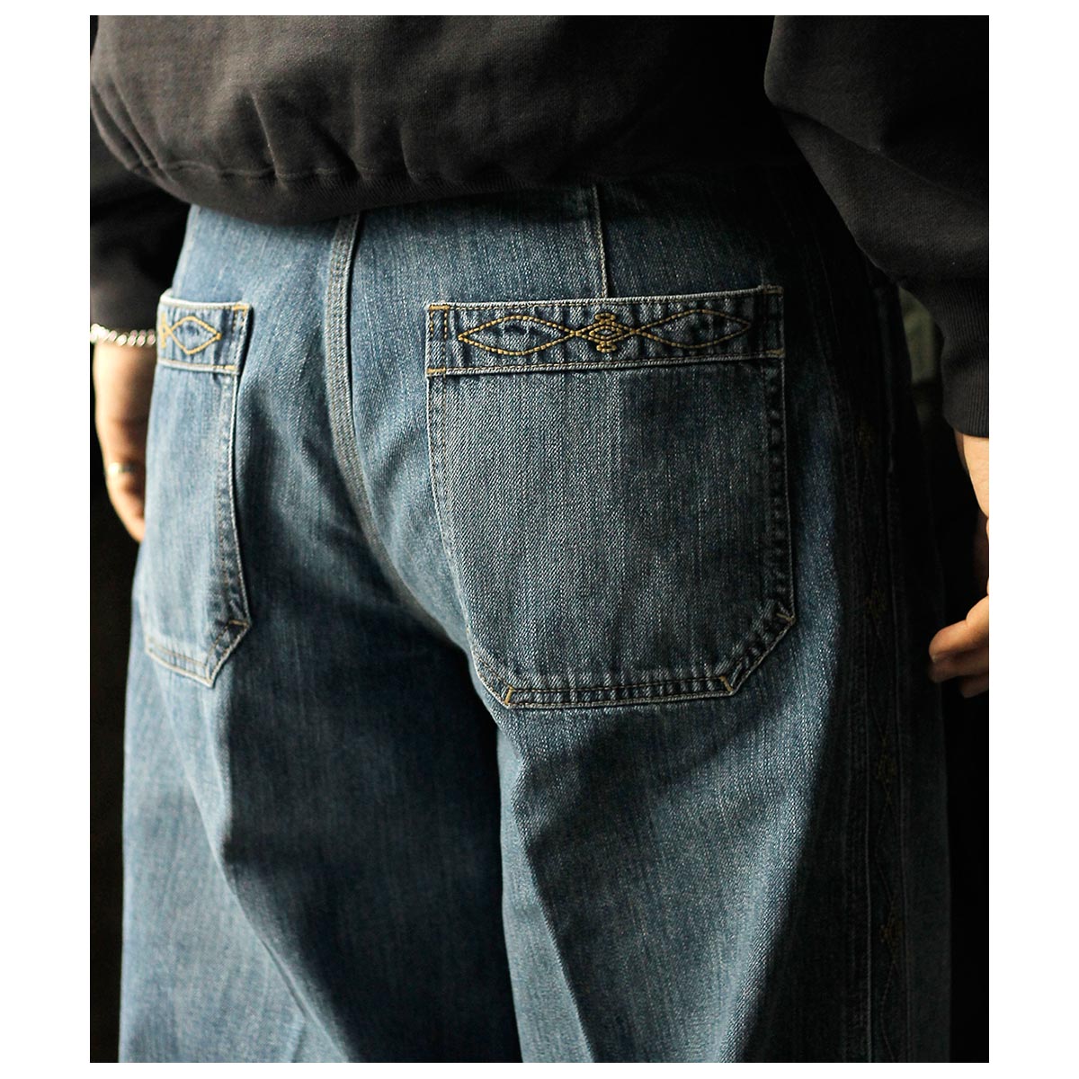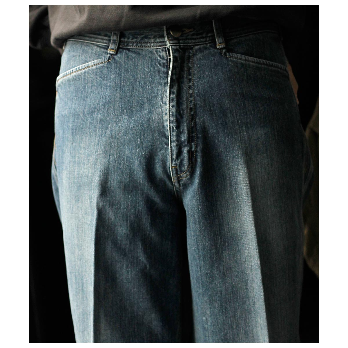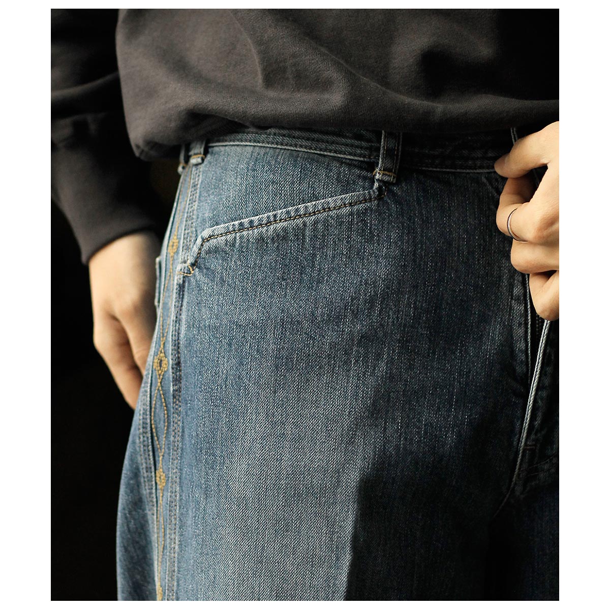 生地は中厚手のコットンデニム。ユーズド加工が施されていますが非常に柔らかくて履き馴染みがよく、通年の着用が可能なアイテムです。