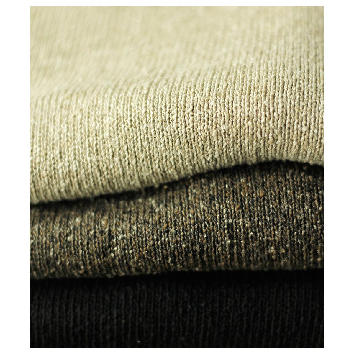 ソフトな風合いとネップ感が特徴のシルク紬糸に追撚をかけ、ドライタッチに仕上げた糸を度詰めで編み立てました。シルク特有の表情と風合いを最大限に引き出すため、特殊なシンカー編機を用いて丁寧に仕上げたアイテムです。