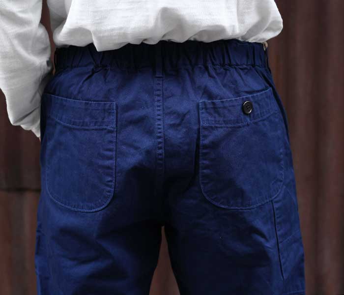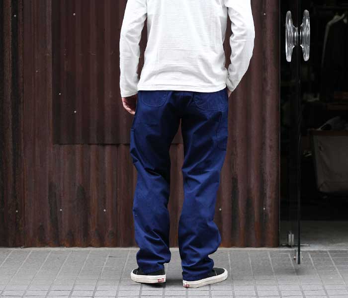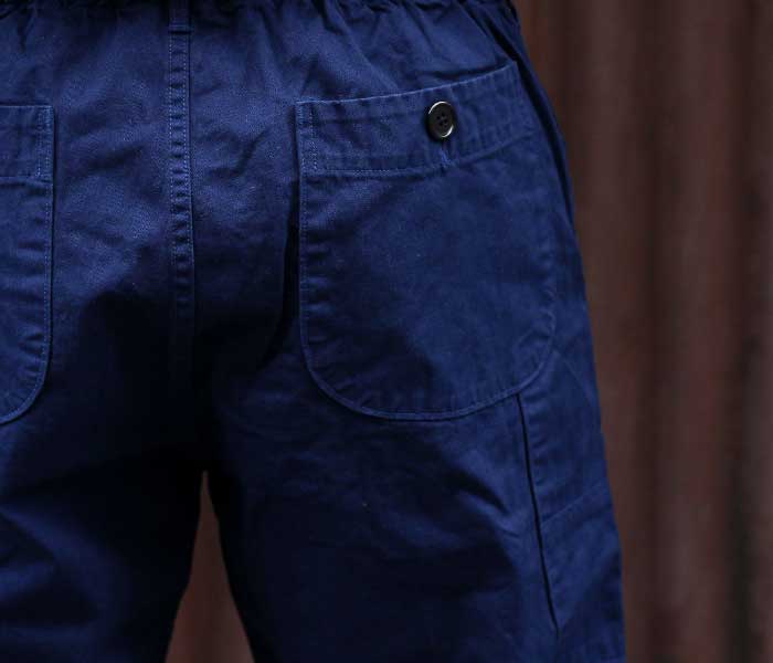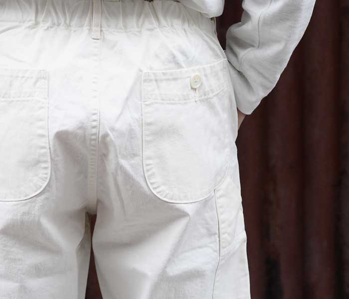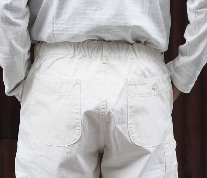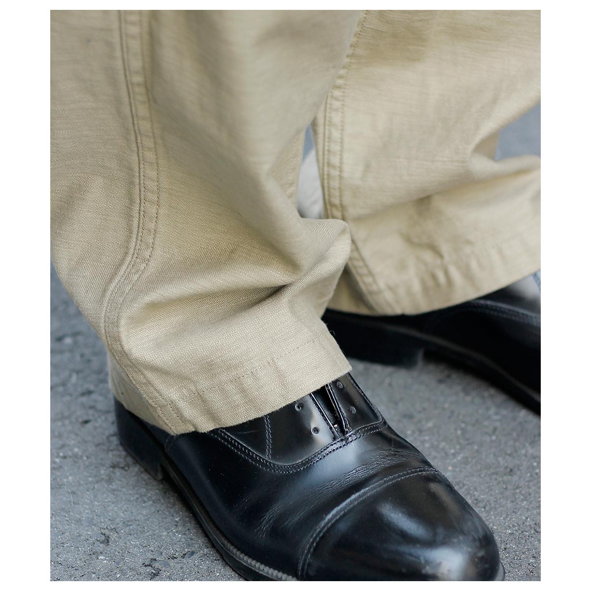 シンプルな4ポケタイプのベイカーパンツに、凹凸が横シマのように現れるバックサテン生地を採用。もちろん生地自体もオリジナルで製作しています。モデルとなっているのは60年代のいわゆる初期型で、ウェストにアジャスターボタンが付いています。サイドは巻き縫い仕様で、スソはシングル。 背面はフラップ付きの5角形のホームベース型ポケット。フロントは大きなポケットが2つ付いたファティーグパンツの定番型。