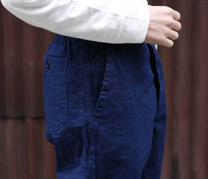 フランスのワークパンツをベースに、ヘリンボーン素材を採用。控えめなツールポケットや、ウェストにゴムが入るところなどはアメリカのワークウェアとはひと味違った趣きがあります。やや細身なシルエットも今の気分で、スソをロールアップして穿くのもオススメです。