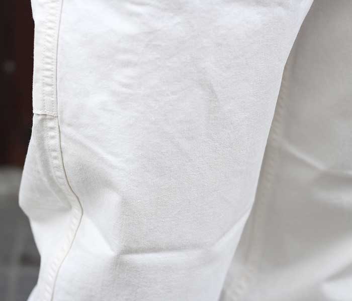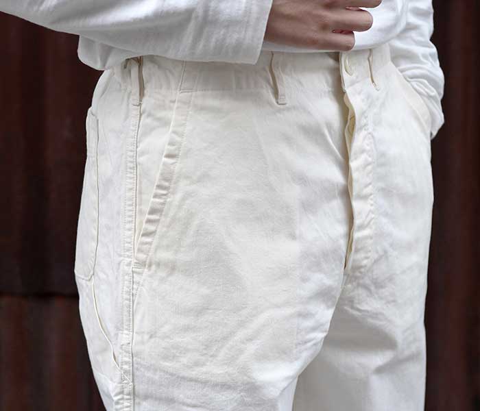 エクリュ(オフホワイト)は、ブランド初期からリリースされている定番カラーです。ユーロワークではよくあるオフホワイトのヘリンボーン生地です。ガシガシ穿いて、汚れもまたアジになる、経年変化も楽しんでほしい一本です。