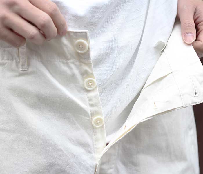 すっきりとしたシルエットが魅力のスリムフィットタイプです。細身なパンツの脱ぎ着の効率性から、フロントはボタンフライから、ジッパーフライに変更され、股上を浅めにアレンジしています。