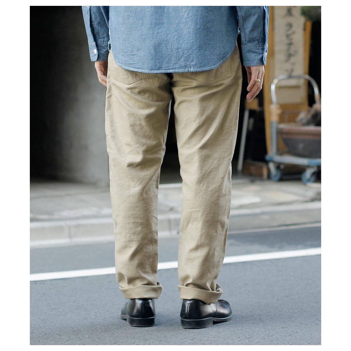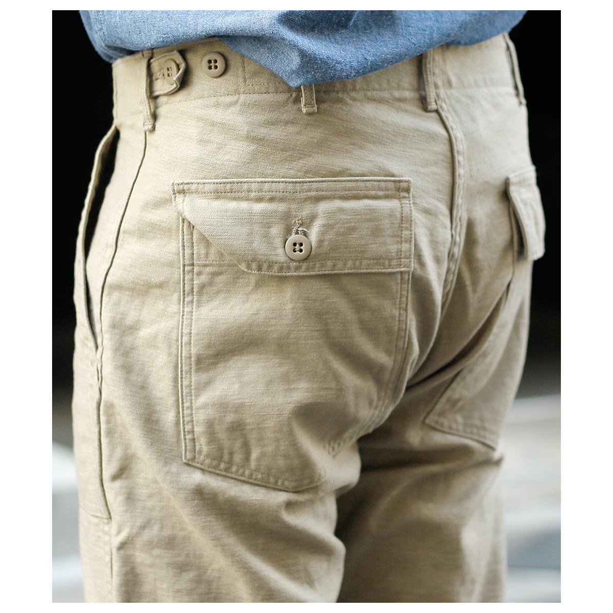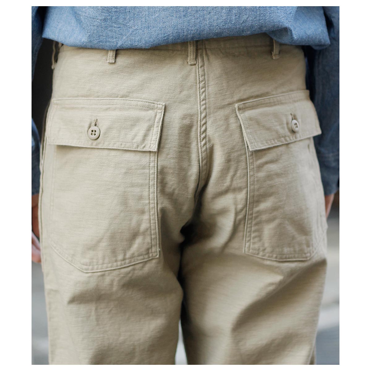 シンプルな4ポケタイプのベイカーパンツに、凹凸が横シマのように現れるバックサテン生地を採用。もちろん生地自体もオリジナルで製作しています。モデルとなっているのは60年代のいわゆる初期型で、ウェストにアジャスターボタンが付いています。サイドは巻き縫い仕様で、スソはシングル。 背面はフラップ付きの5角形のホームベース型ポケット。フロントは大きなポケットが2つ付いたファティーグパンツの定番型。