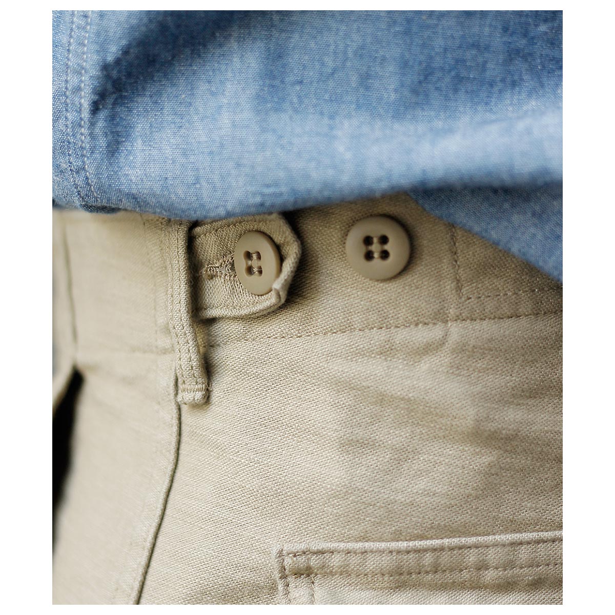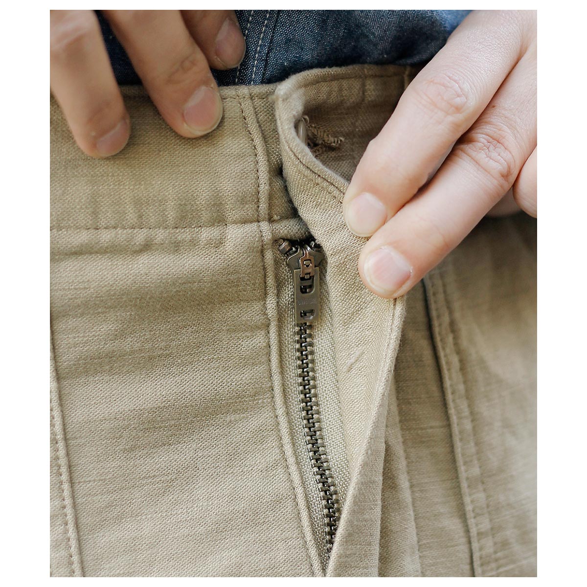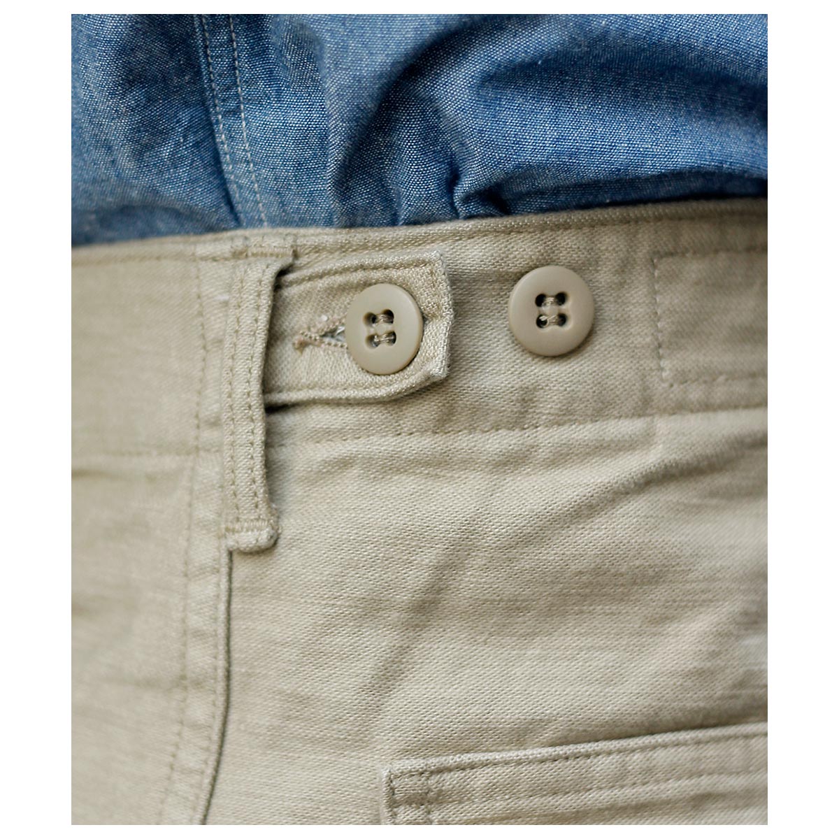 シンプルな4ポケタイプのベイカーパンツに、凹凸が横シマのように現れるバックサテン生地を採用。もちろん生地自体もオリジナルで製作しています。モデルとなっているのは60年代のいわゆる初期型で、ウェストにアジャスターボタンが付いています。サイドは巻き縫い仕様で、スソはシングル。 背面はフラップ付きの5角形のホームベース型ポケット。フロントは大きなポケットが2つ付いたファティーグパンツの定番型。