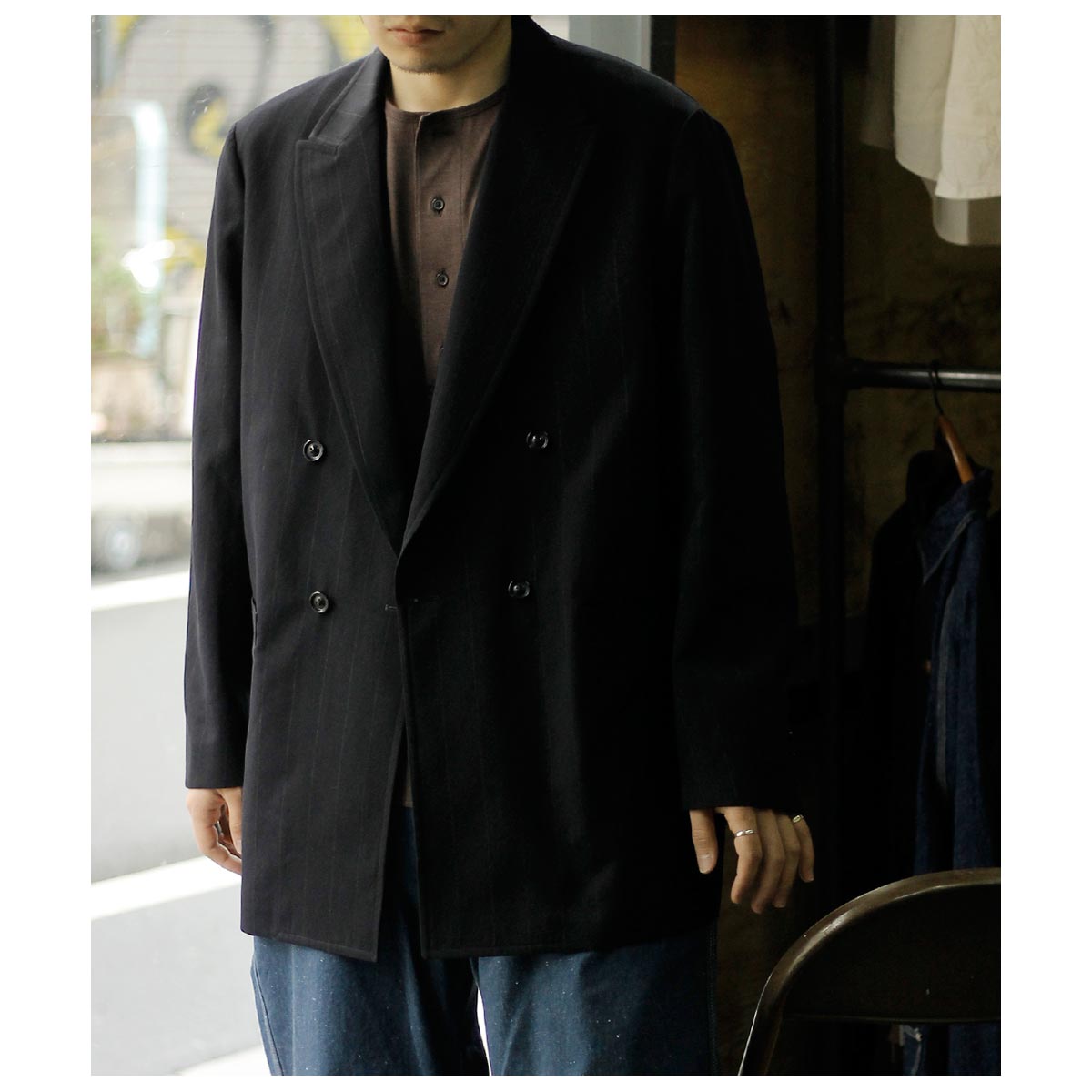 チョークストライプの表情はクラシックでドレス感が強く出る一着ですが、