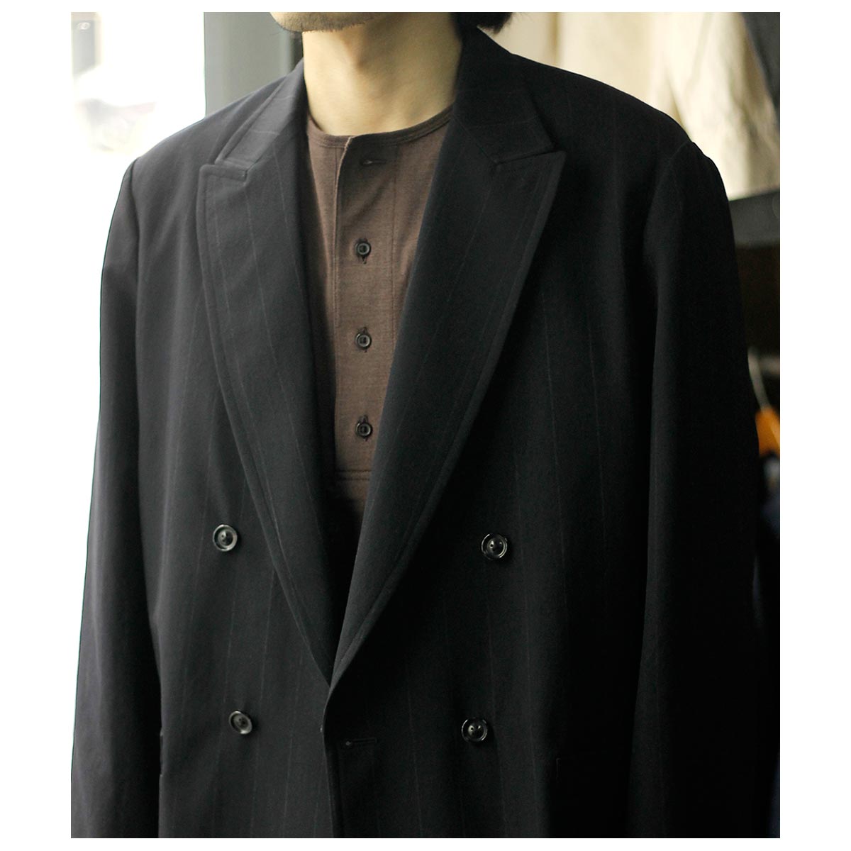 Super120sの細番手ウールと美濃和紙を高密度に交織した独特な素材感が特徴のストライプダブルジャケット。