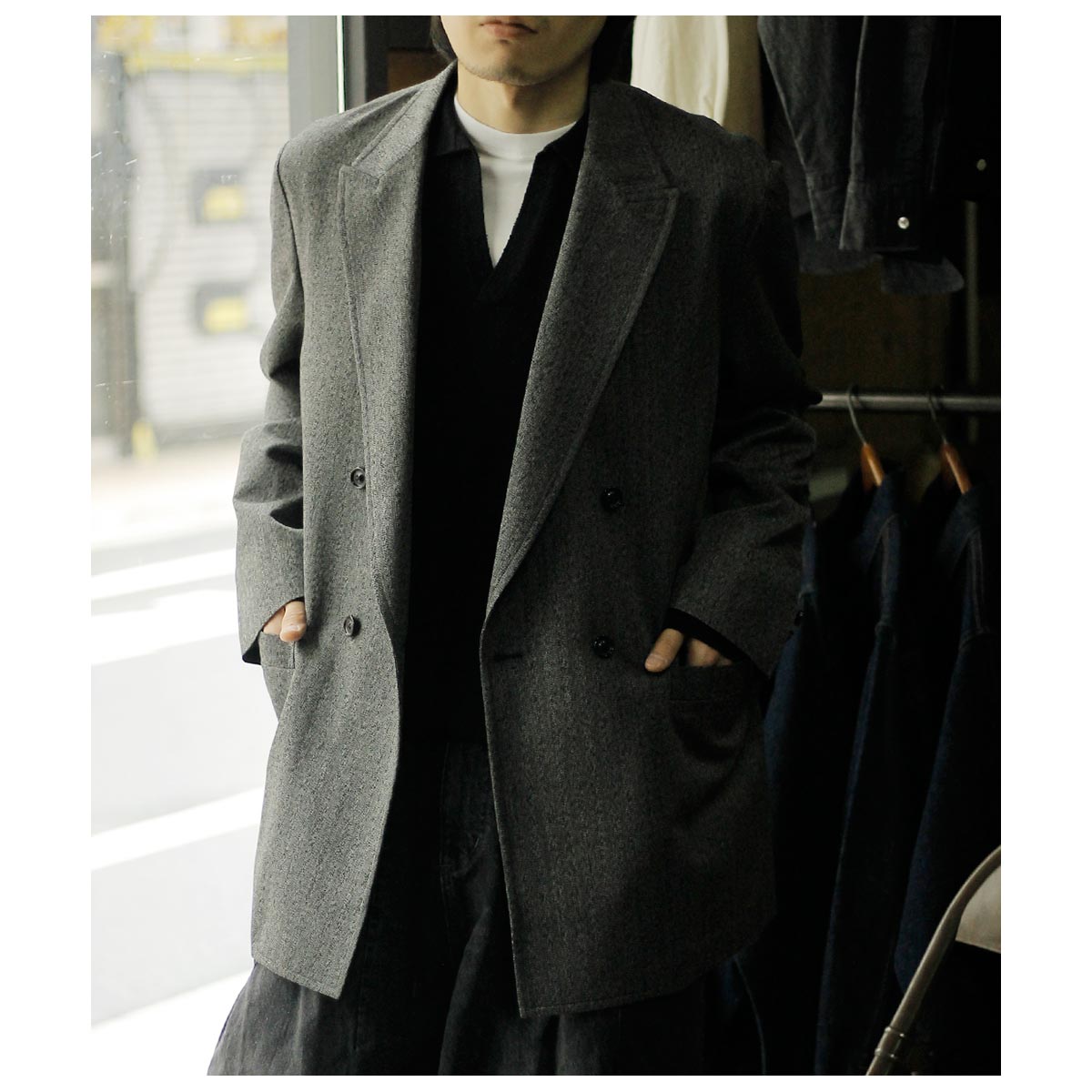 ウール/和紙素材を使用した、こちらはヘリンボーンのダブルジャケット。