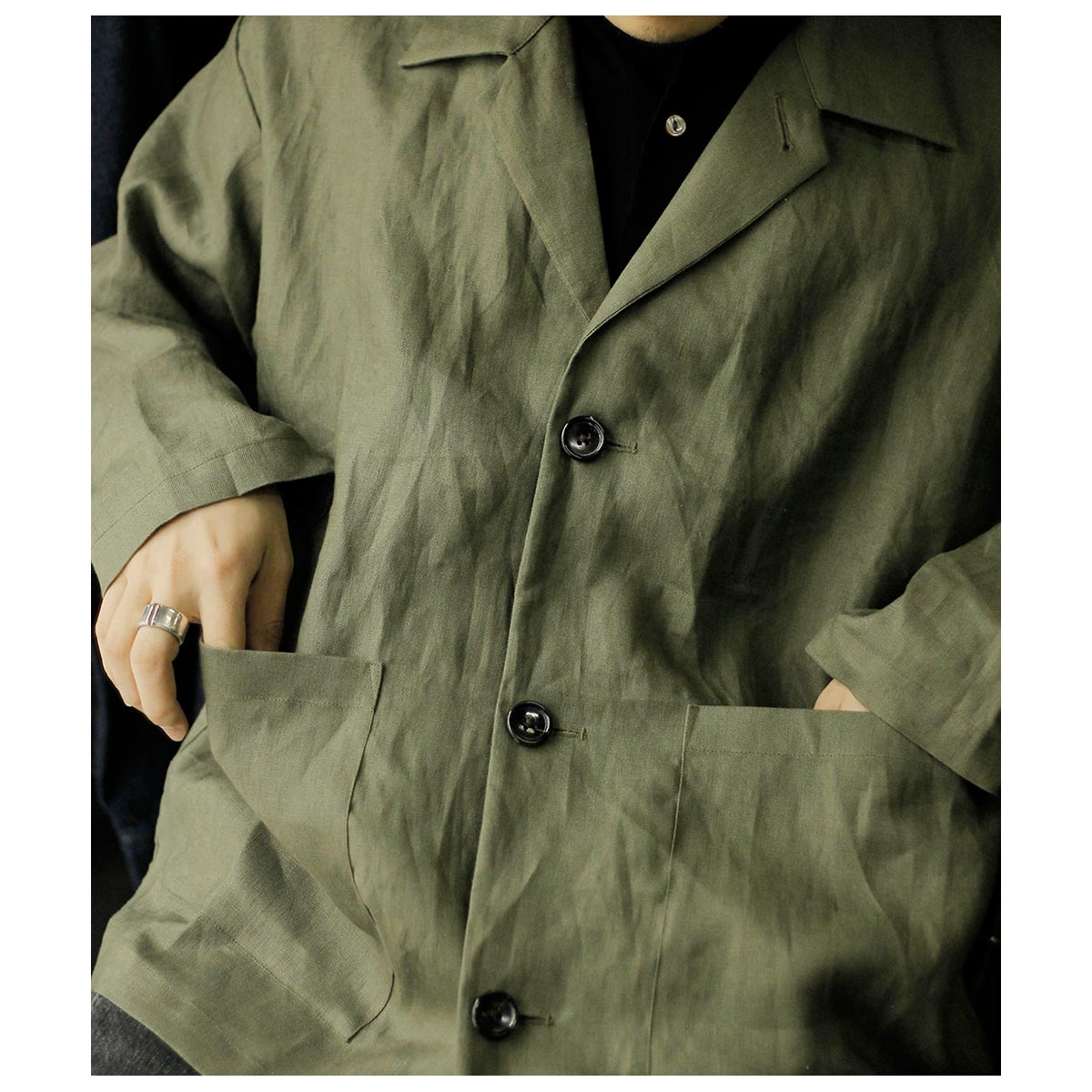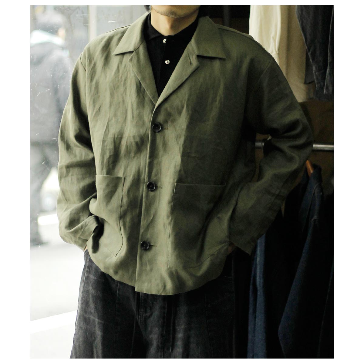 スーチングリネンを使用した、シャツとジャケットの中間のような存在の一着。