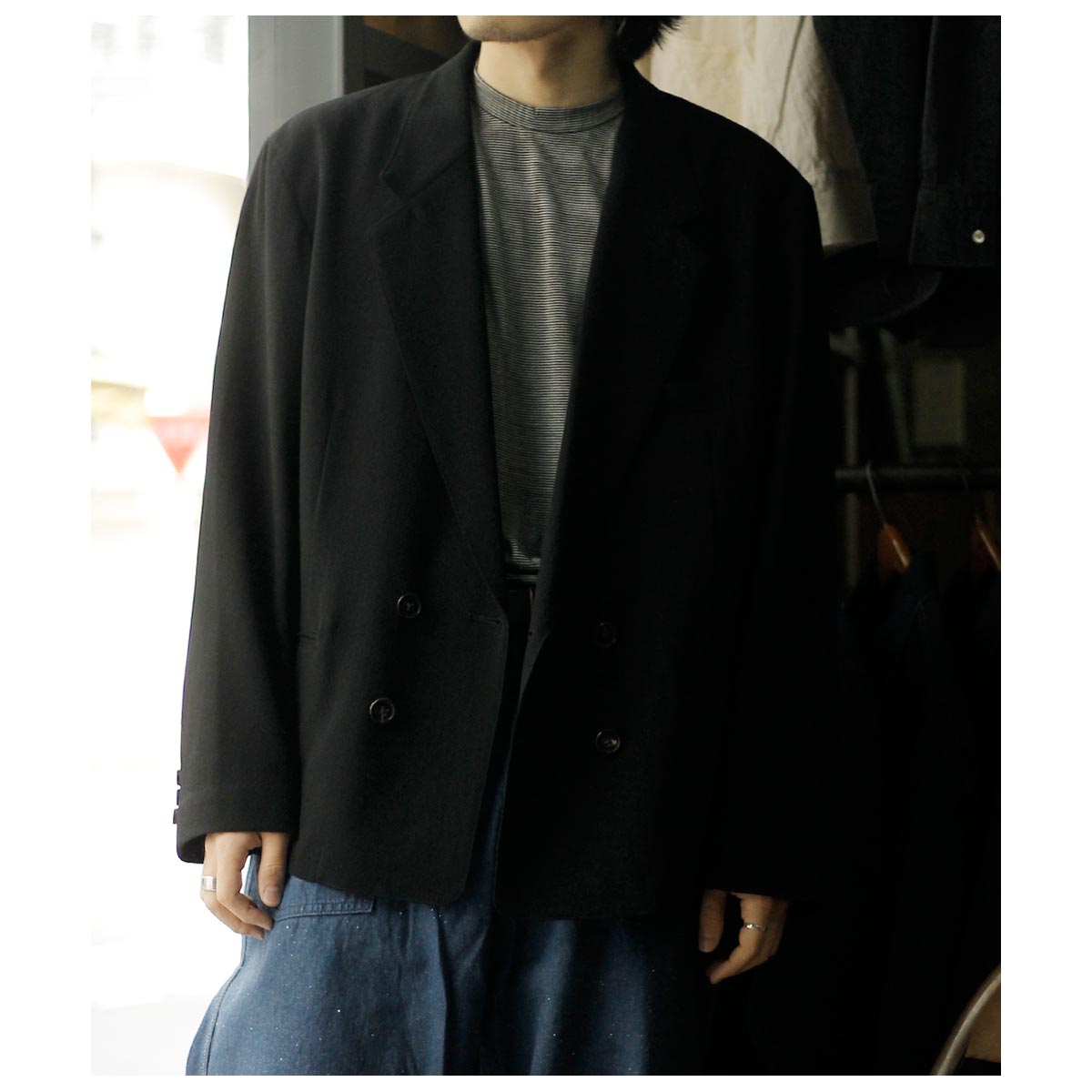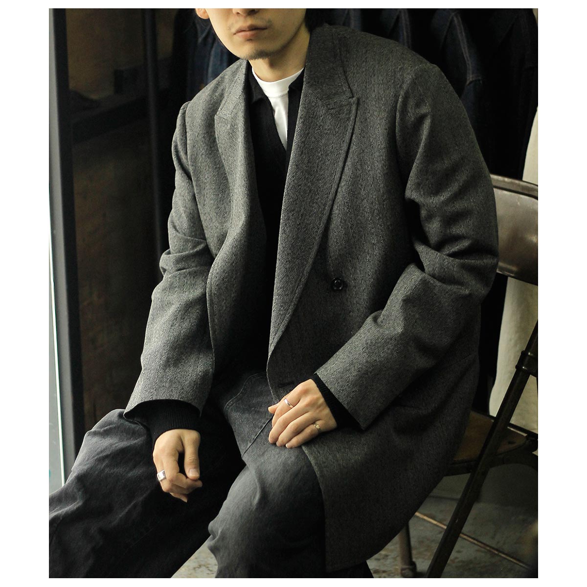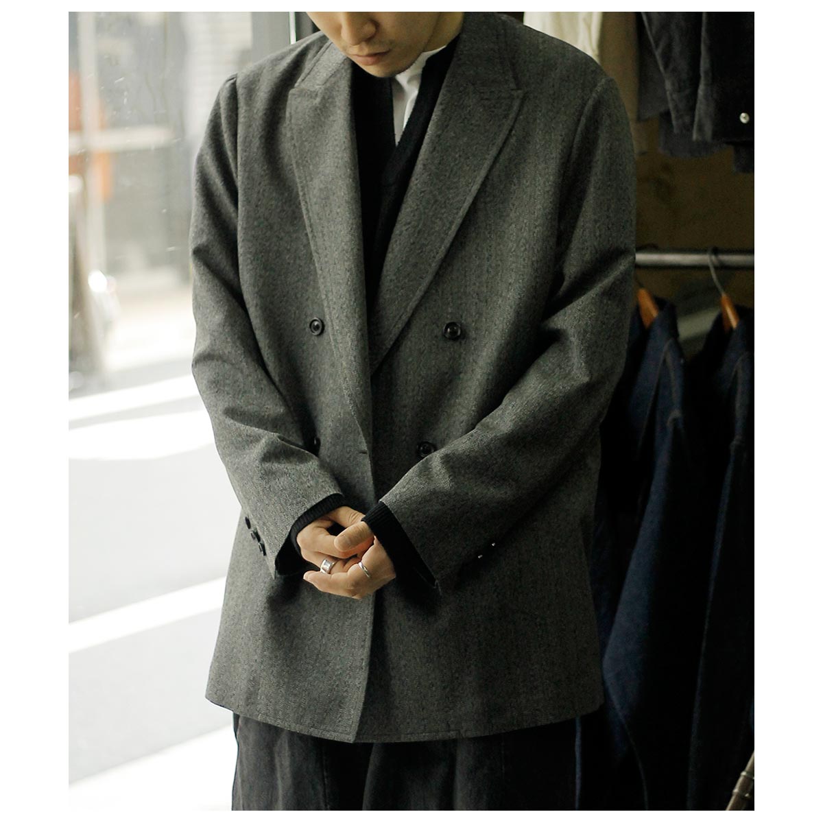 ウール/和紙素材を使用した、こちらはヘリンボーンのダブルジャケット。