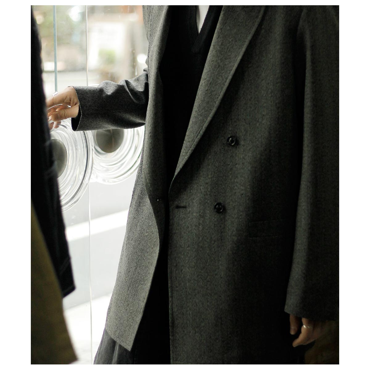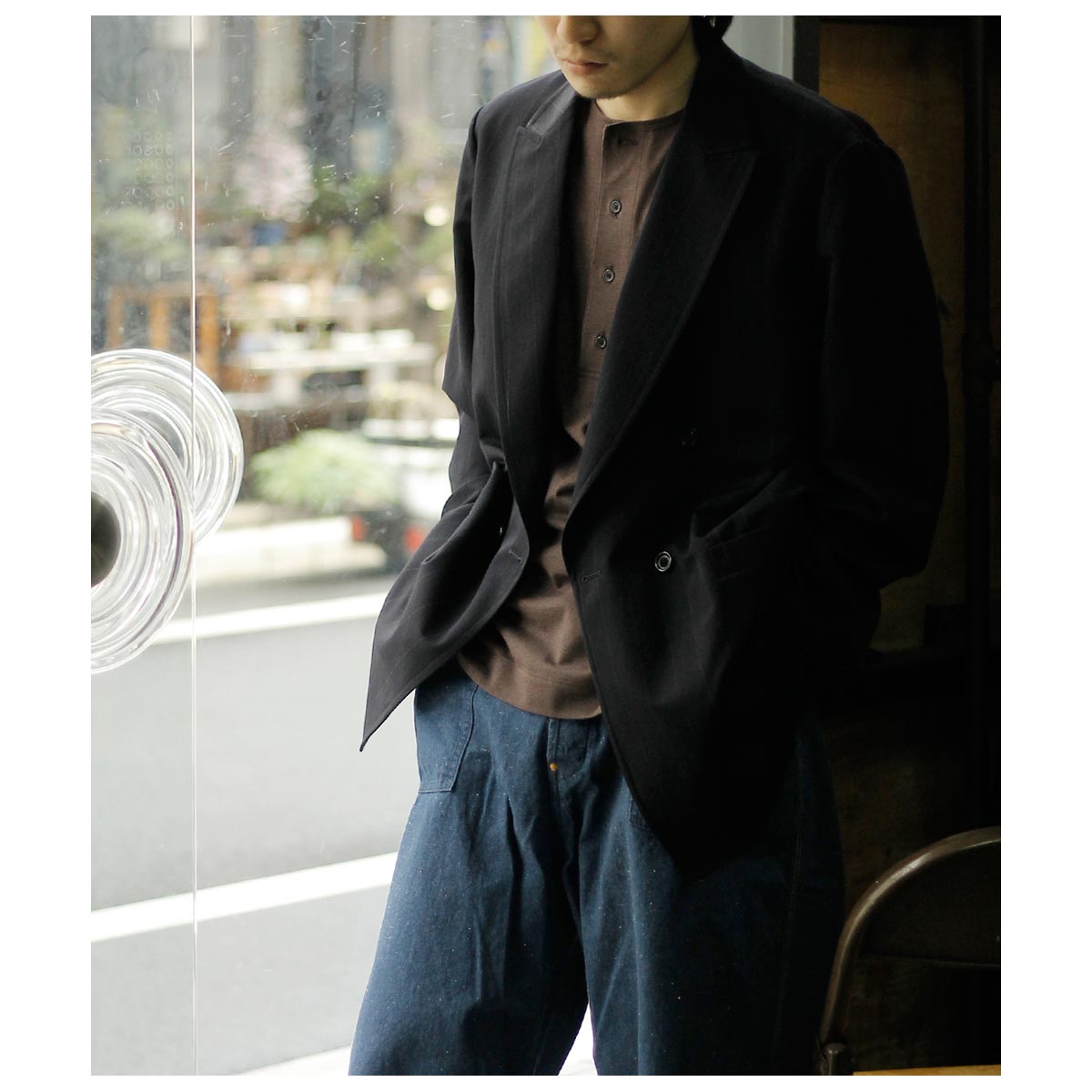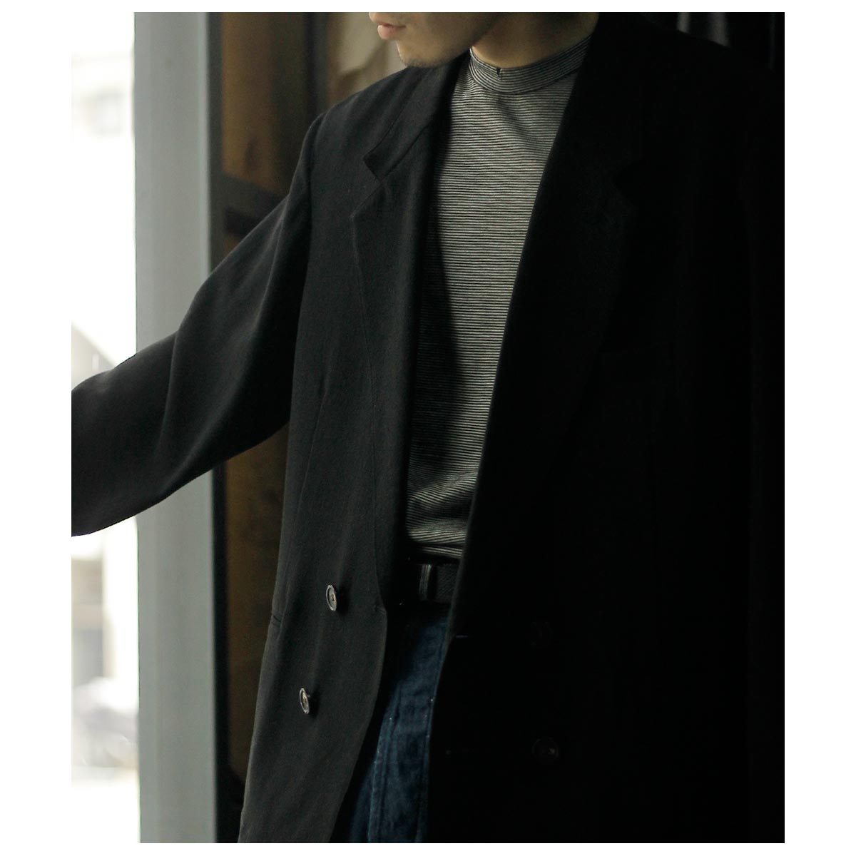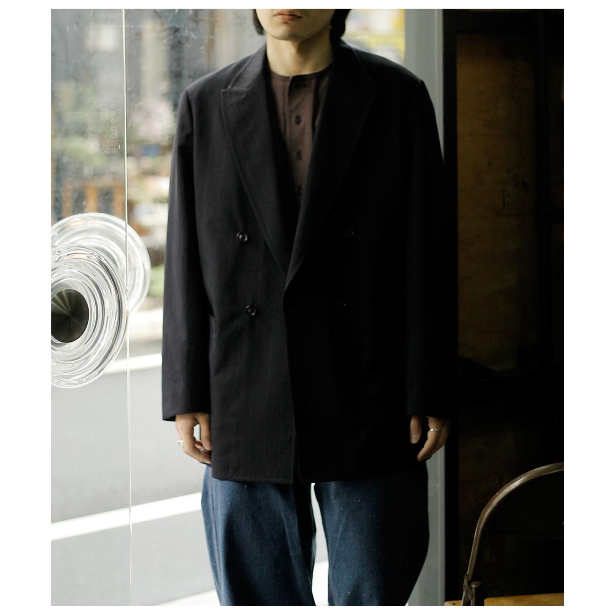 ウール/和紙素材を使用した、こちらはヘリンボーンのダブルジャケット。