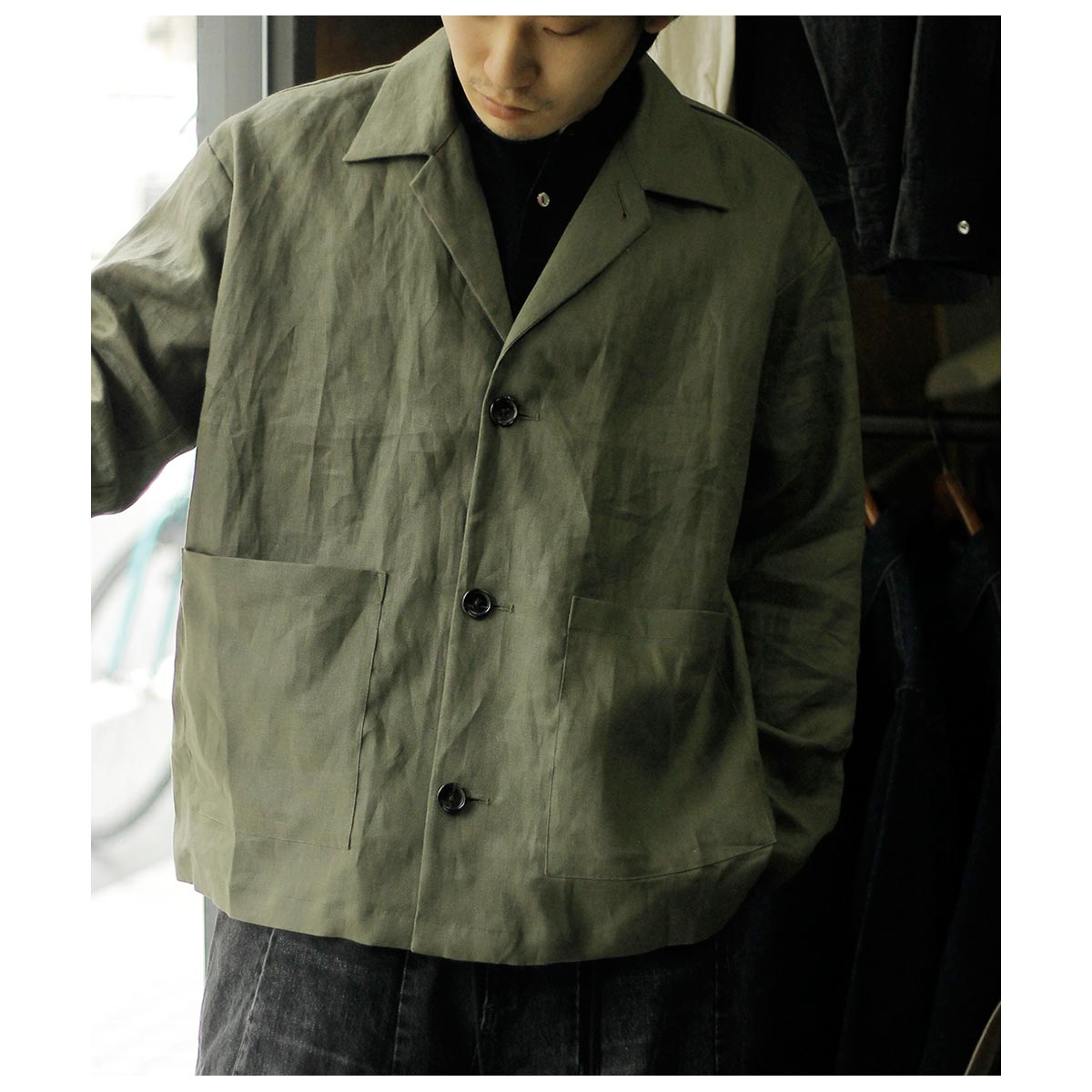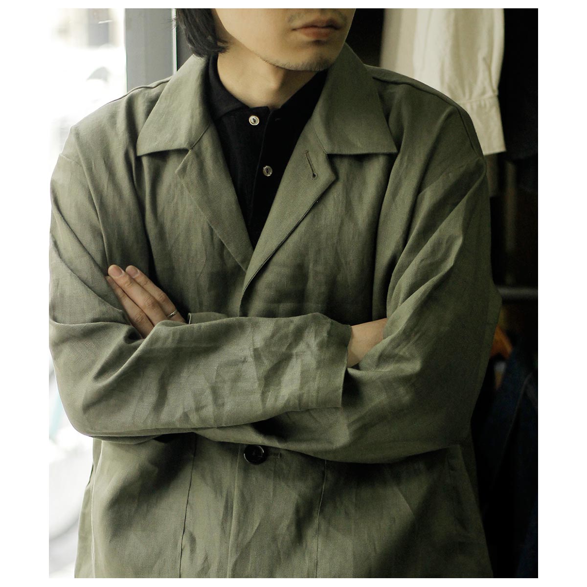 スーチングリネンを使用した、シャツとジャケットの中間のような存在の一着。