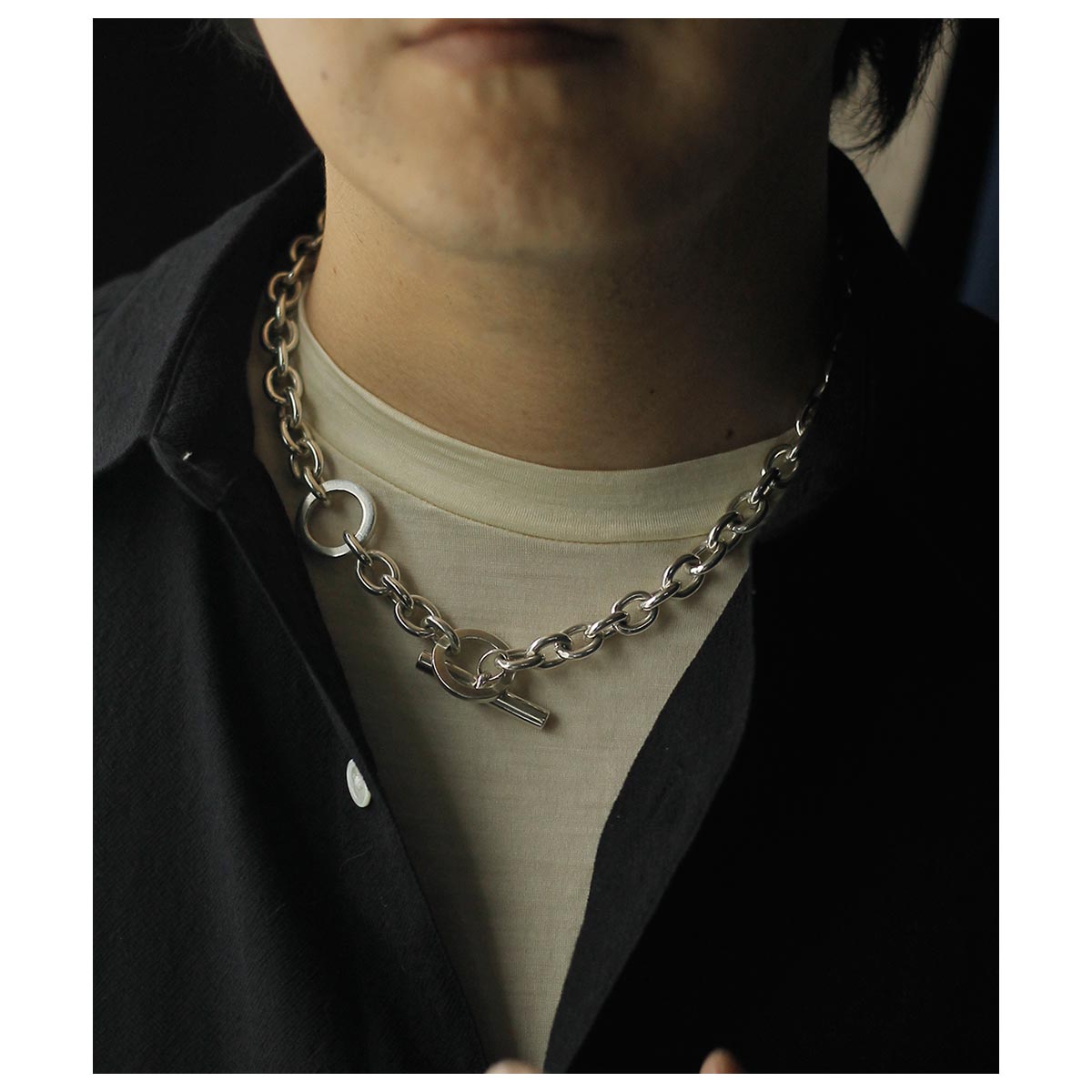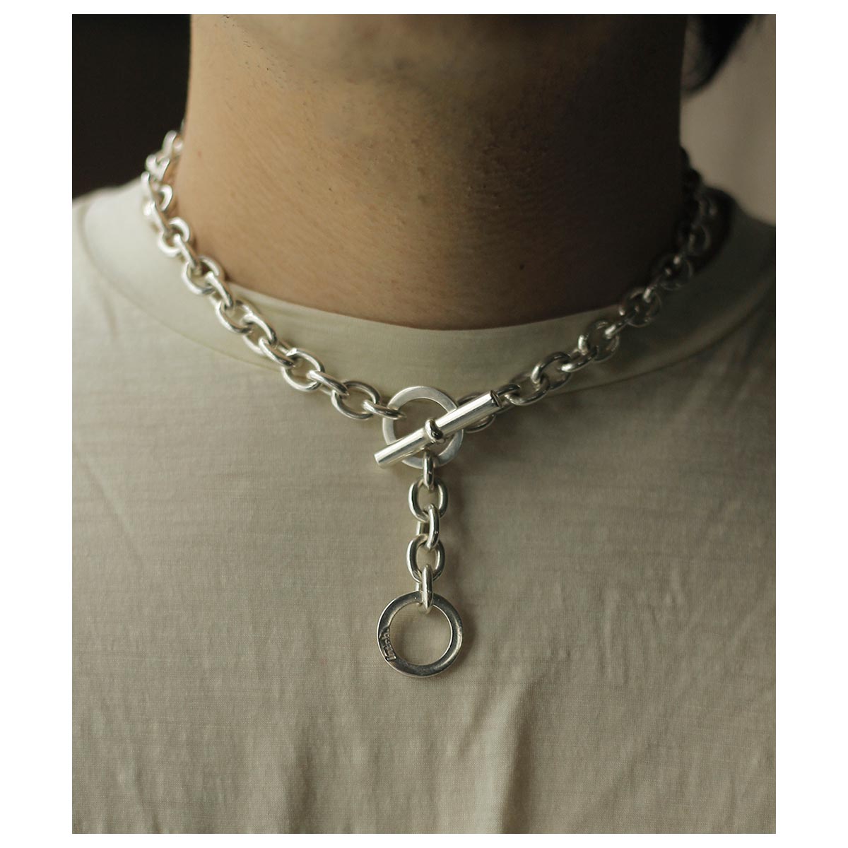 オーバルチェーンにTバーとリングを組み合わせた、無駄のないシンプルな造形美を追求したデザイン。 1コマ1コマ全てのロウ付け部分にもバフかけてより滑らかに磨き上げられた、量産品では再現できない、職人の丁寧な手仕事が見て取れる美しい仕上げに。