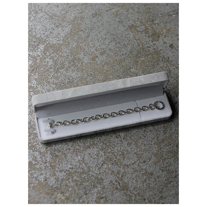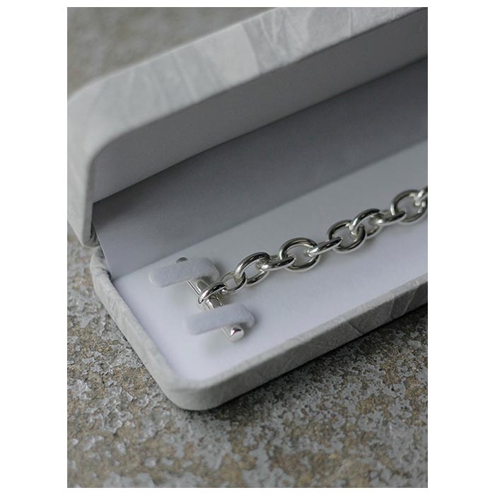 素材はチェーン部分はもちろん、Tバーやリング、細かな繋ぎのパーツに至るまで、全てスターリングシルバー(シルバー925)を使用。 高級感のある深い光沢が特徴で、磨いてさらに光沢を出すことや、反対に使い込んで硫化を進め陰影を強調させるなど、自分好みの育てていける魅力的な素材です。