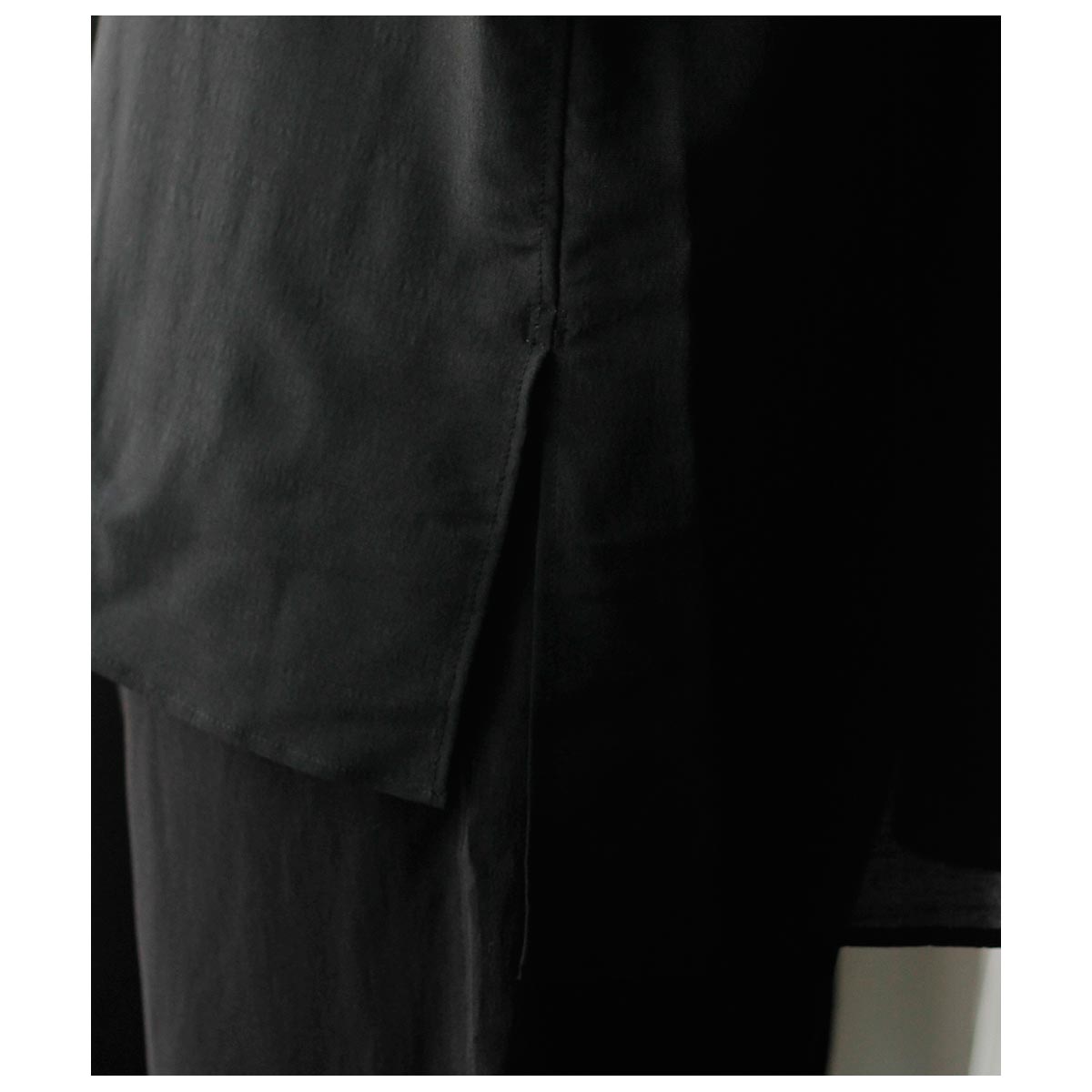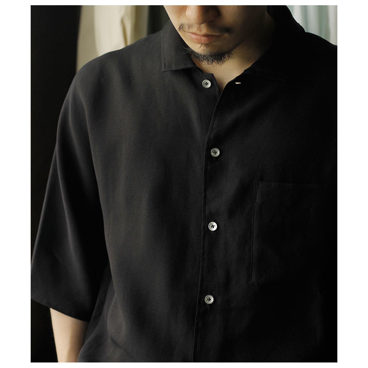 一見普通のショートスリーブシャツに見えますが、メンズでは珍しいドルマンスリーブの仕様で、前見頃が後見頃にラグランスリーブの仕様で繋がっている、一癖パターンに与えて作成した1着です。素材にはシルクアセテイトを採用しています。上品な生地表面とさりげない柄、ハリの中にも柔らかさのある風合いが特徴です。
