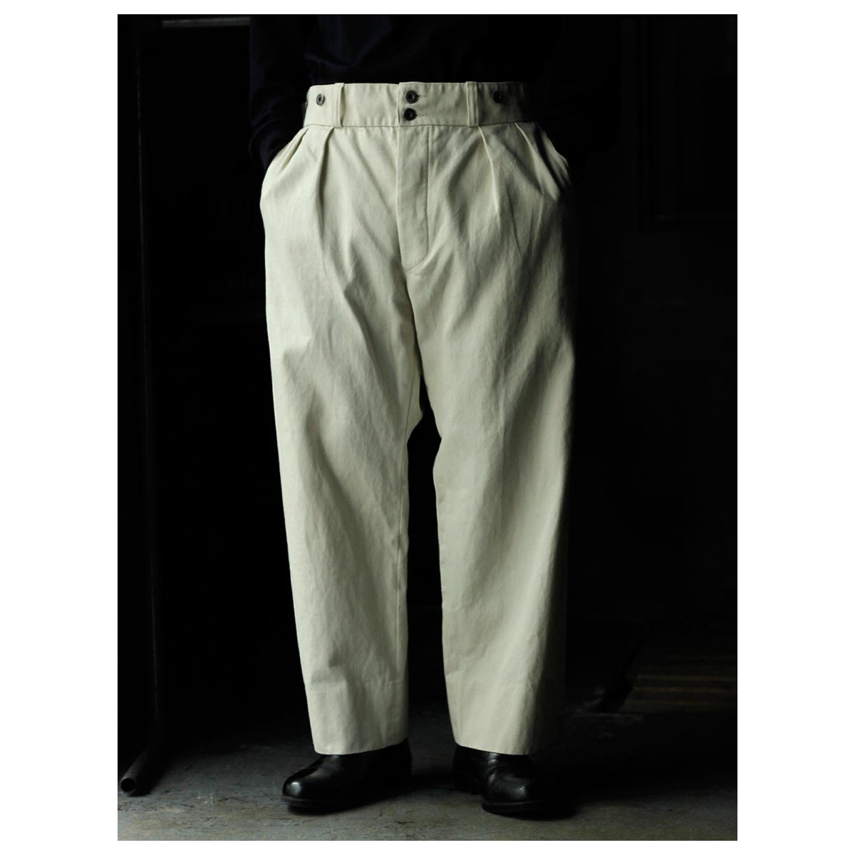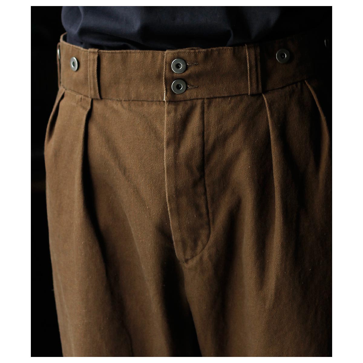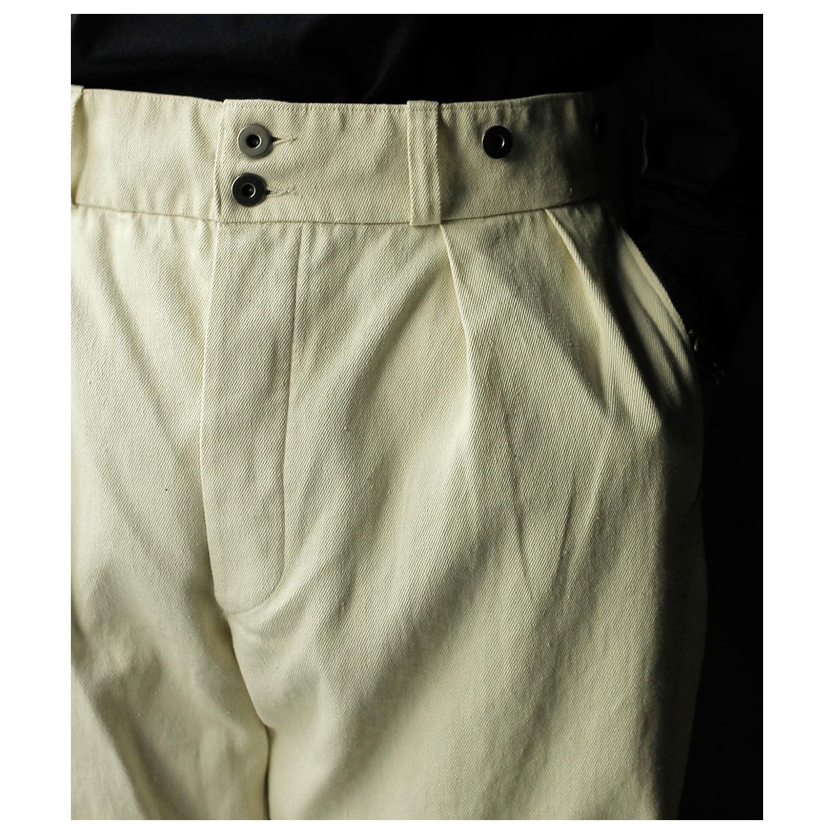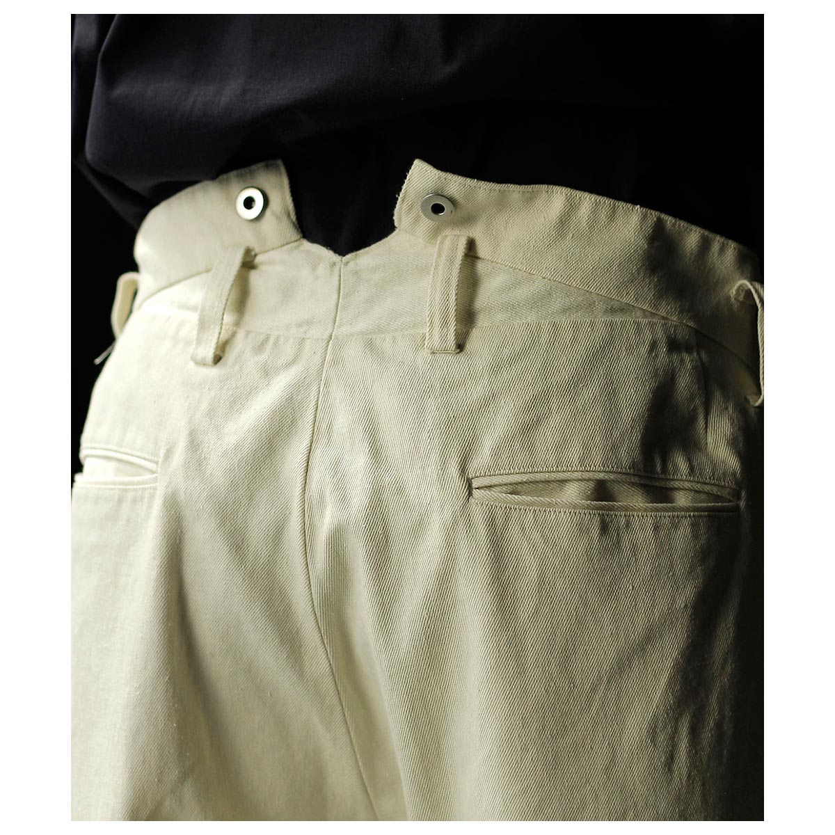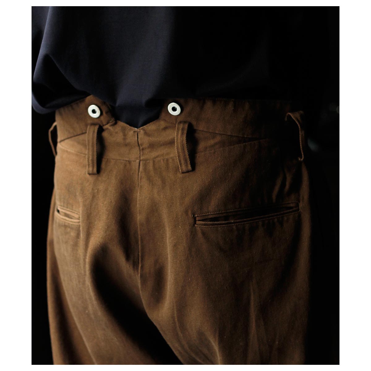 1930年代のフランス軍や民間作業着として使われていたボージョンパンツをベースに製作。オリジナルにはないベルトループを加えてタウンユースに対応し、後ろのシンチバックでサイズ調整も可能です。
