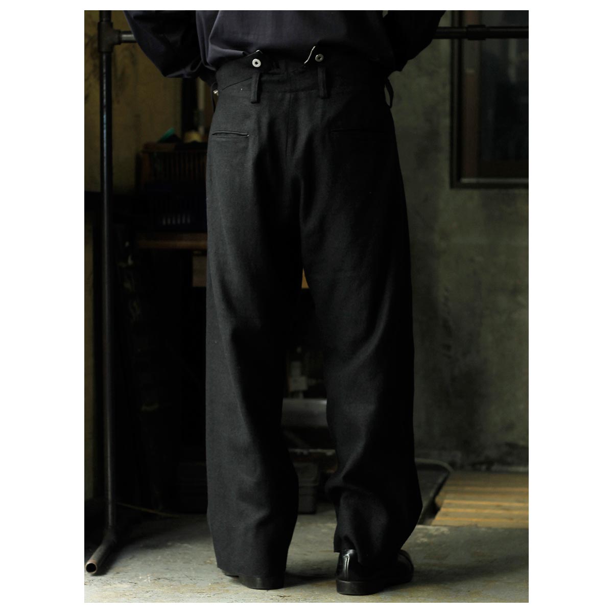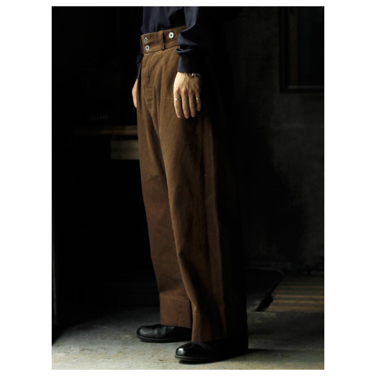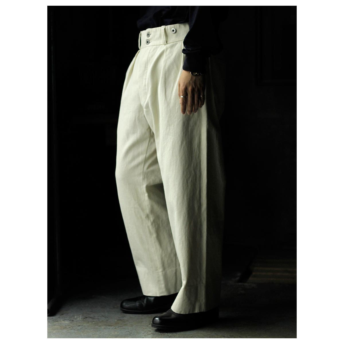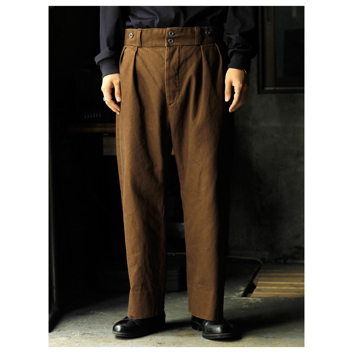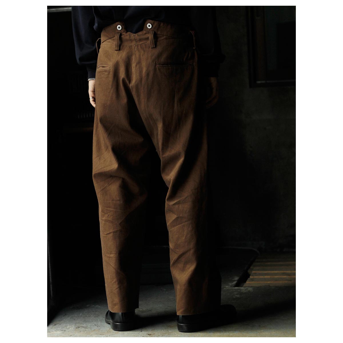 1930年代のフランス軍や民間作業着として使われていたボージョンパンツをベースに製作。オリジナルにはないベルトループを加えてタウンユースに対応し、後ろのシンチバックでサイズ調整も可能です。