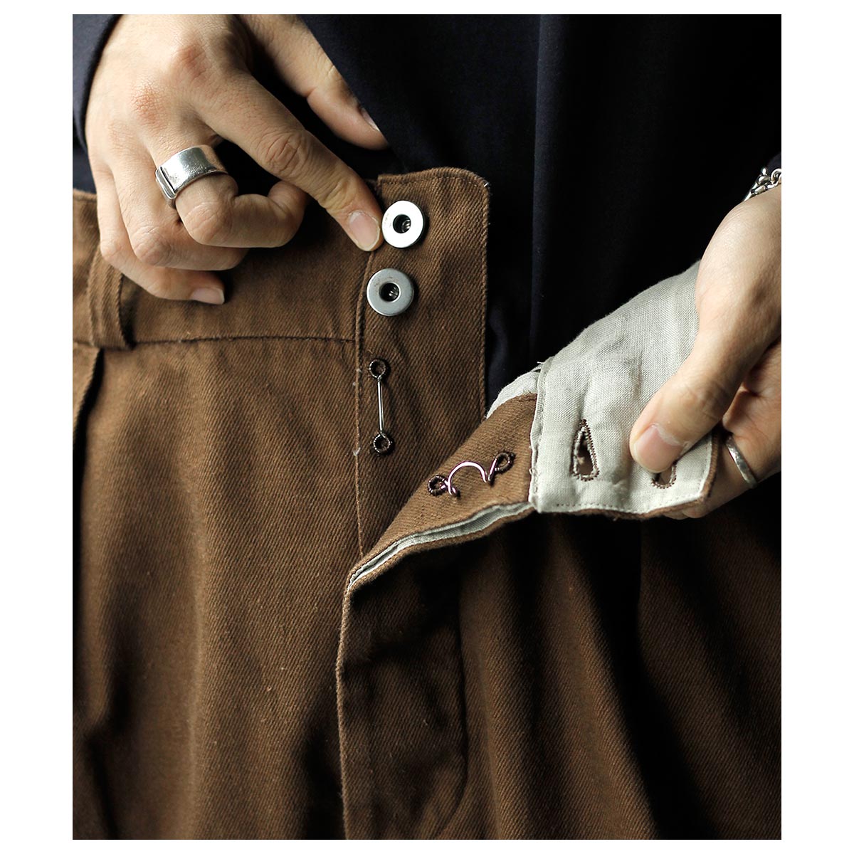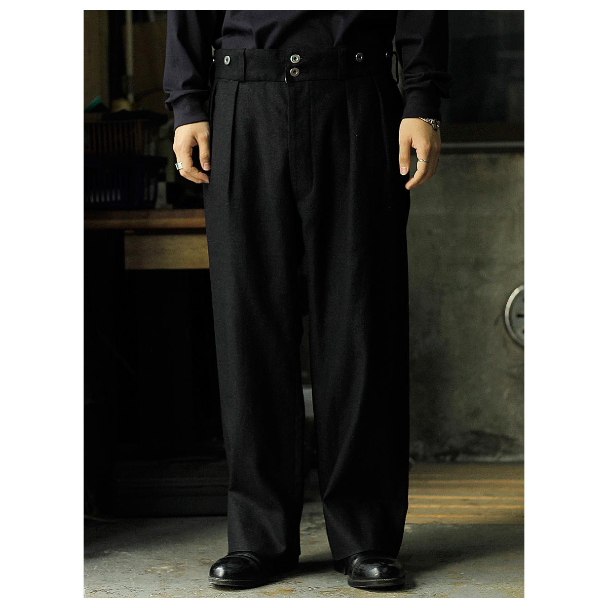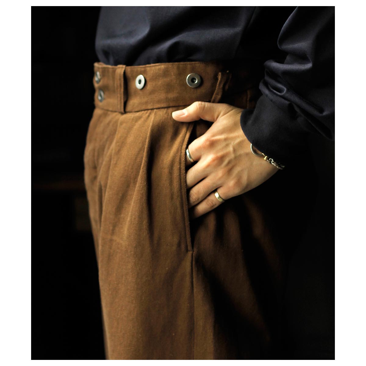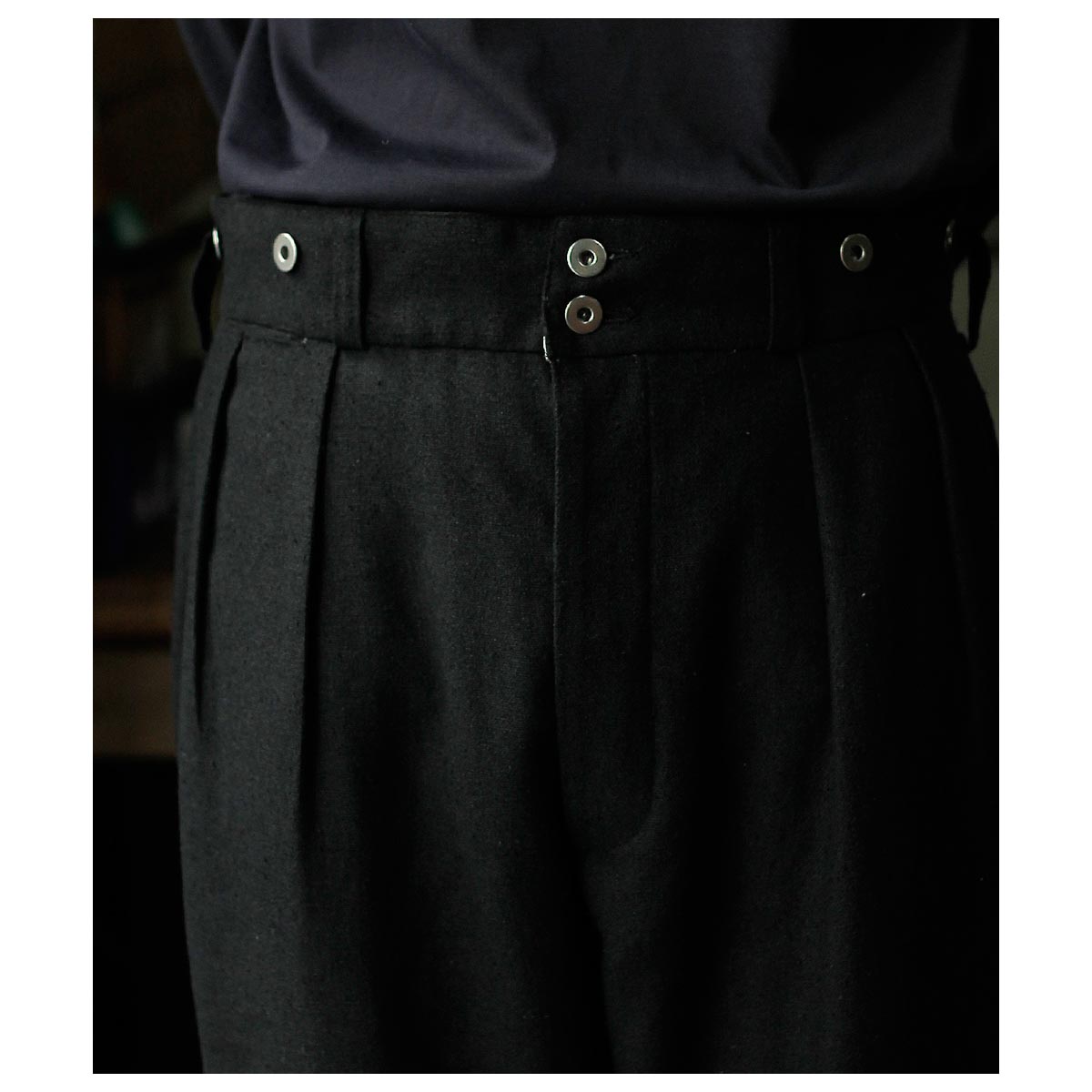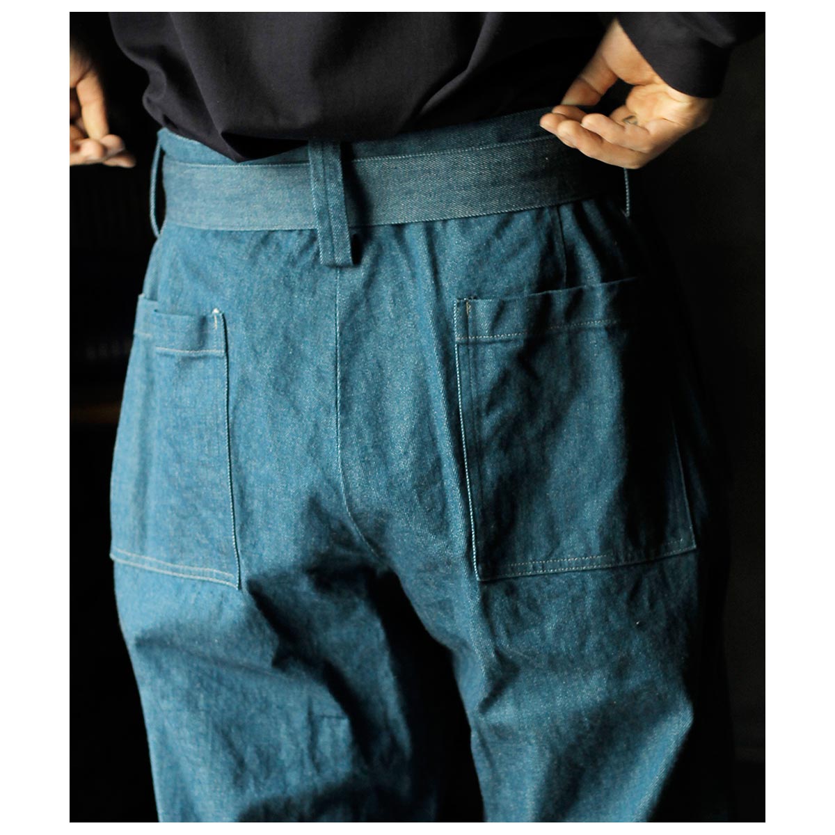 1930年代のフランス軍や民間作業着として使われていたボージョンパンツをベースに製作。オリジナルにはないベルトループを加えてタウンユースに対応し、後ろのシンチバックでサイズ調整も可能です。