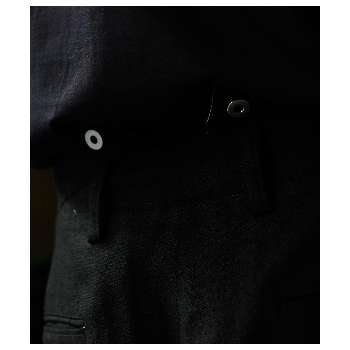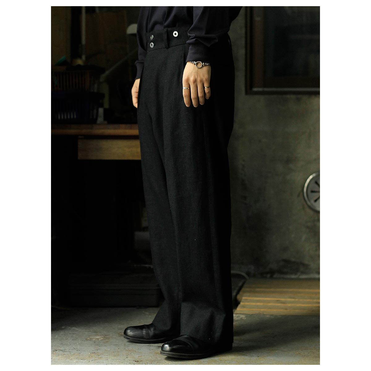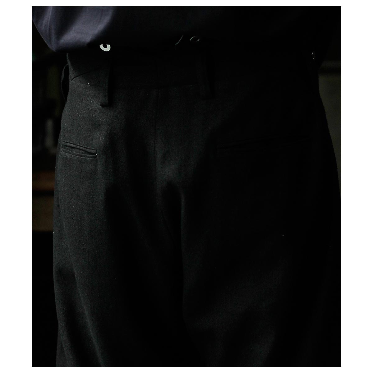 股下の特徴的なディテールやリネンの腰裏・スレキなど当時の雰囲気を忠実に再現。サイド+コインポケット、両玉縁のバックポケットを装備し、別注の鉄ボタンとバックルを採用。腰回りはすっきりとしながら、ももから裾にかけてゆったりとしたワイドテーパードシルエットが特徴です。
