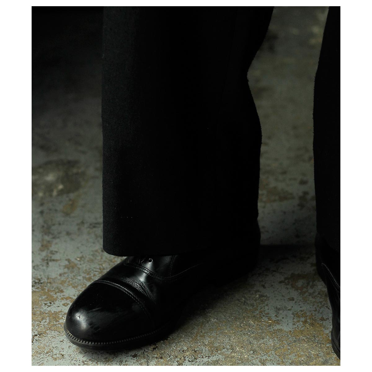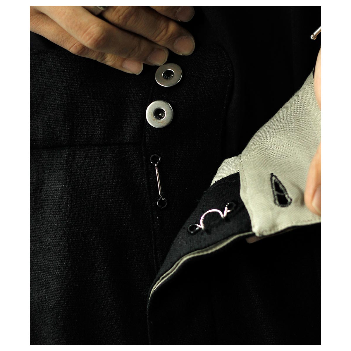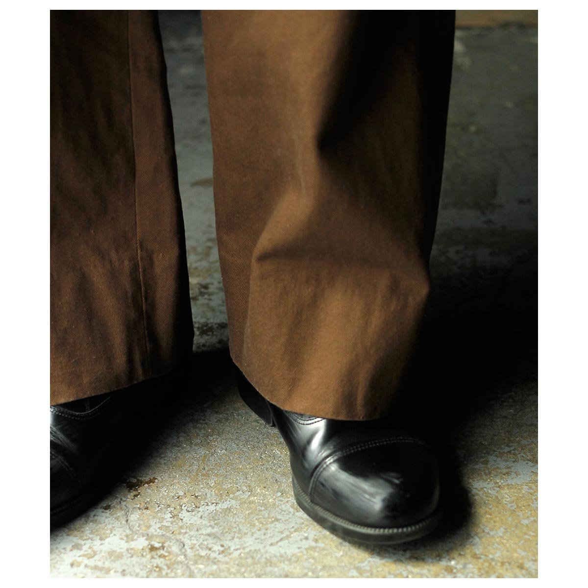 股下の特徴的なディテールやリネンの腰裏・スレキなど当時の雰囲気を忠実に再現。サイド+コインポケット、両玉縁のバックポケットを装備し、別注の鉄ボタンとバックルを採用。腰回りはすっきりとしながら、ももから裾にかけてゆったりとしたワイドテーパードシルエットが特徴です。