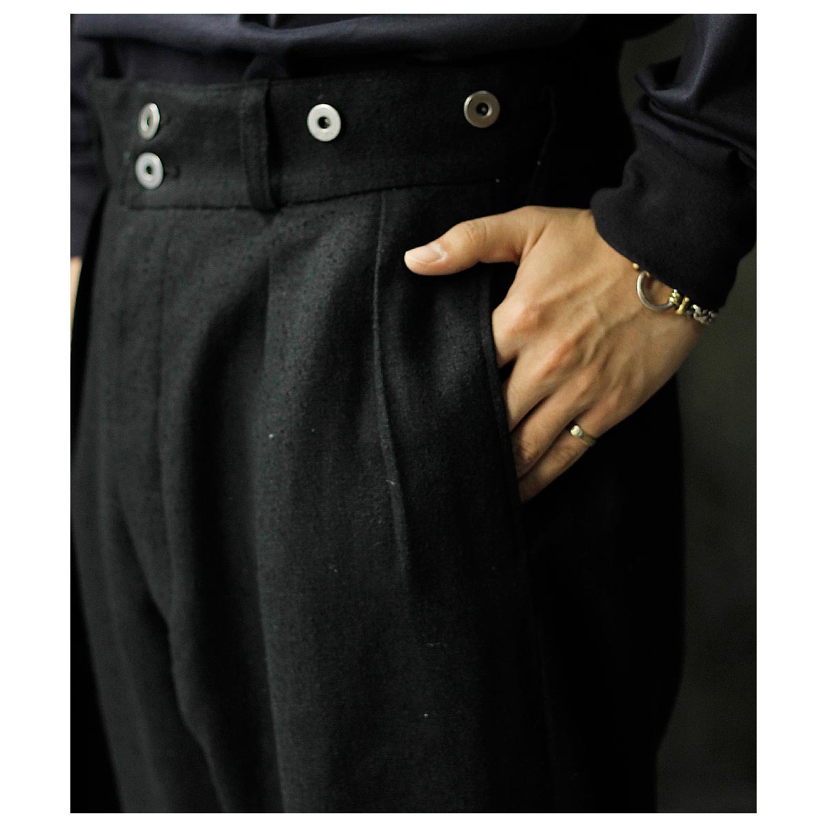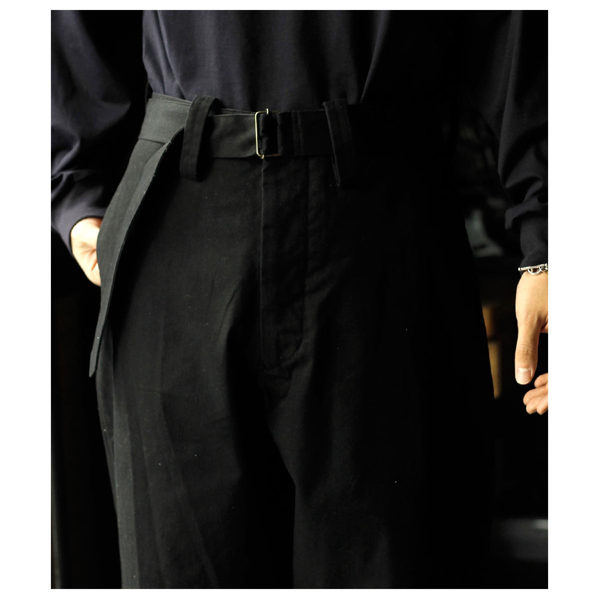 フレンチモーターサイクルパンツからインスピレーションを得た、共地ベルト付きのトラウザーズ。 元々オーバーパンツとして開発されたという同型へのオマージュから、ベルトを絞って着用できるように他モデルよりやや大き目に仕立ています。 たっぷりとしたシルエットと十分な長さのレングスで、生地の魅力を存分に味わってもらいたいパンツです。ヴィンテージにならったバックル付きのベルトの他、前立てホックとメタルボタンも再 現しました。