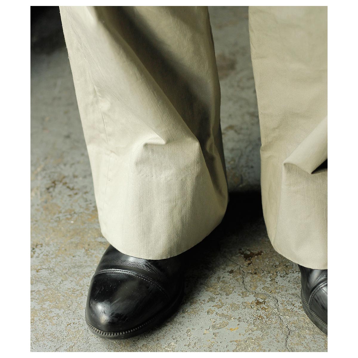 ボリューム感のある綿糸を使用し、ざっくりとした表情に織り上げた綾織のチノ生地。生地の状態で洗い加工を施すことで、ヴィンテージのようなこなれた風合いを表現しています。 さらに製品に洗いをかけ、パッカリングを出しました。