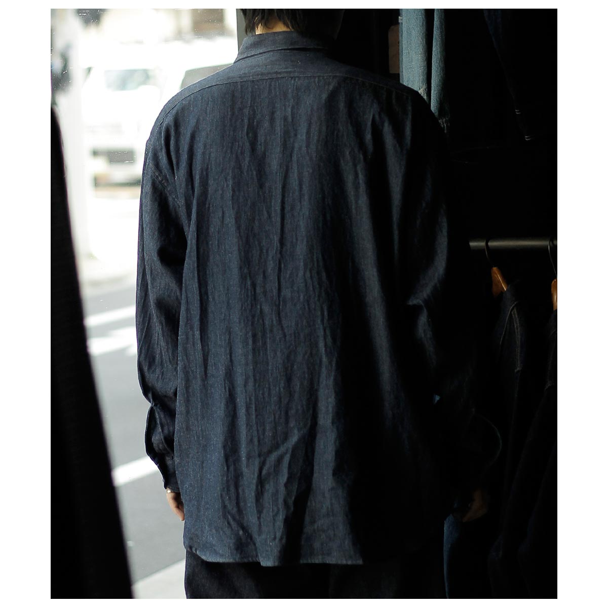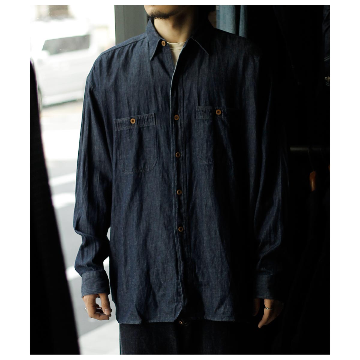1940年代のU.S.NAVYのシャンブレーシャツや50年代のネルシャツなどのワークシャツをベースに、身幅を大幅にサイズアップすることで元々の縦長のフォルムから大きく変化を持たせたハイパービッグのミリタリーワークシャツ。