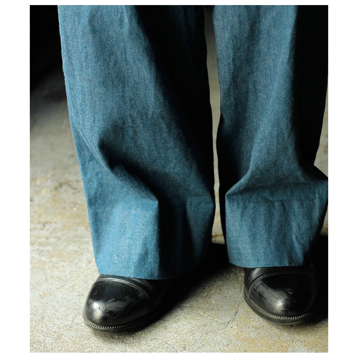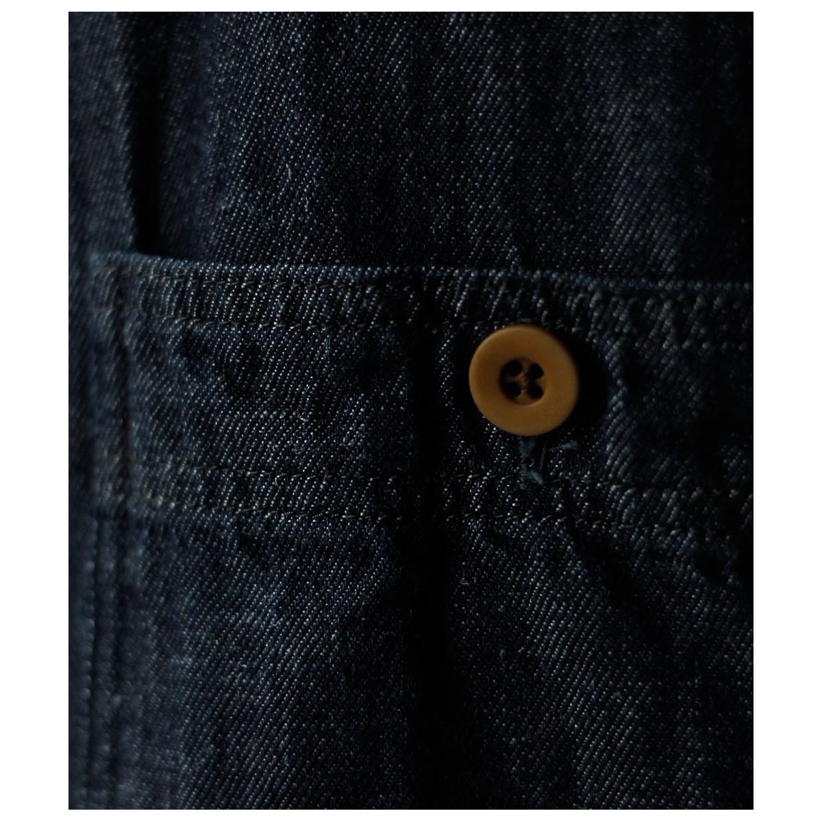 経糸にやや細目の糸をたてることでほどよい軽さを出した、約10ozのミドルウェイトセルビッジデニム生地。1890~1920年頃のアメリカンワークウエアを想起させる独特な浅めのブルーは、通常のインディゴやブラックデニムとに比べ色出しや色の均一性を保つことが難しいとされており、国内老舗機屋の熟練の技術が反映されています。