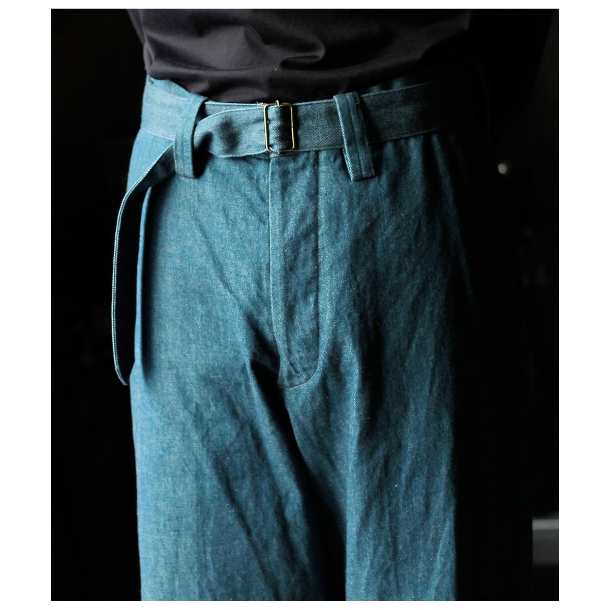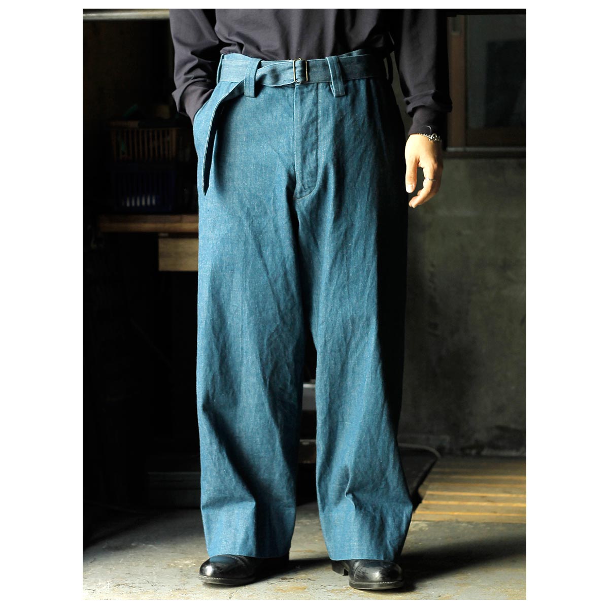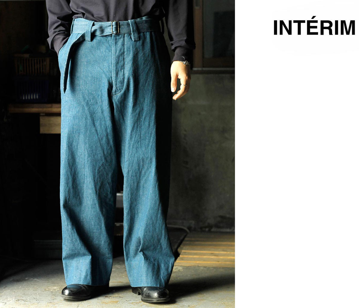 インテリム INTERIM ブルー シャトル デニム ベルテッド フレンチ アーミー ミル バギー トラウザー BLUE SHUTTLE DENIM BELTED FRENCH ARMY MIL BAGGY TROUSER (IT26S101)