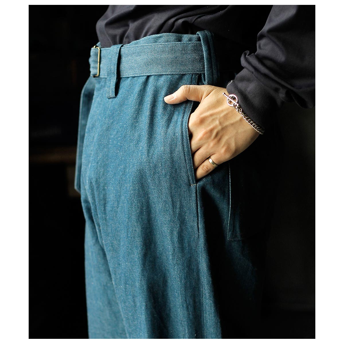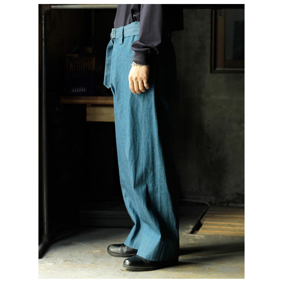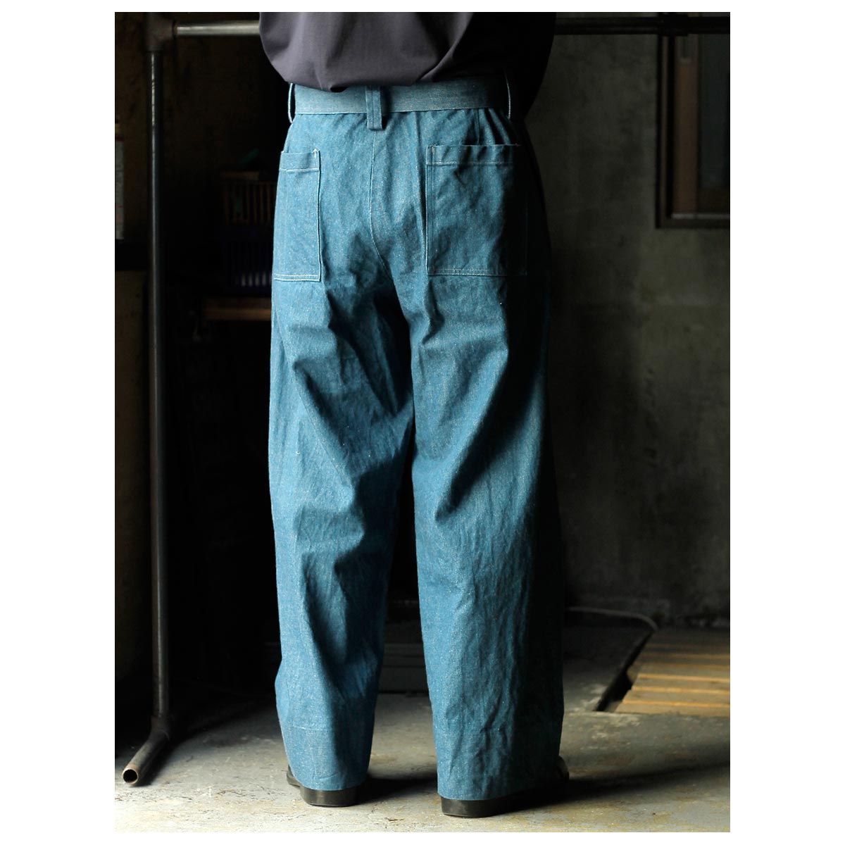 インテリム INTERIM ブルー シャトル デニム ベルテッド フレンチ アーミー ミル バギー トラウザー BLUE SHUTTLE DENIM BELTED FRENCH ARMY MIL BAGGY TROUSER (IT26S101)